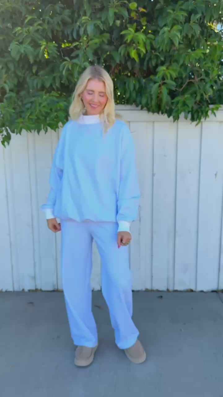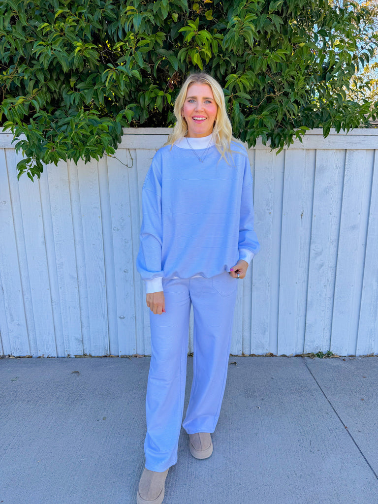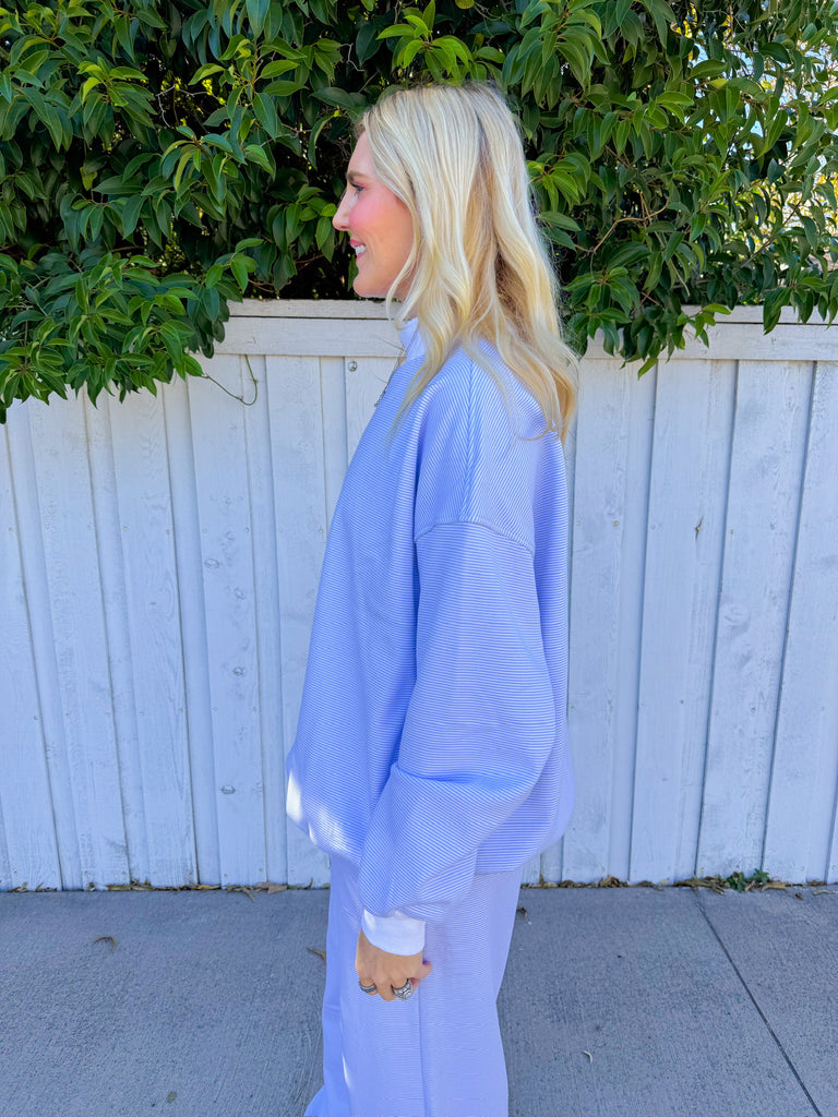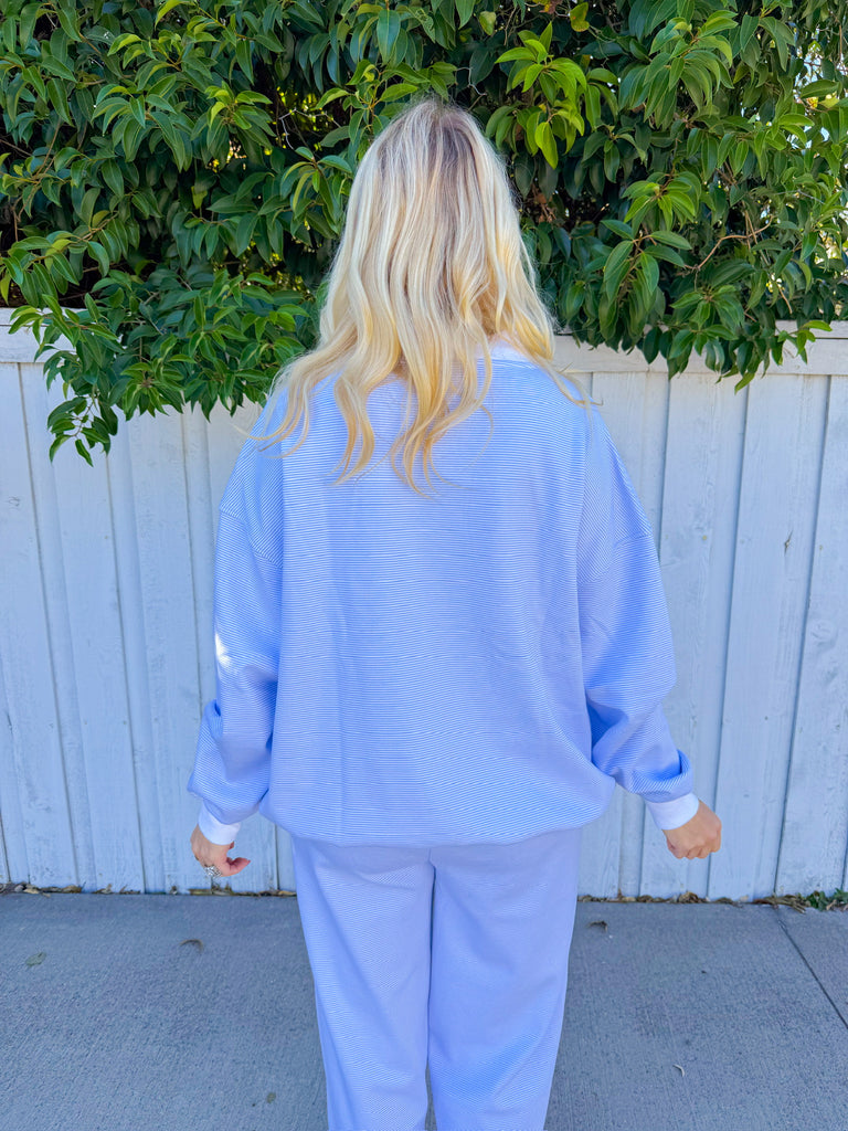 Striped perfection meets cozy comfort in this blue and white mock neck sweatshirt.