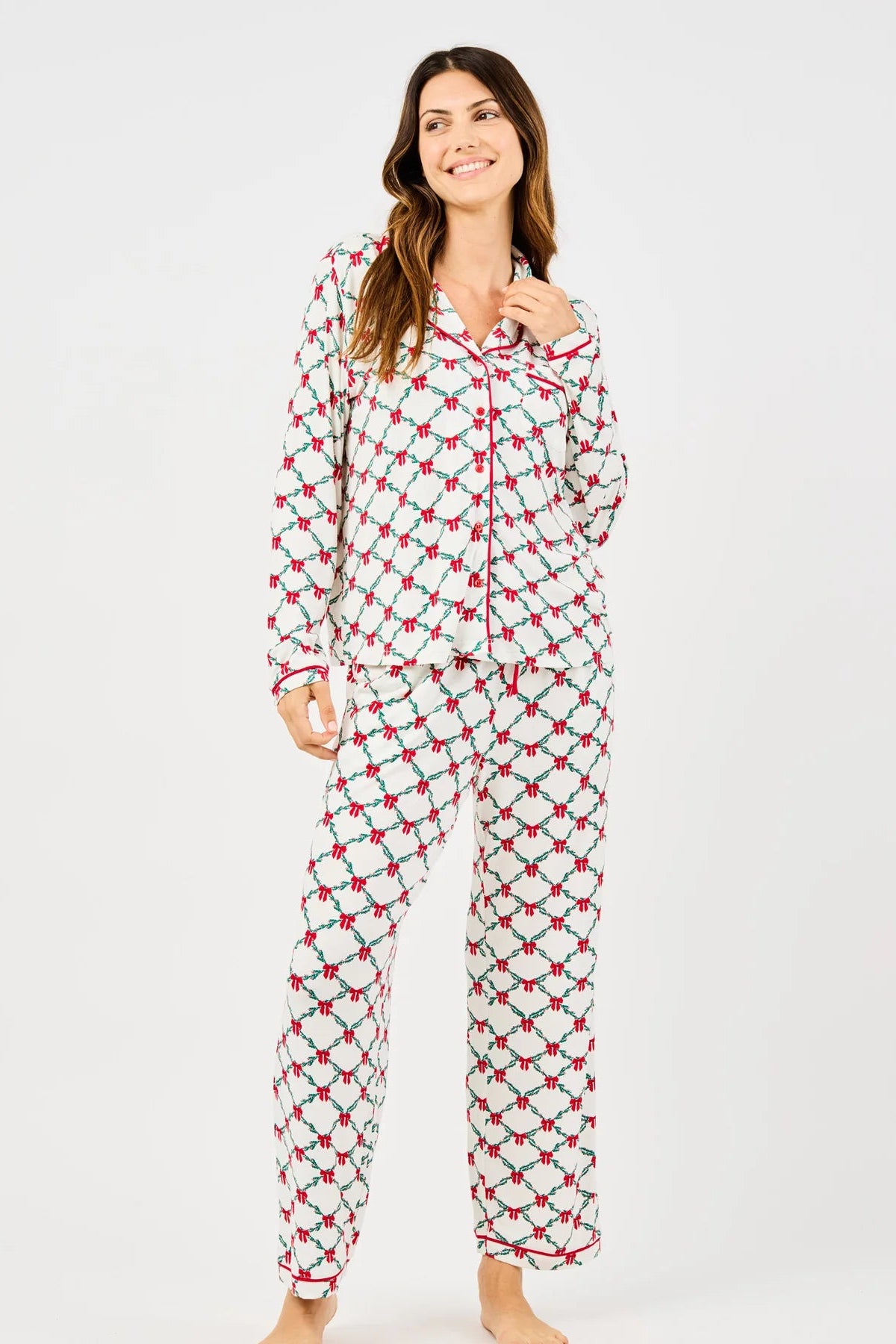 Introducing our Holiday Charlotte Pajama Set, where comfort meets festive charm. Perfect for sipping cocoa by the tree or enjoying Christmas morning in cozy style, this pajama set brings holiday cheer to every moment. Featuring a long-sleeve button-front top with a classic collar and straight-leg pants with an adjustable drawstring, our Charlotte Pajama Set combines classic holiday style with all-day comfort.