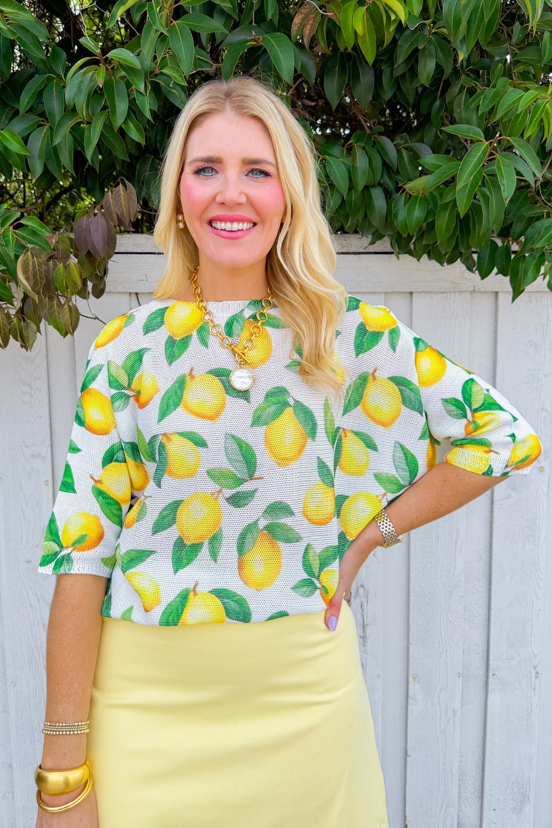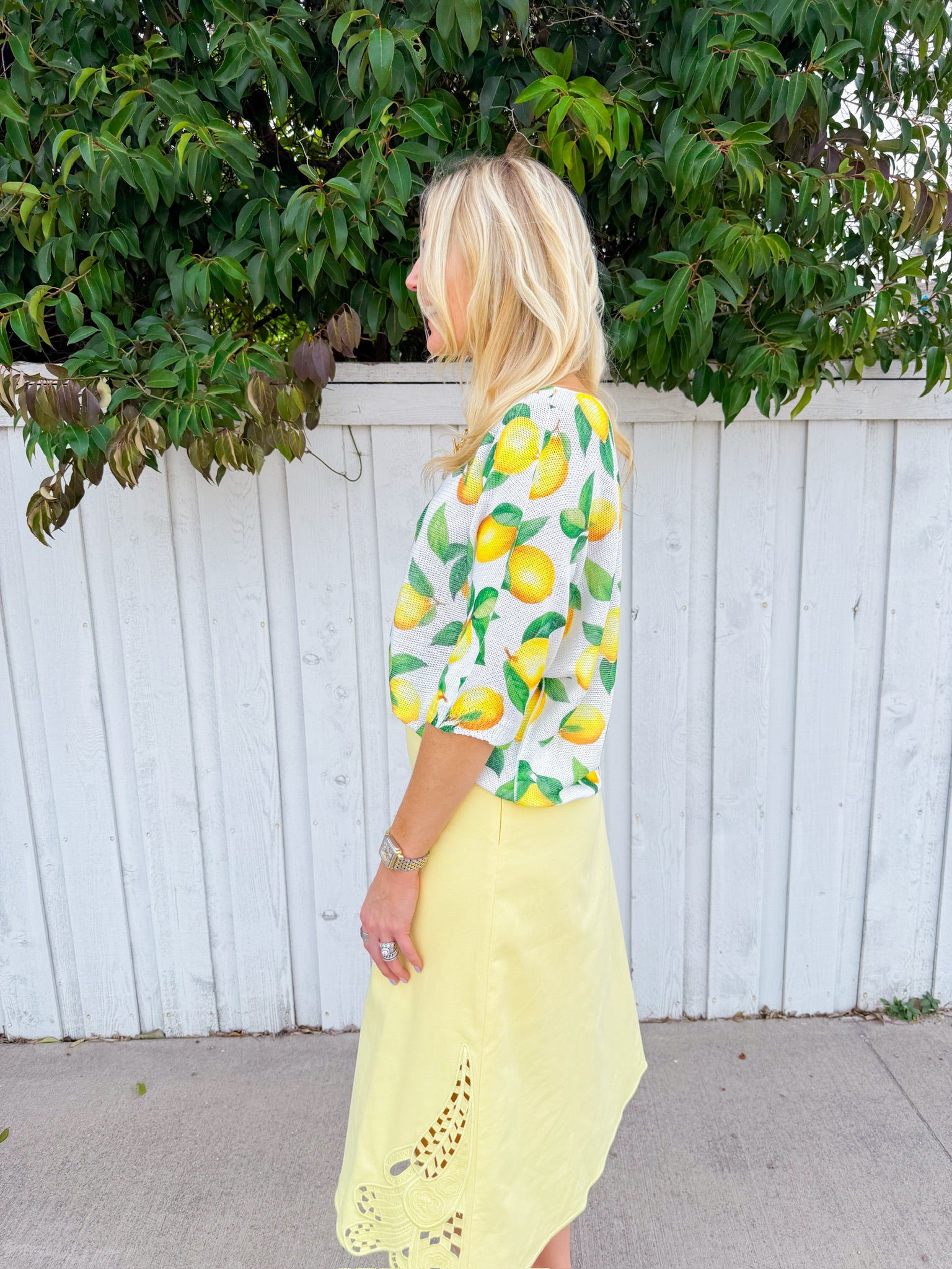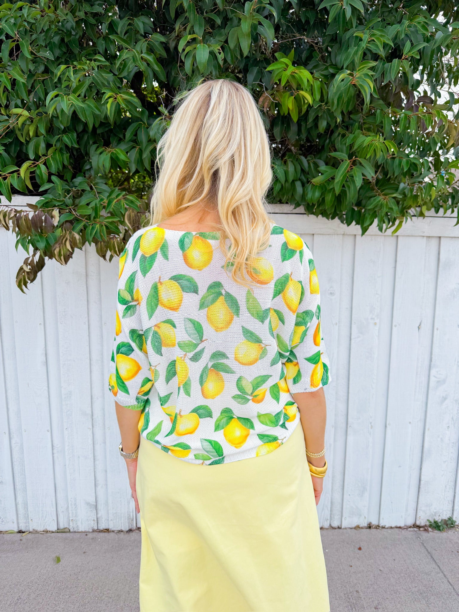 Brighten your wardrobe with this cheerful white sweater featuring scattered lemon prints throughout.