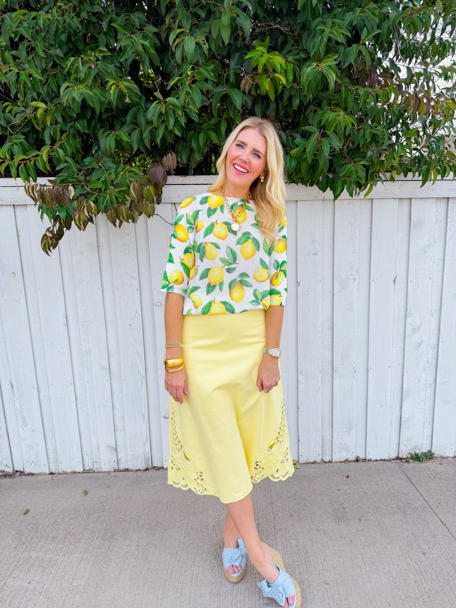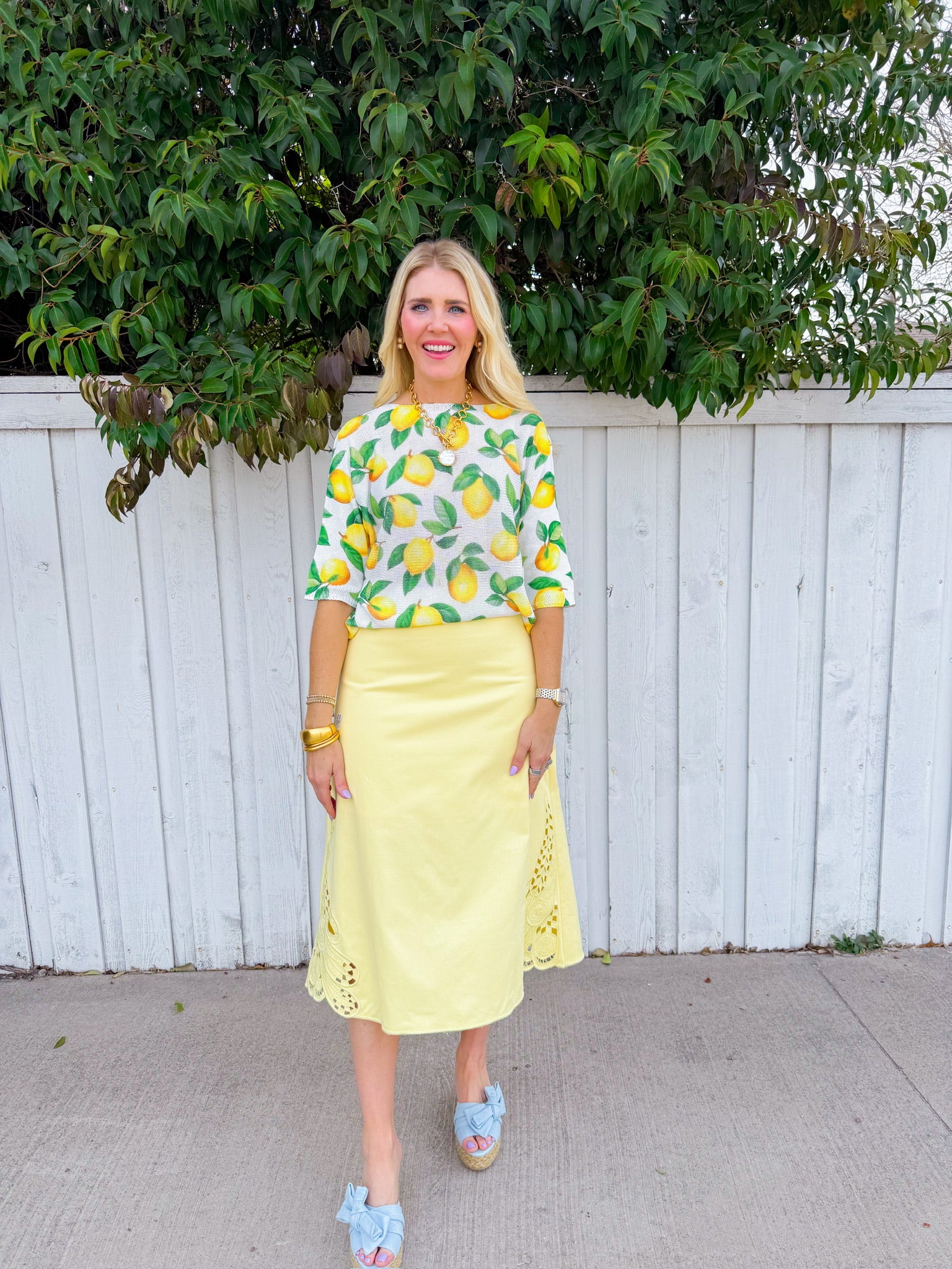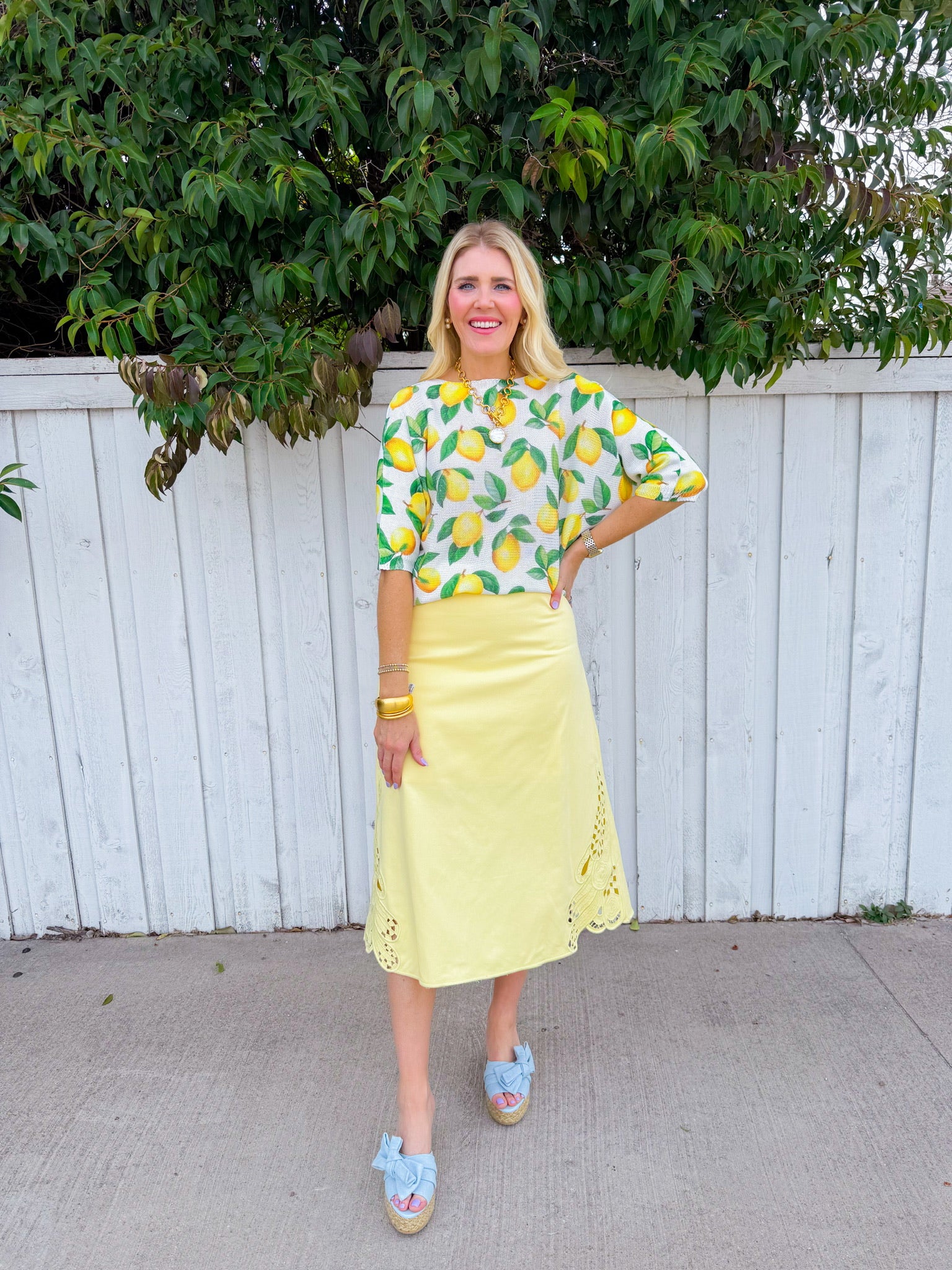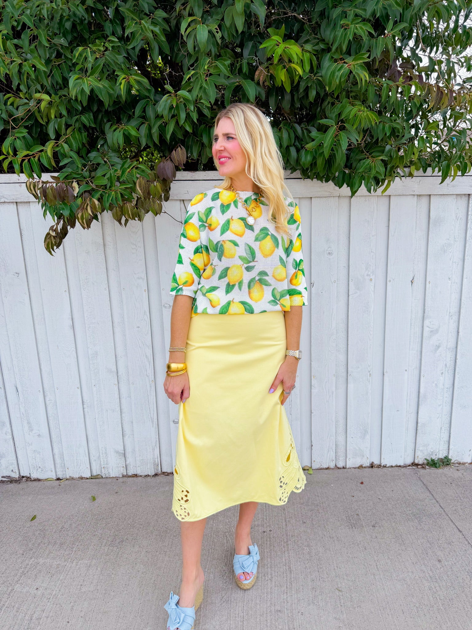 Brighten your wardrobe with this cheerful white sweater featuring scattered lemon prints throughout.