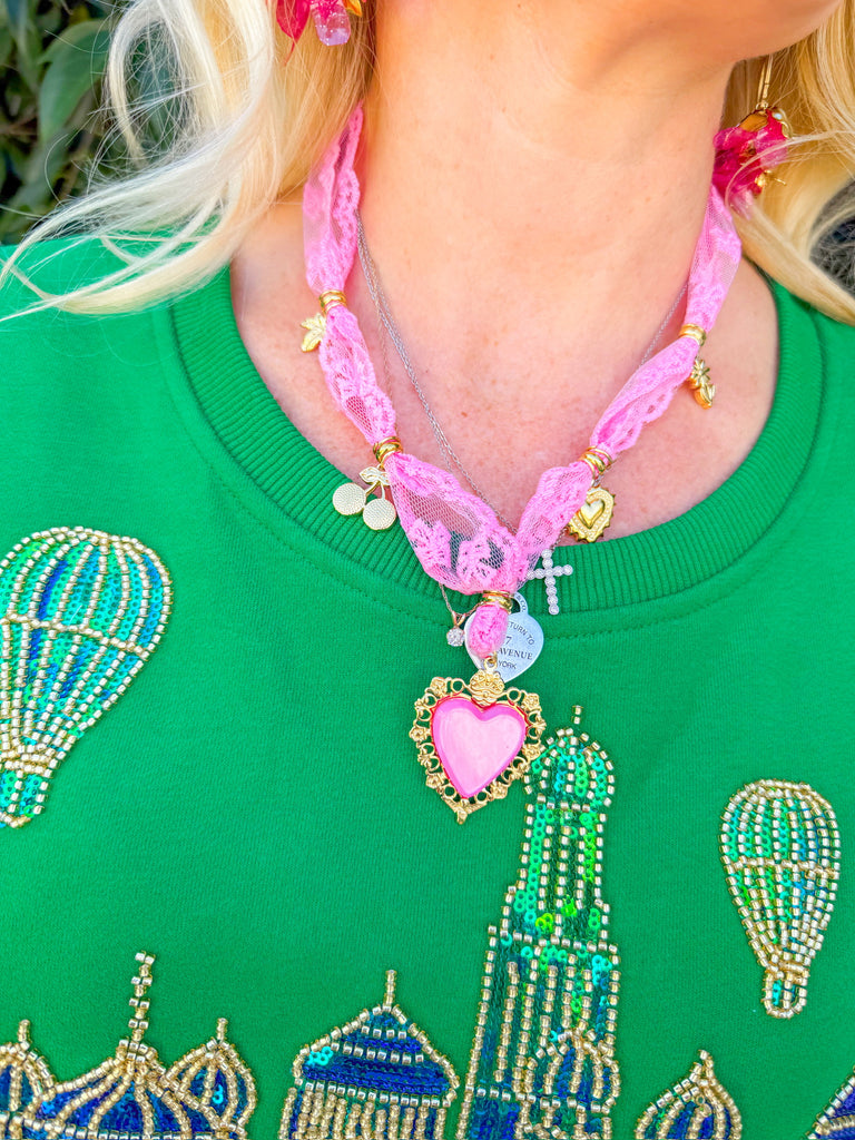 Make room for a little Oz magic—this emerald crewneck dazzles with a beaded city skyline, hot-air balloons, and poppy details that shimmer every time you move.