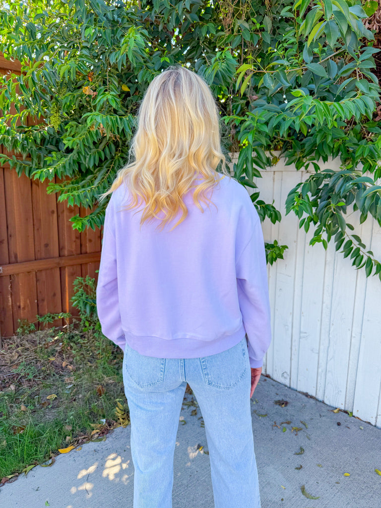 Sweet and spellbound—this lilac crewneck flashes a beaded “WICKED” charm-necklace graphic with tiny Oz icons (ruby heel, lion, emerald city, witch hat… the gang’s all here).