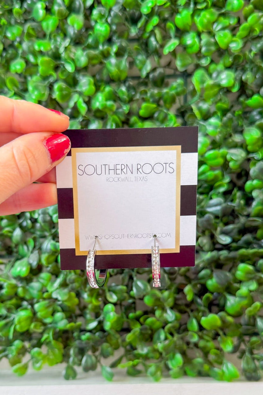 Sparkle and shine with these radiant silver hoops that feature a dazzling rhinestone centerline. Designed to catch every glimmer, they're the perfect accessory for anyone who loves a little extra shimmer with their style.