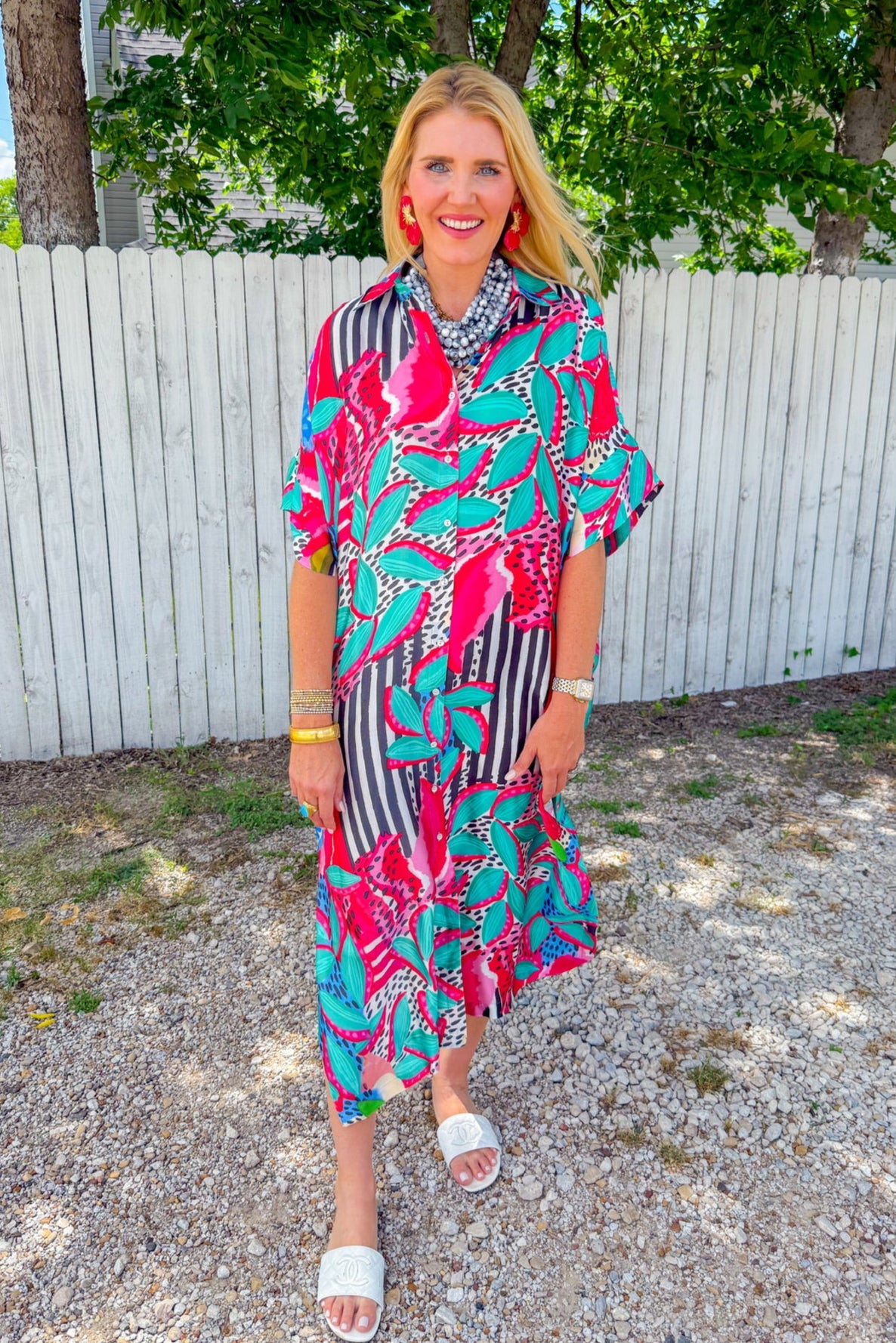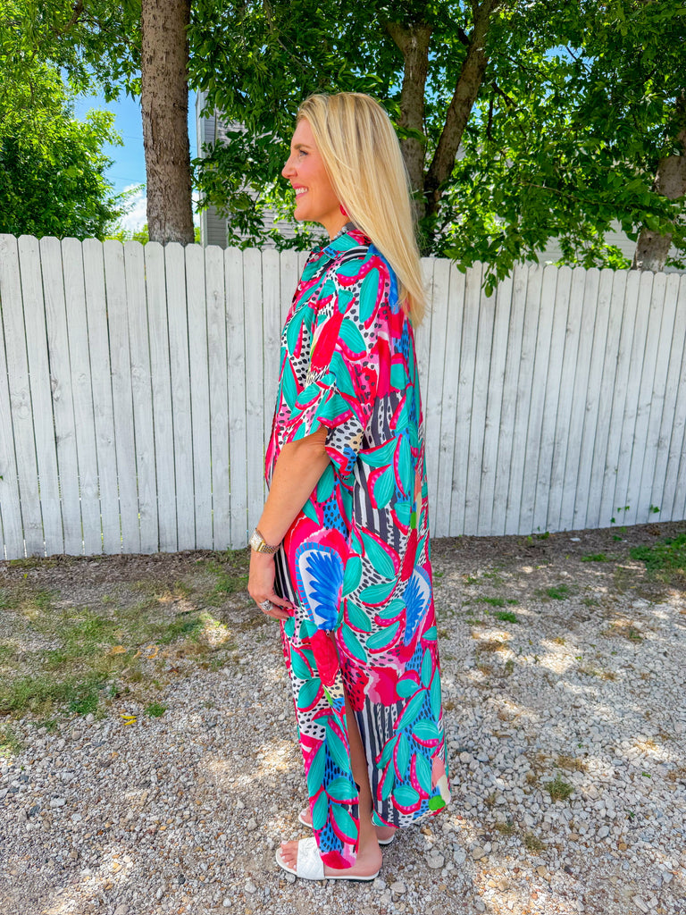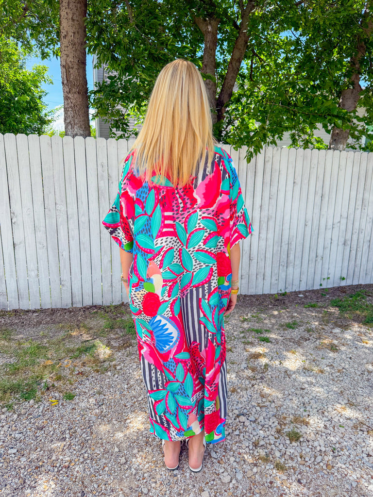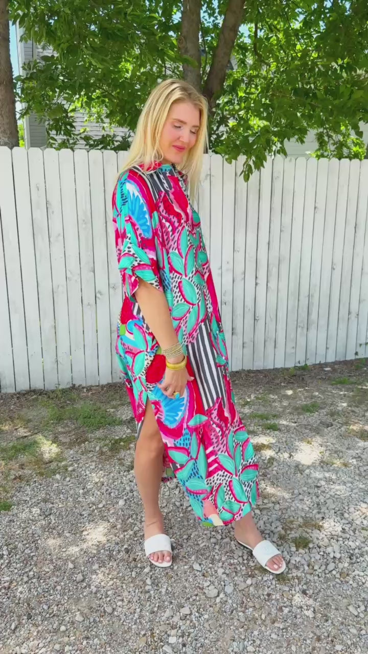 The Lolita Button Down Dress is a walking party of bold stripes, tropical florals, and playful pops of color. Whether you wear it open over a swimsuit or buttoned up with wedges for dinner, it’s an instant statement-maker. It’s giving beach-to-brunch energy with zero effort required.
