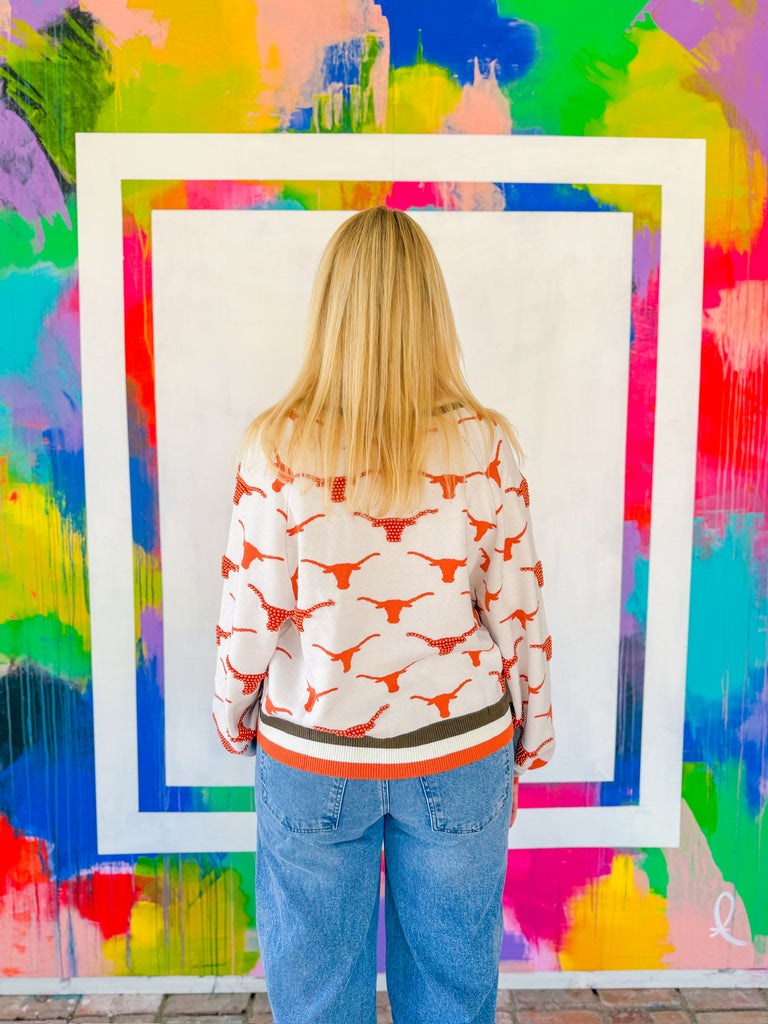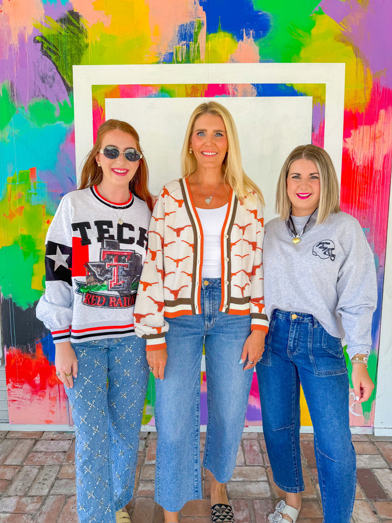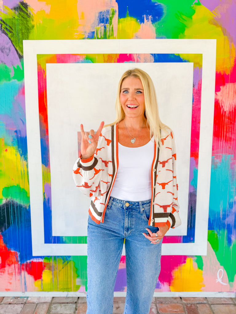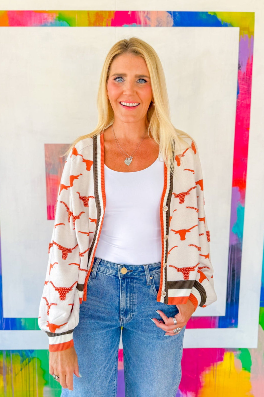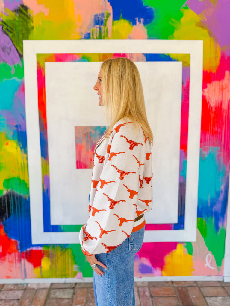 This white and burnt orange cardigan is a total touchdown for any Longhorn fan! Covered in beaded and stitched longhorn silhouettes with varsity-style striped trim, it’s cozy with a side of spirit. Great for any UT Long horn Texas fans! Hook em!