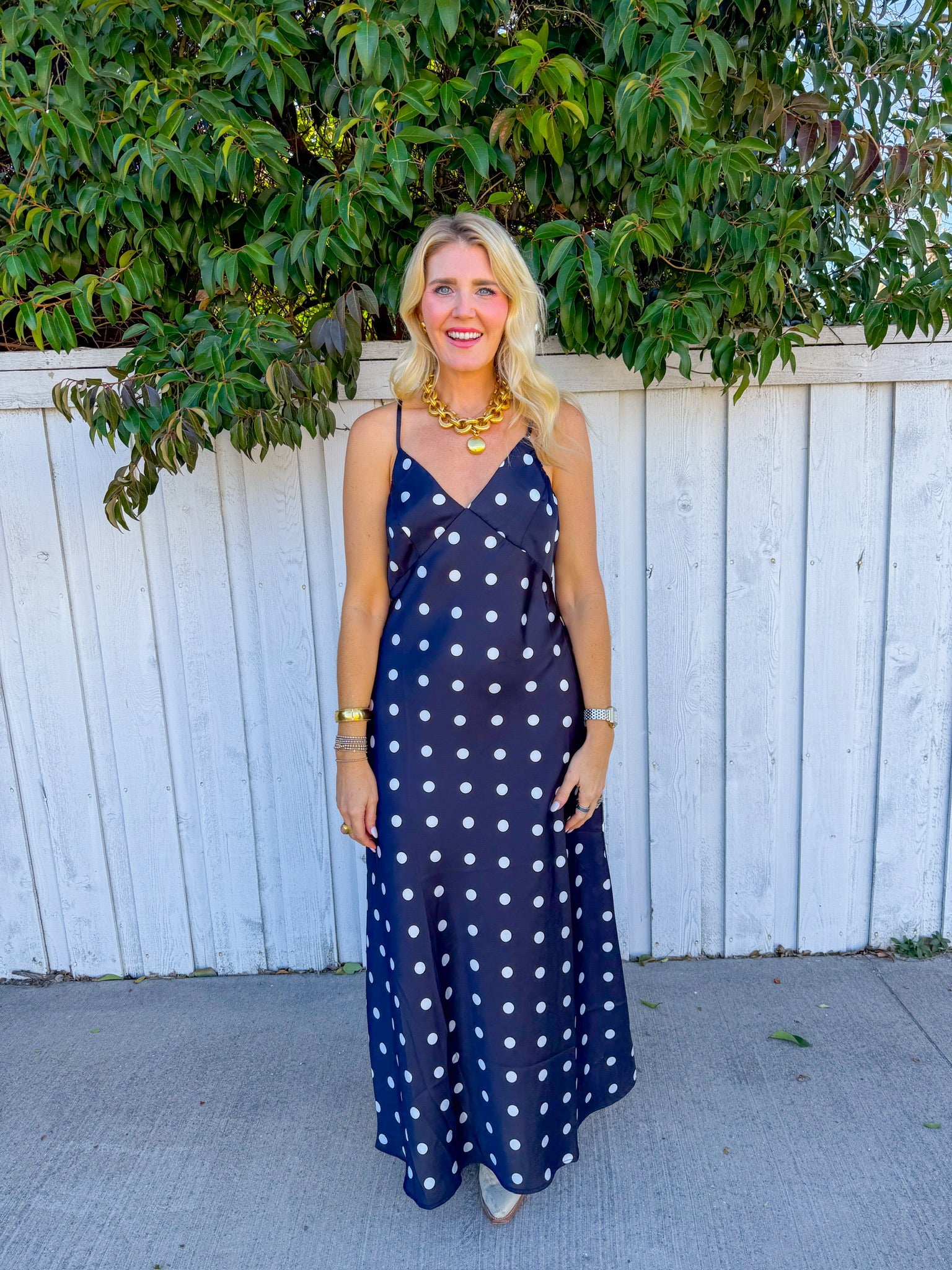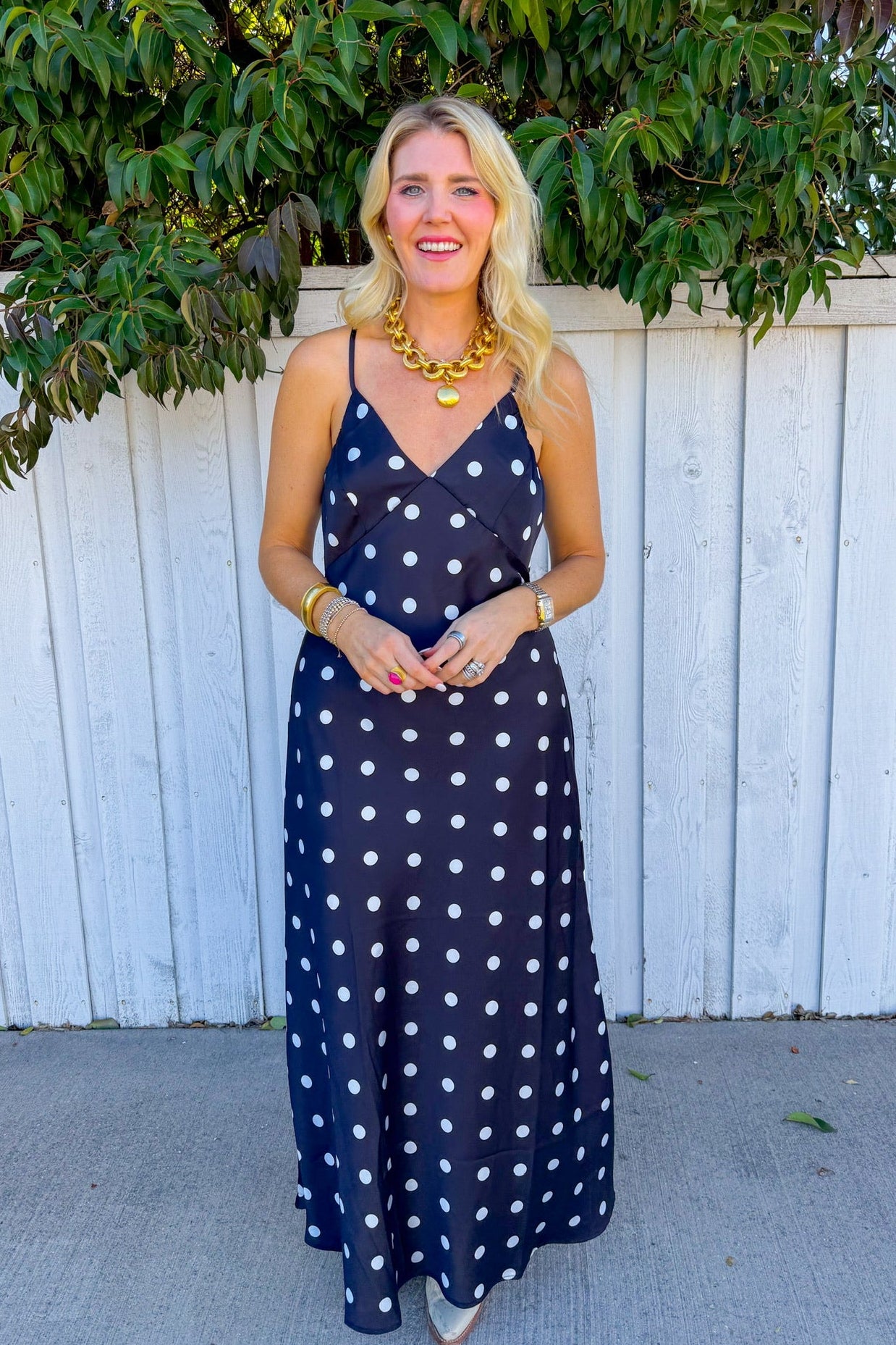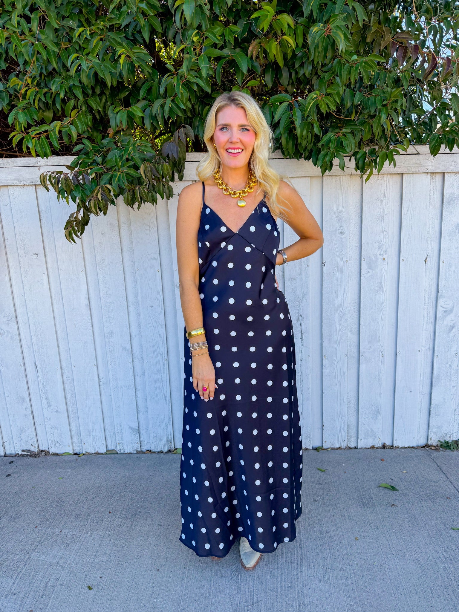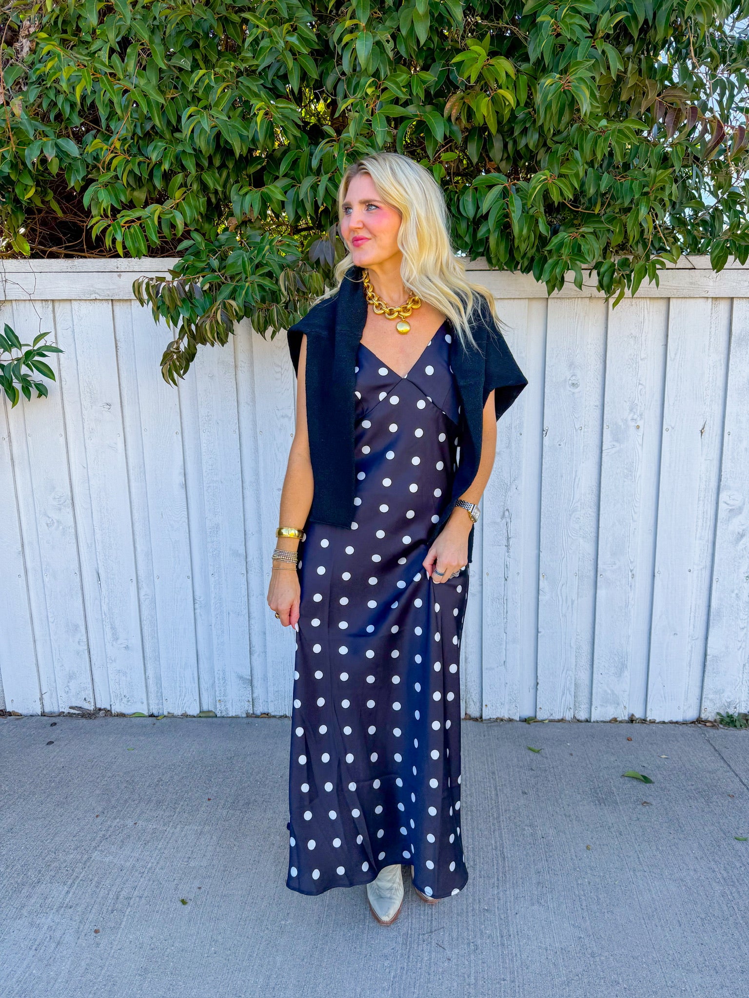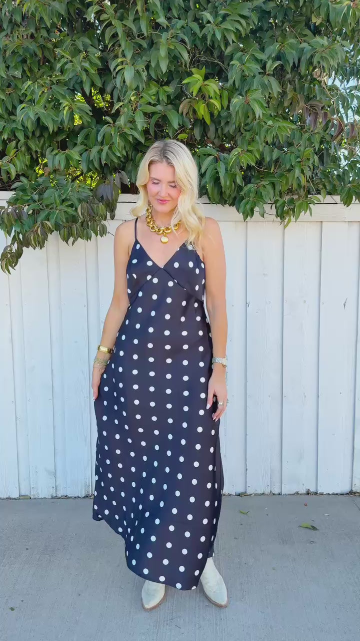 This charming black silhouette features delicate white polka dots that dance across the fabric, creating a timeless look with a modern twist. one irresistible package.