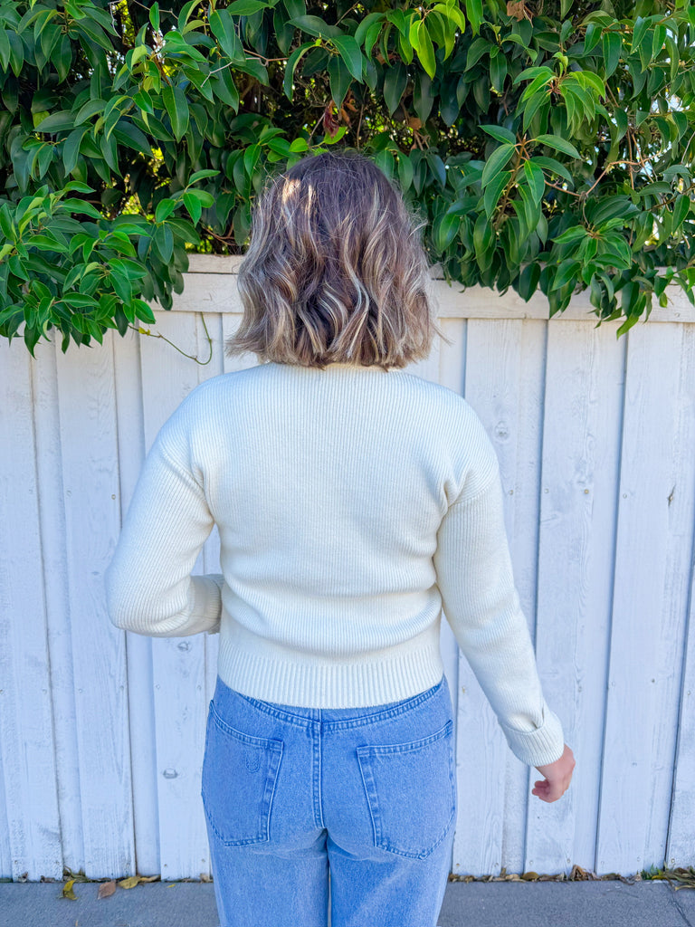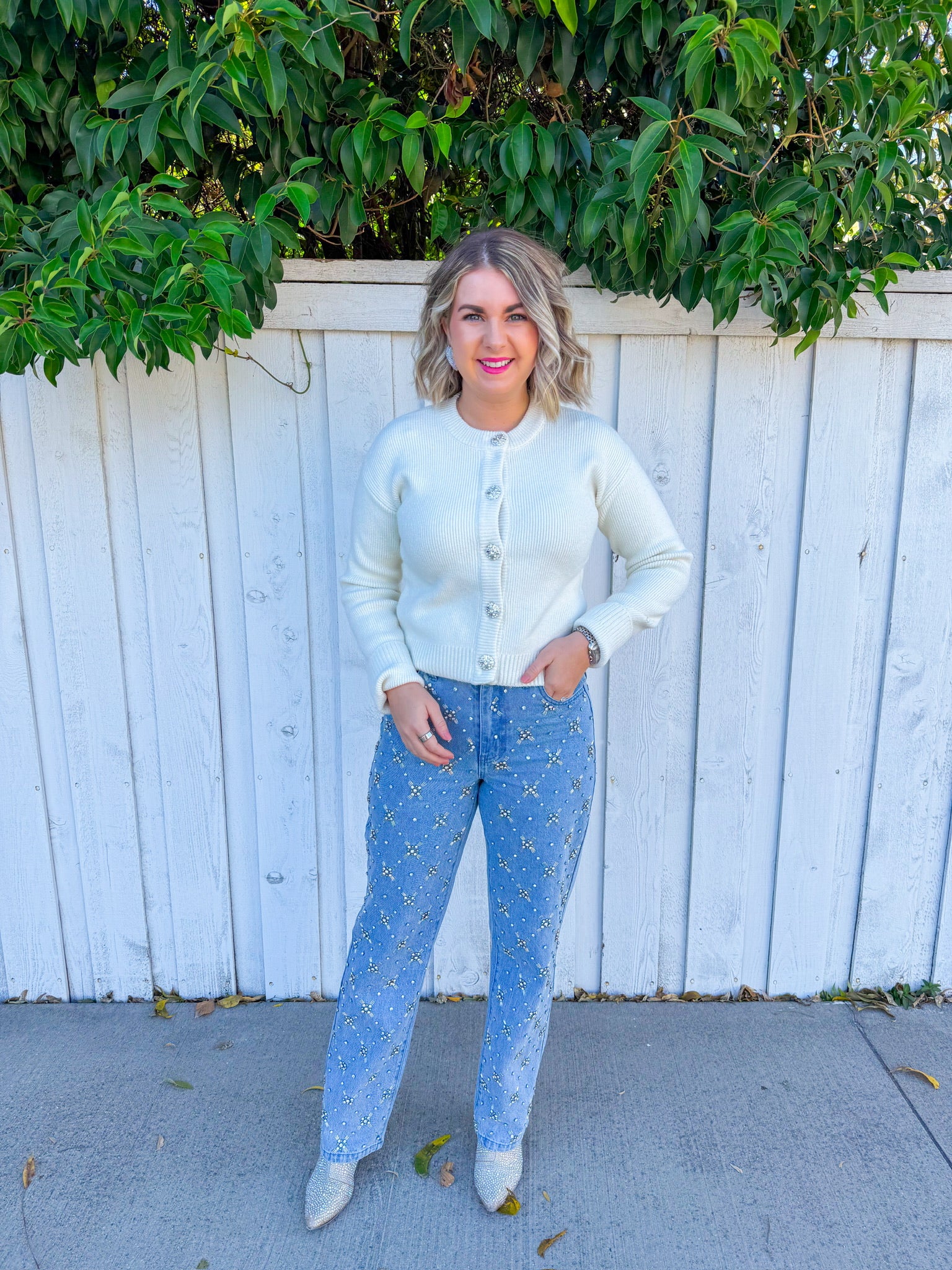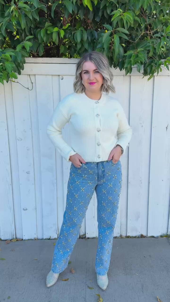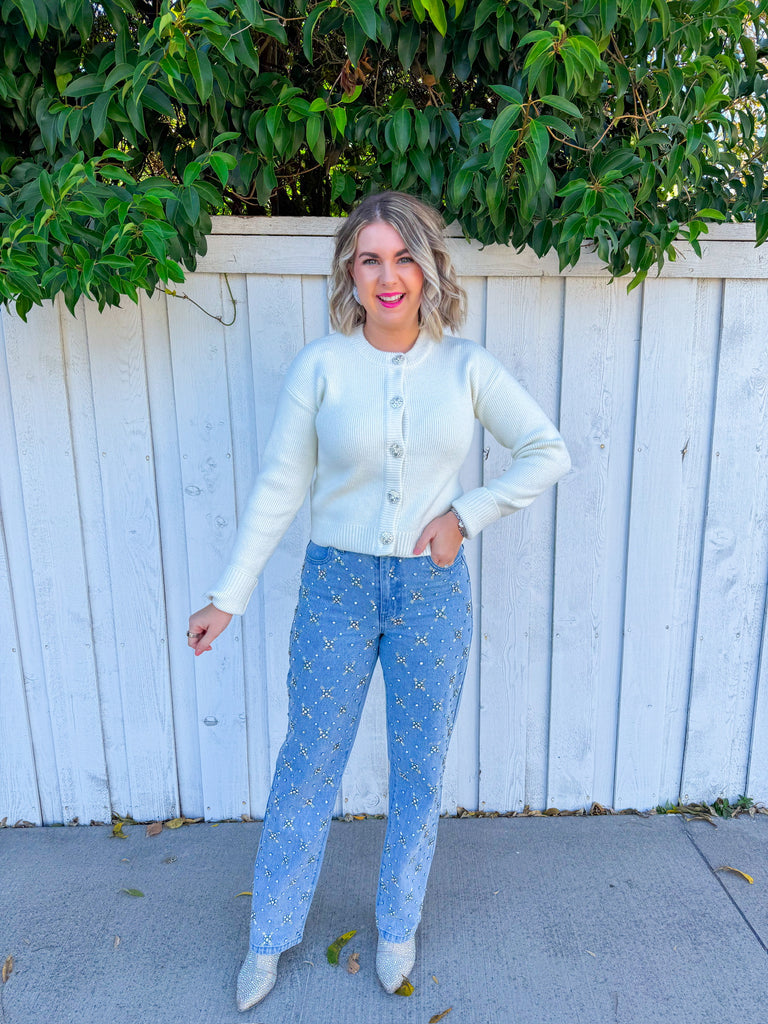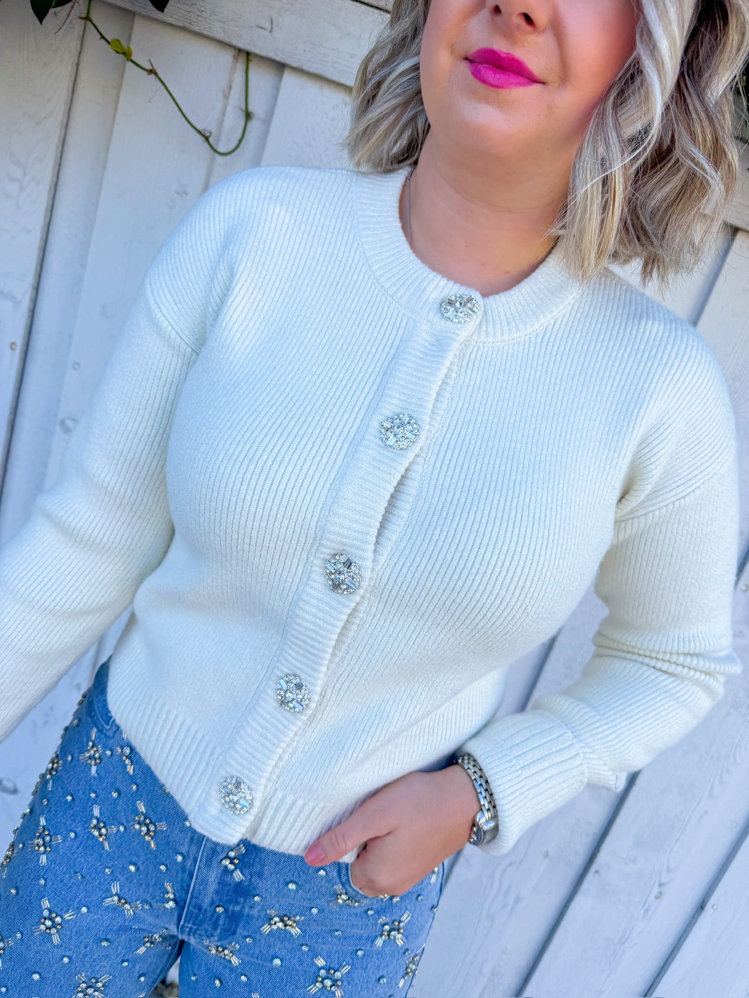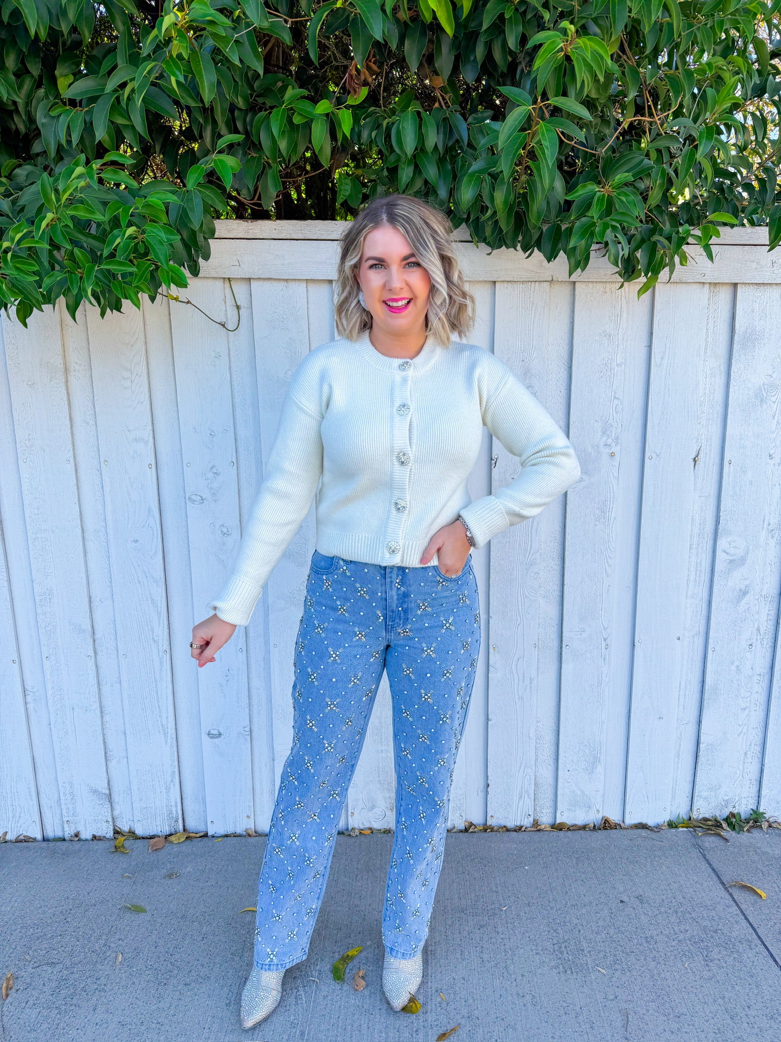 Add a touch of glam to any look with the Maggie Cardigan! This cream knit gets a playful upgrade with rhinestone-encrusted buttons that bring just the right amount of sparkle. Perfect with high-waisted skirts, denim, or layered over a slip dress, it’s the versatile piece that instantly makes any outfit more polished.