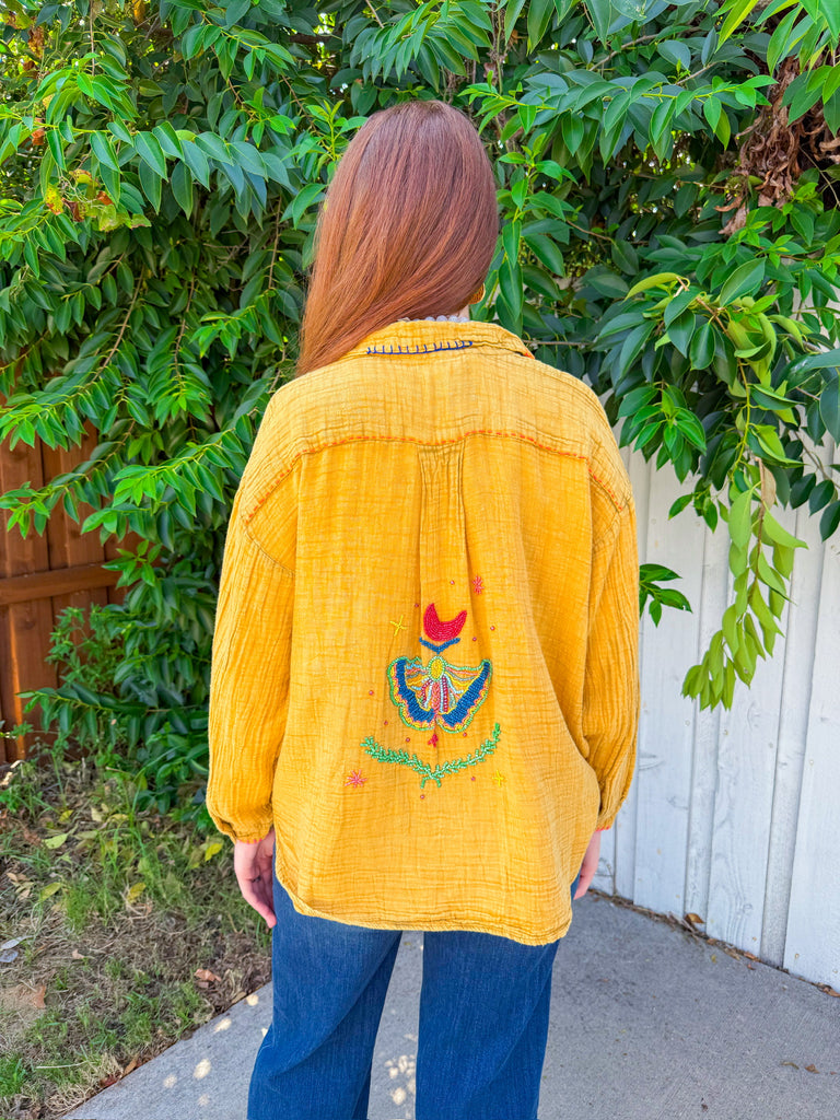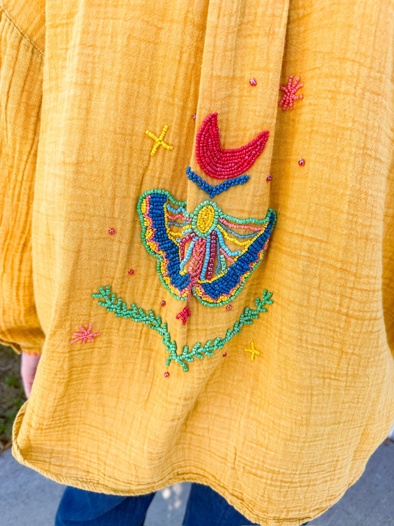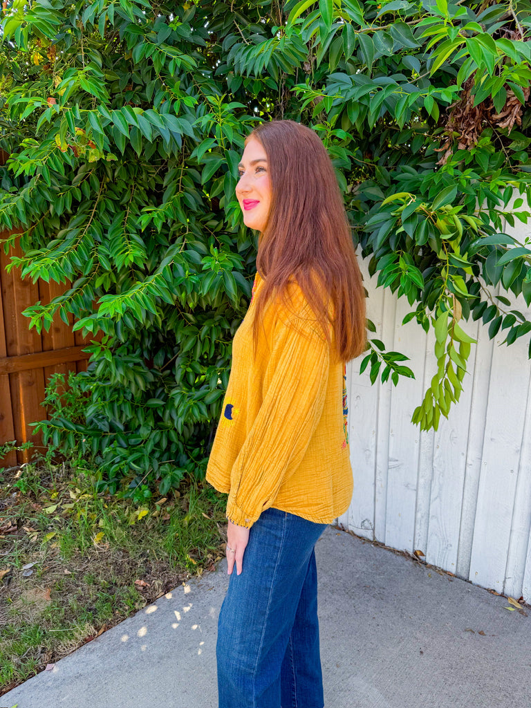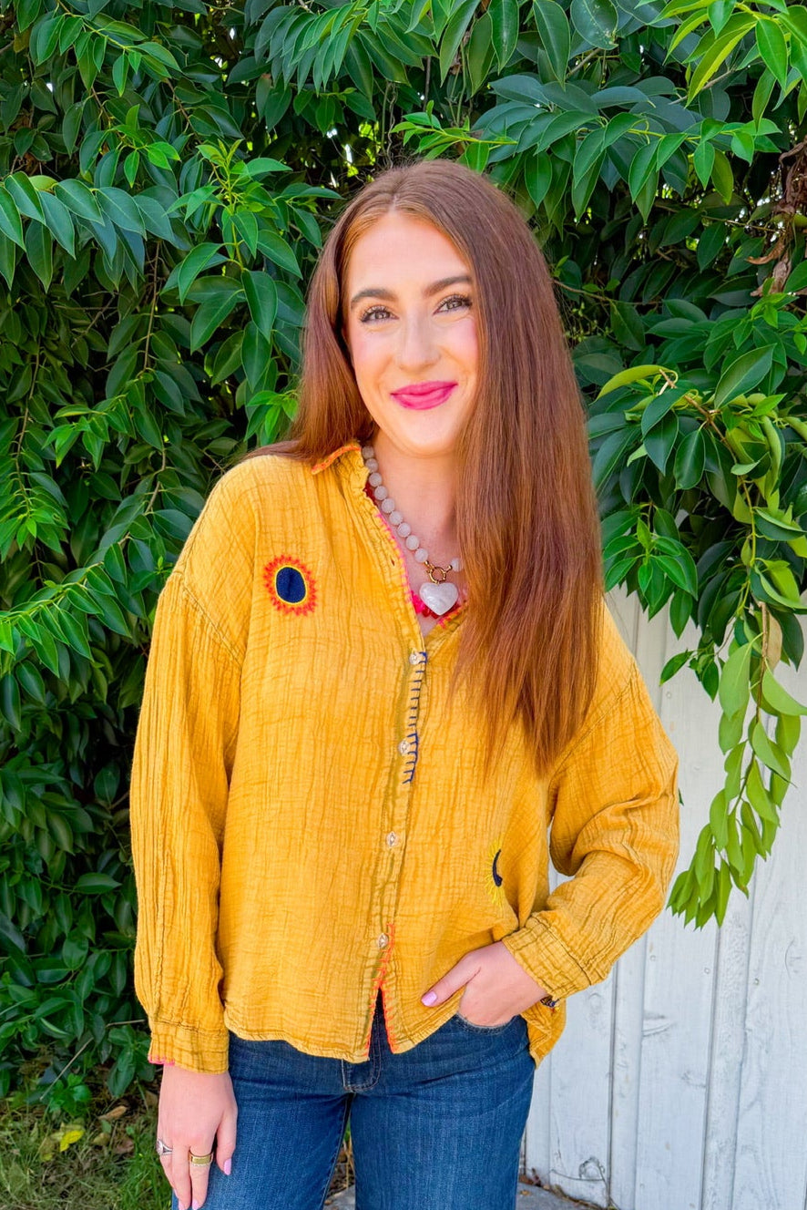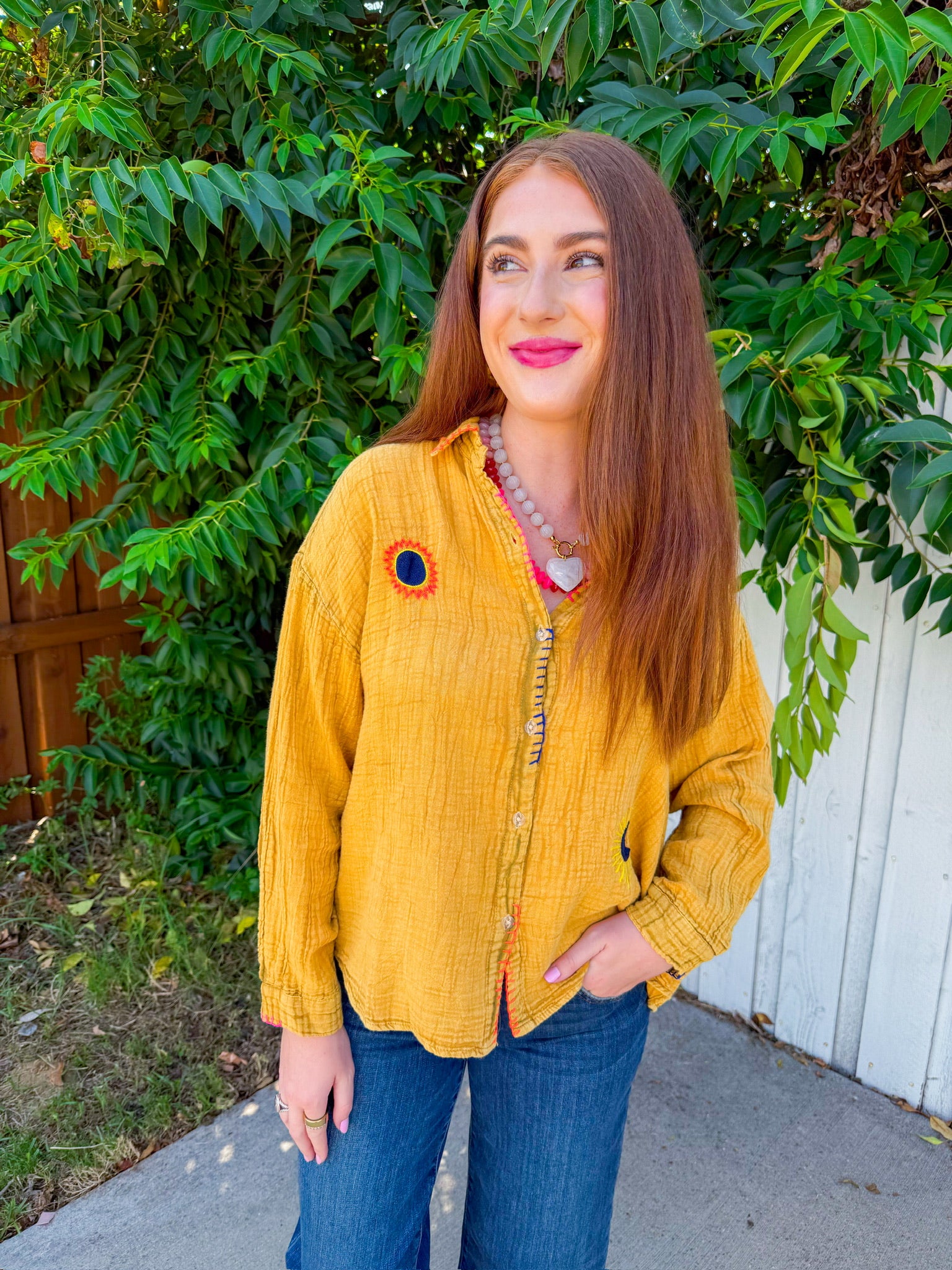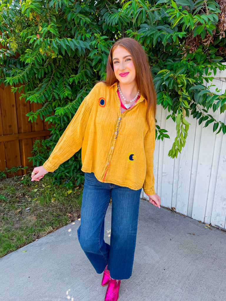 Honey-mustard crinkle-gauze button-down with playful sun-and-moon embroidery, contrast stitching, and an easy relaxed drape. Half-tuck into straight-leg denim with clogs for pumpkin-patch runs, then layer over a striped tee when the breeze rolls in.