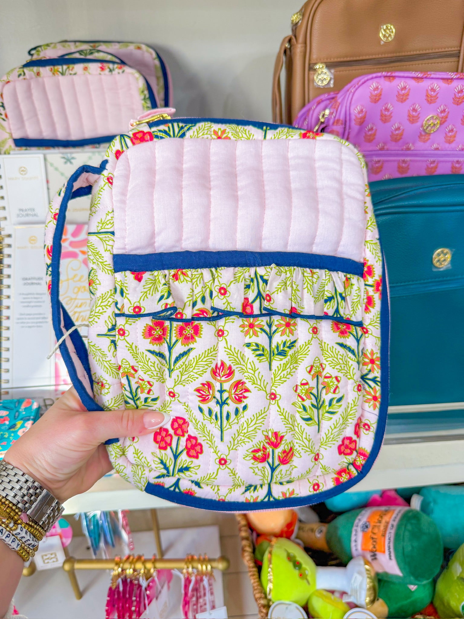 100% Cotton Exclusive Heart of Grace Designs print Quilted exterior with scalloped flap Ruffle-trimmed outer pocket Interior padding for added structure Top carry handle Signature logo label Designed in Georgia Ships from the USA Measurements: 8” H x 10” W x 2” D