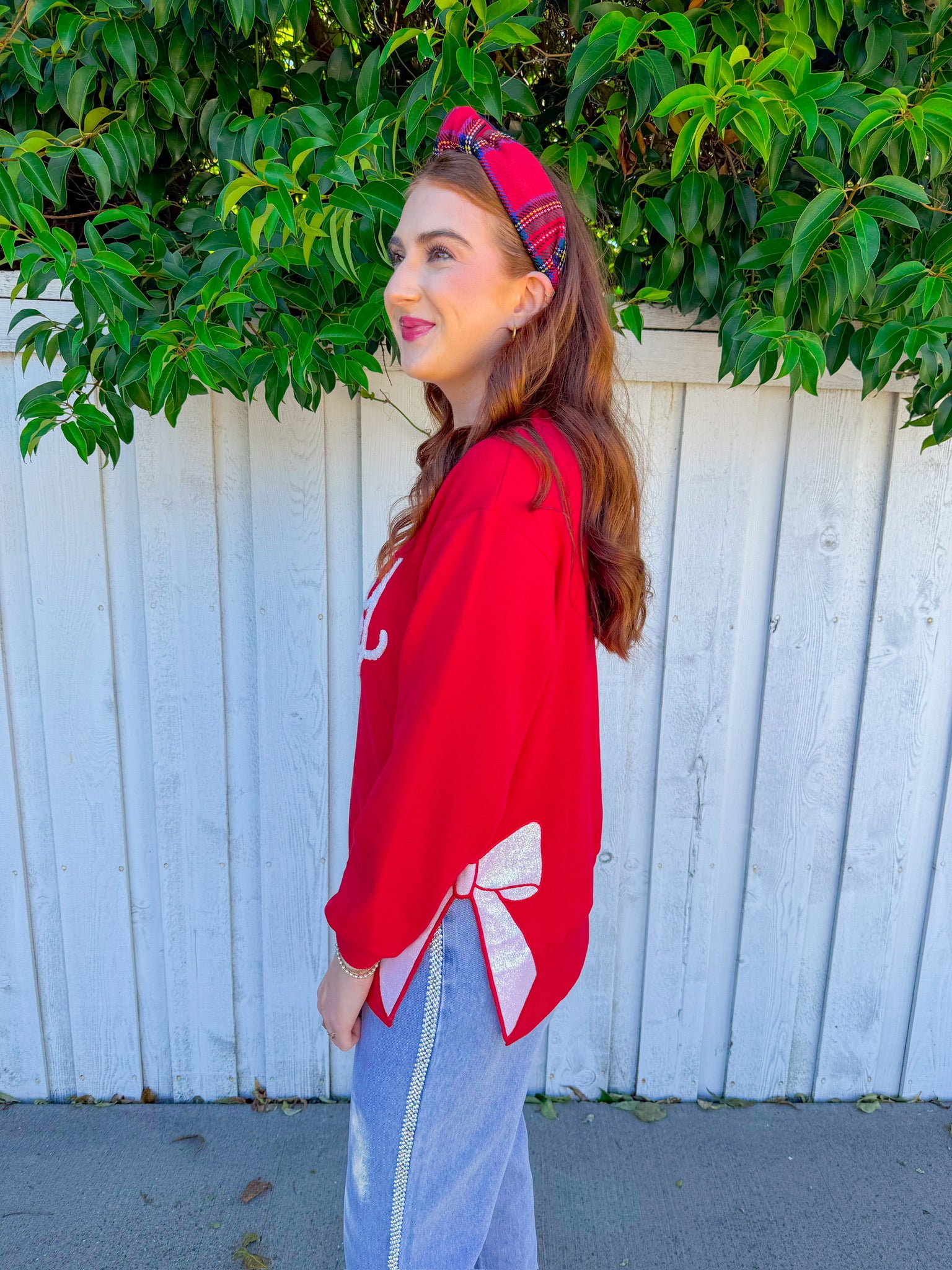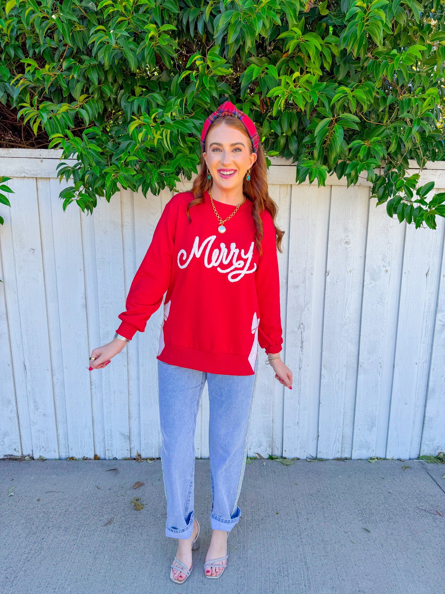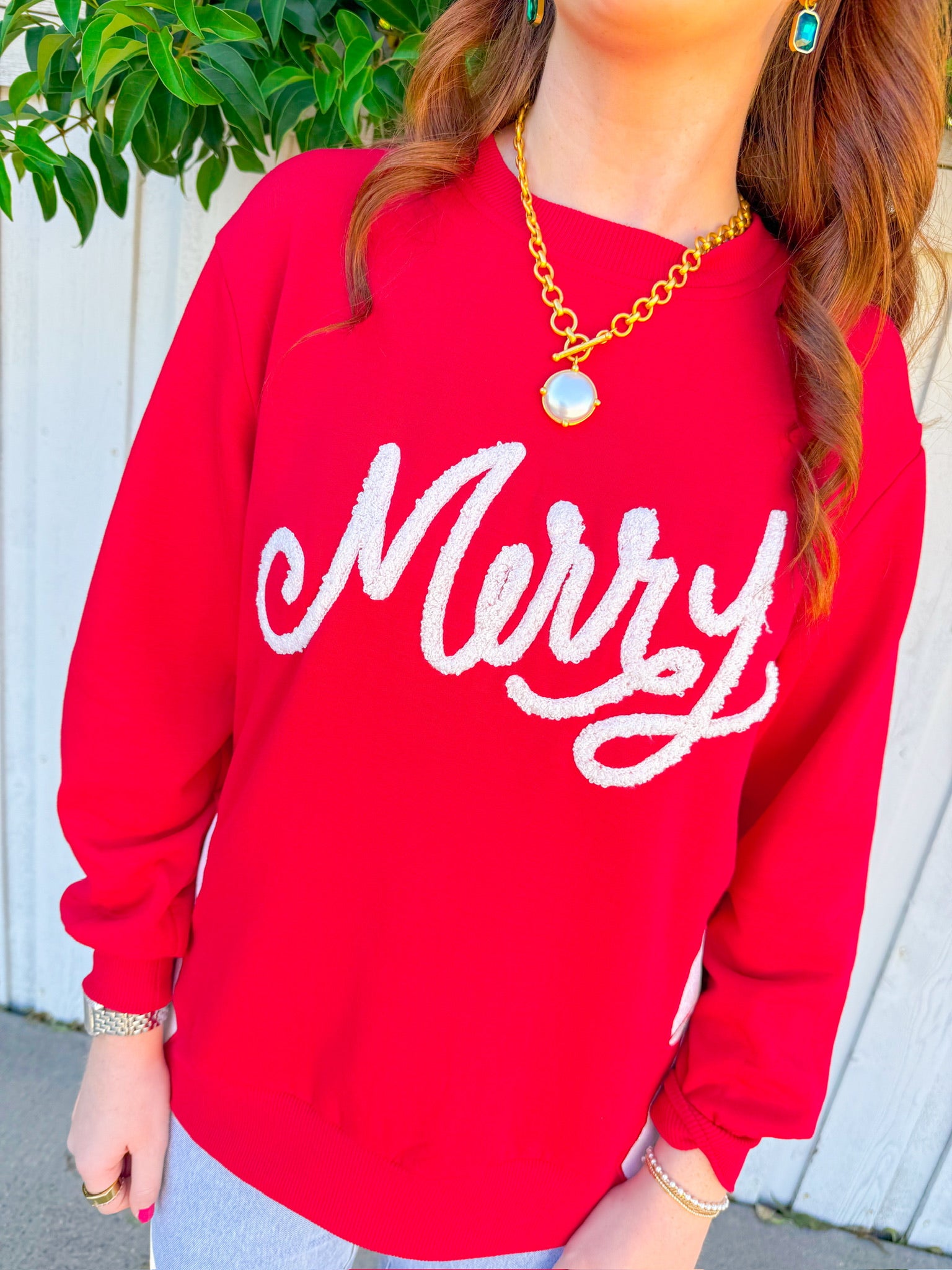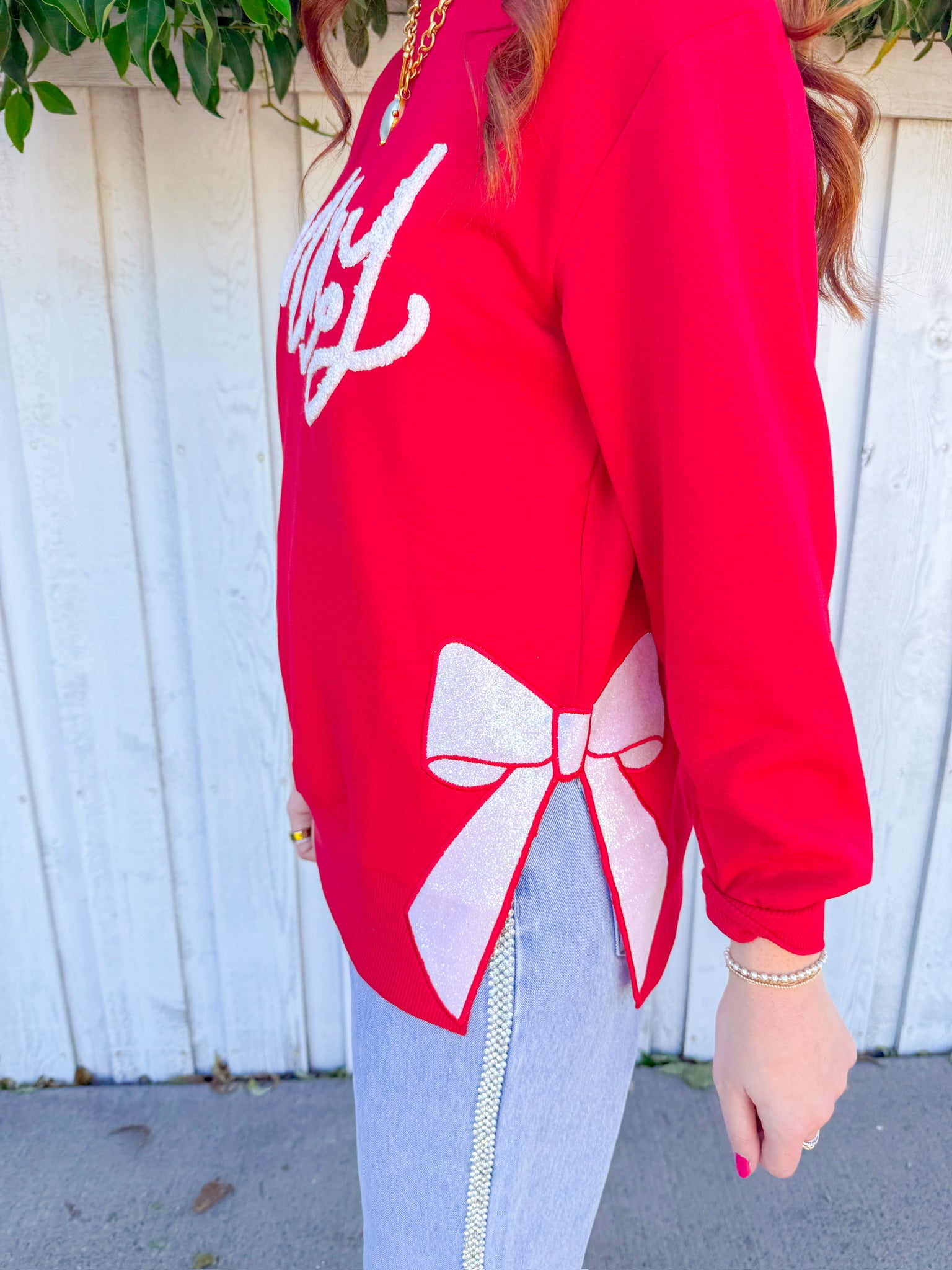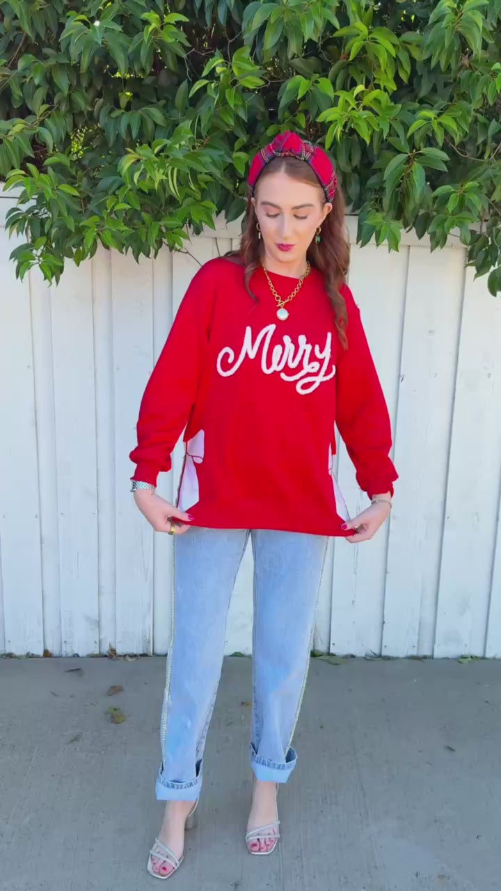 "Merry" emblazoned across the front in crisp white lettering, this cozy piece gets an extra dose of festive flair with a sparkly bow print adorning the side slit.