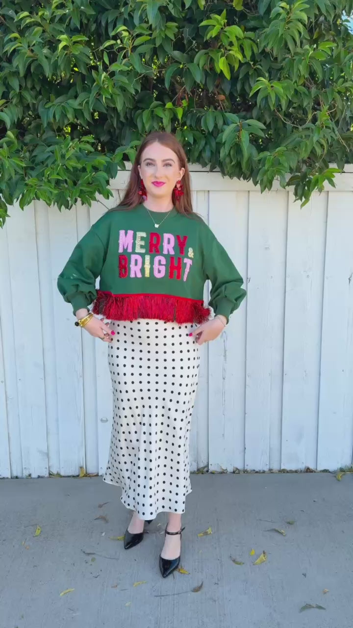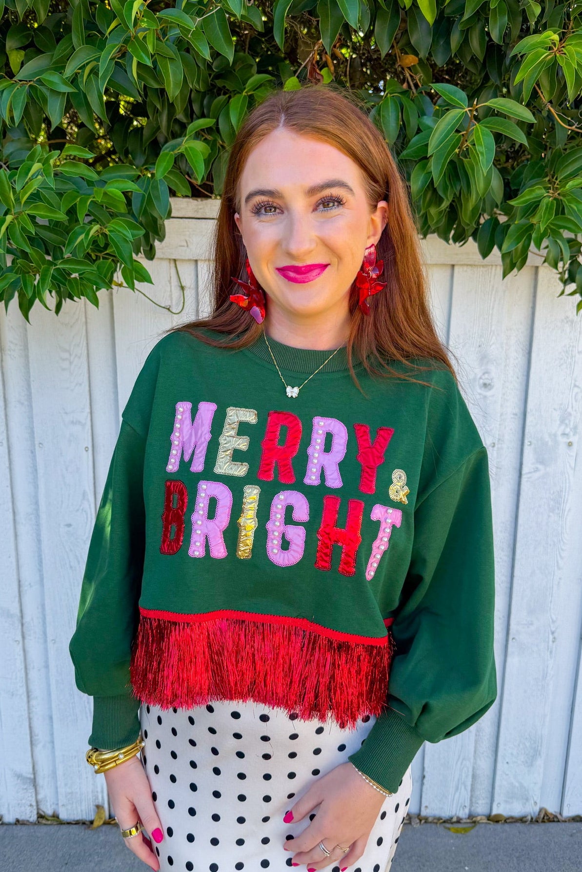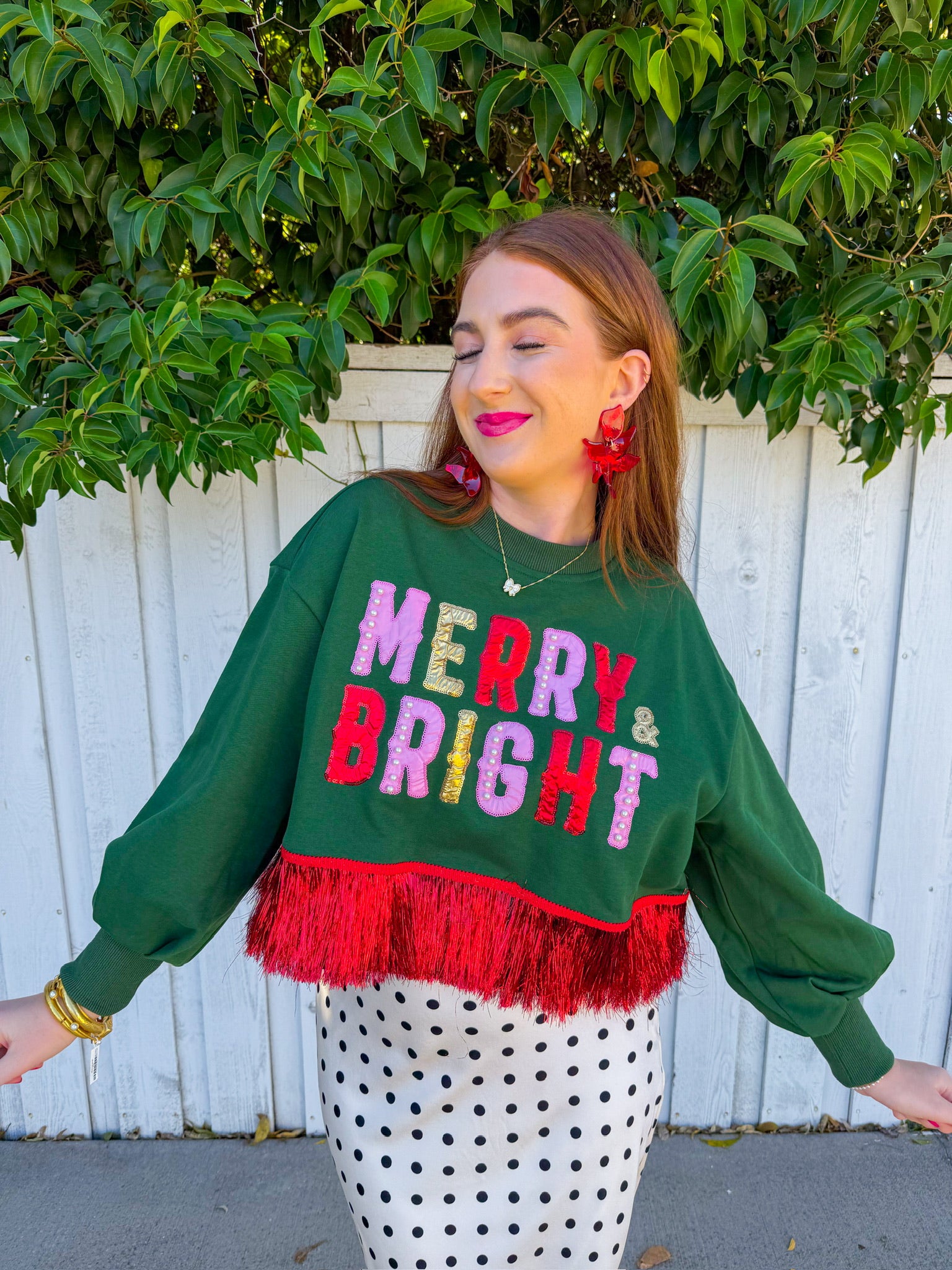 Spread holiday cheer in this festive green sweatshirt, adorned with shimmering tinsel fringe and "Merry & Bright" embellishments that catch the light with every move. Perfect for seasonal celebrations, cozy gatherings, or anyone ready to embrace the spirit of the season with style and sparkle.
