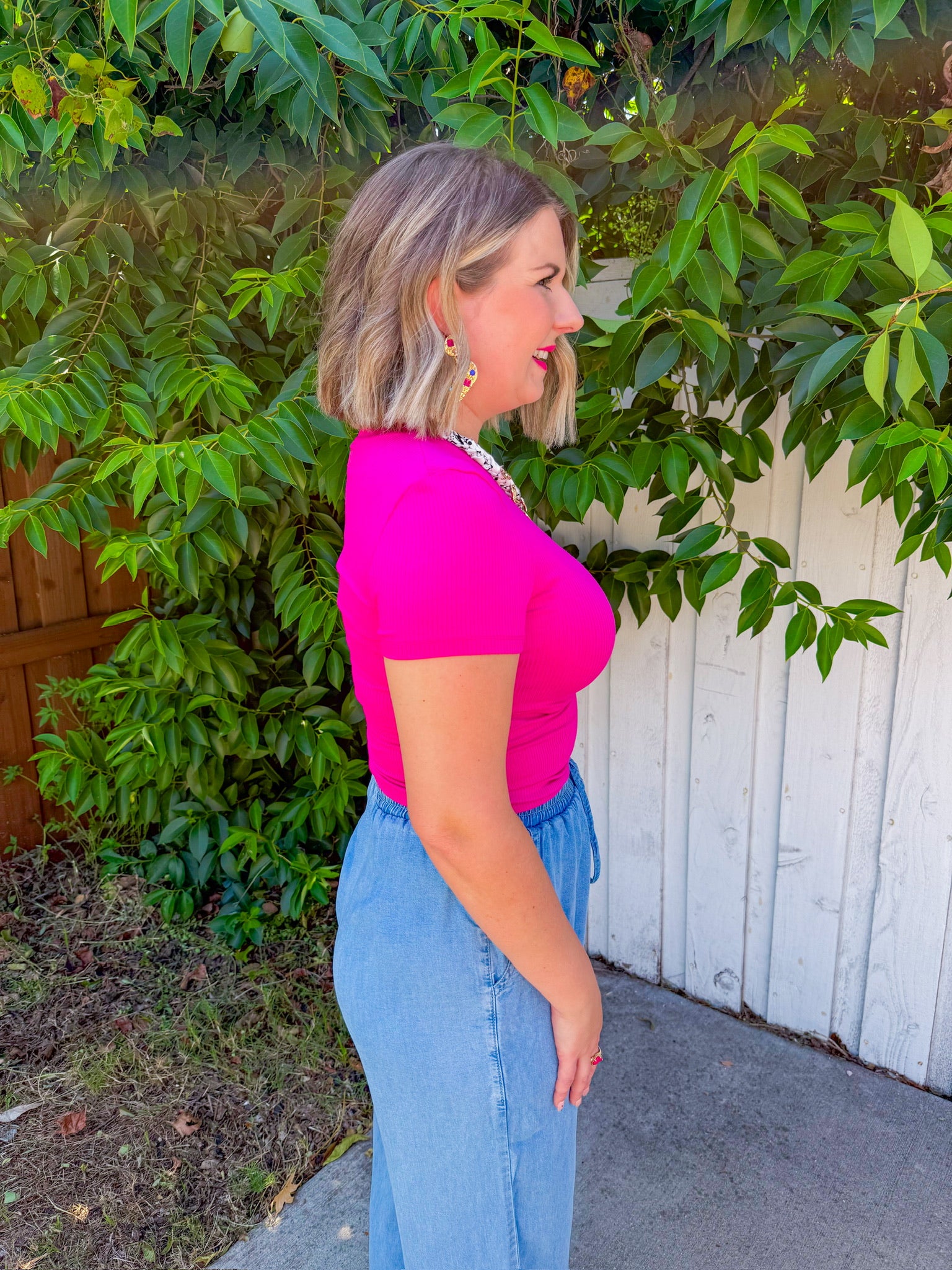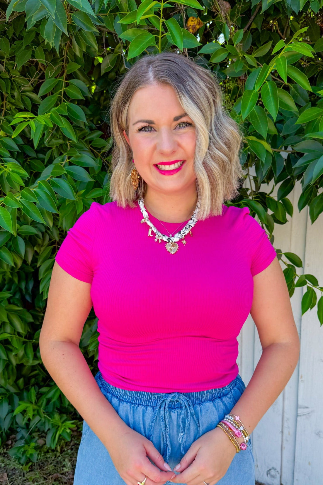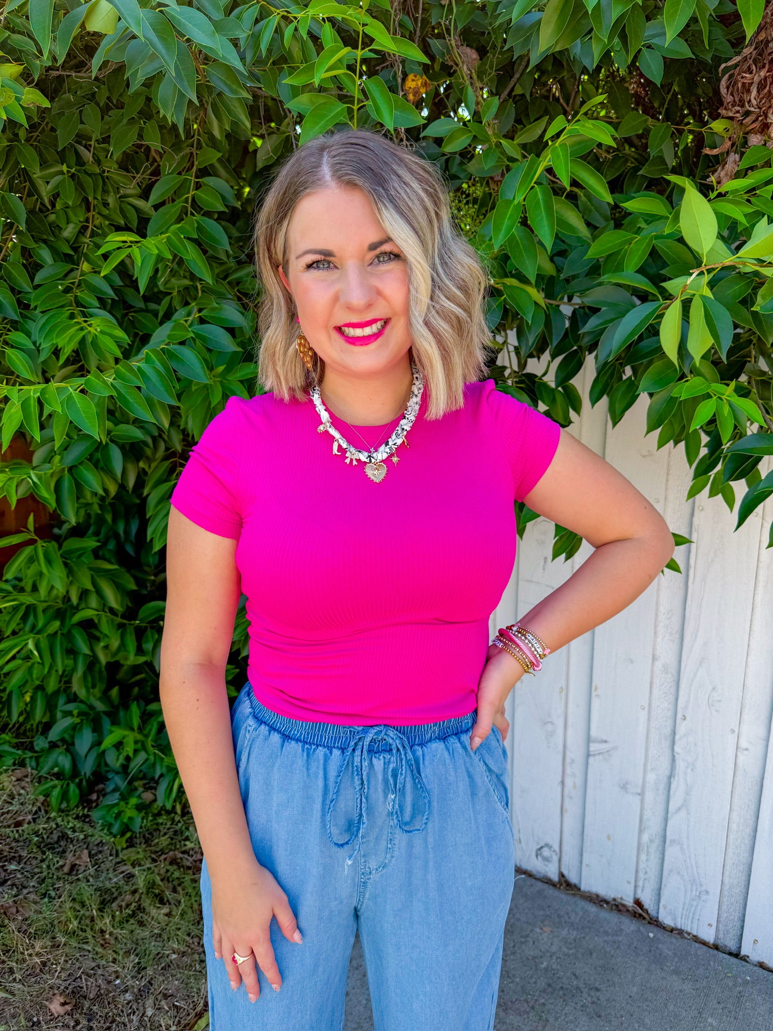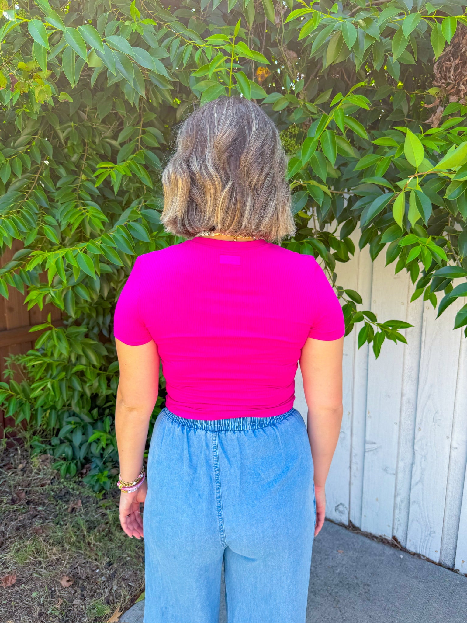 Embrace sporty comfort with the Miriam Ribbed Baby Tee in vibrant Chroma Pink. Its ribbed texture adds playful charm, making it perfect for casual days or layering with your favorite pieces.
