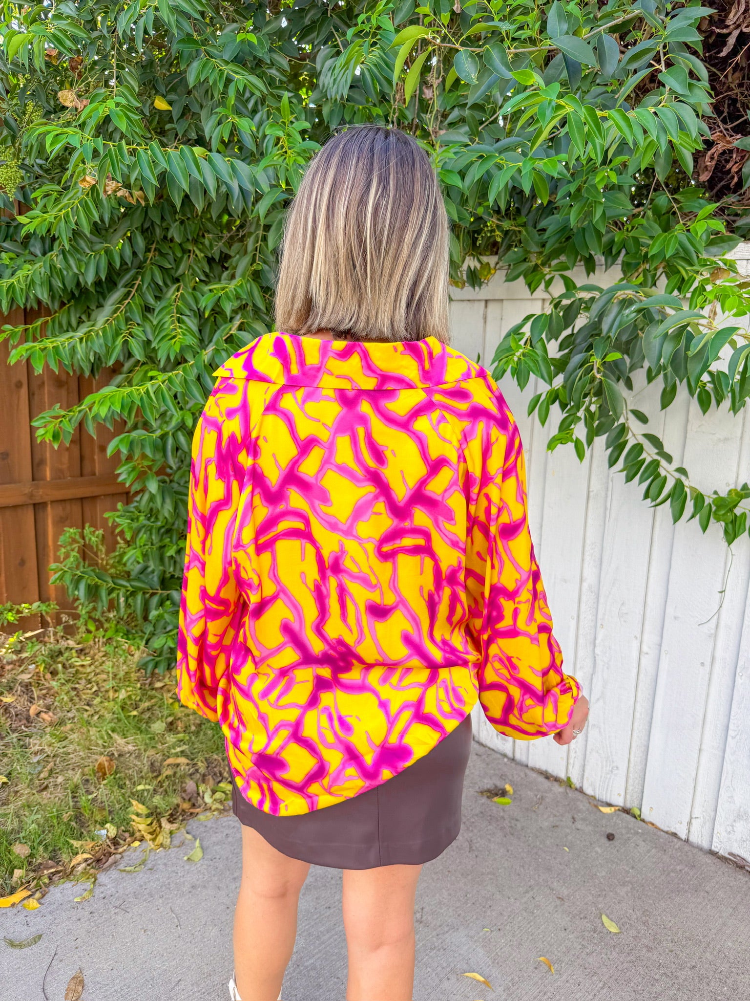 Electric-yellow popover blouse splashed with fuchsia abstract swirls—lightweight, drapey, and a total head-turner for concerts or girls’ night.
