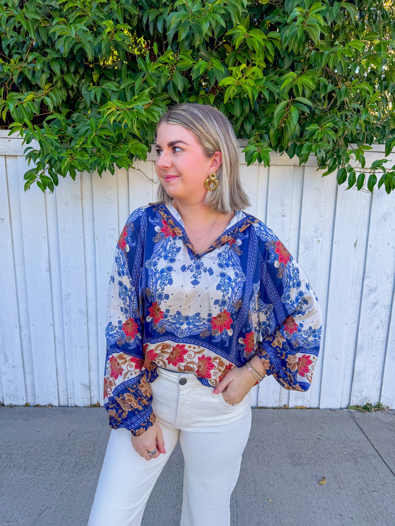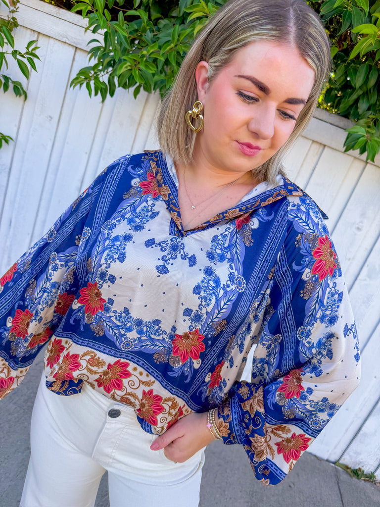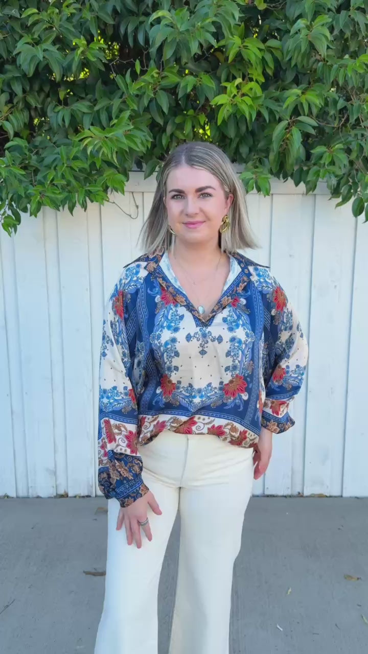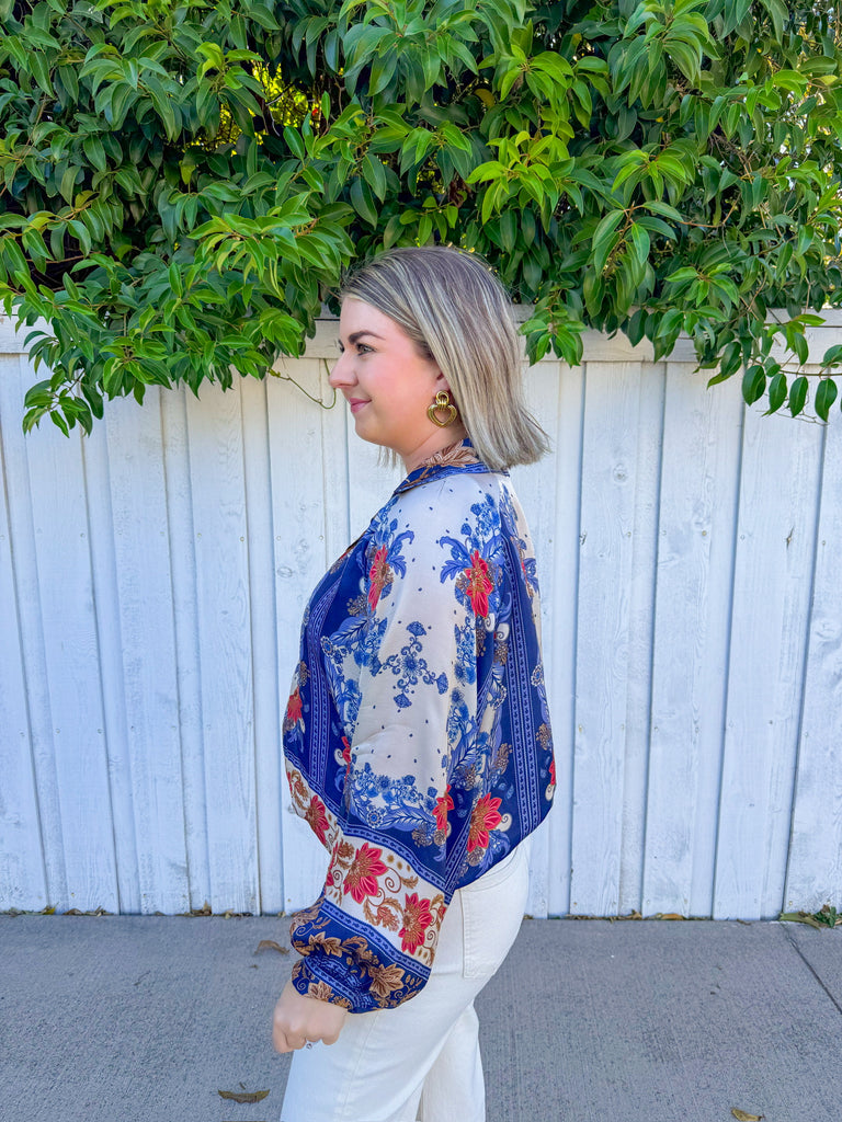 Slip into effortless elegance with this silky blouse, where dreamy blue, cream, and rust tones dance across luxurious fabric.