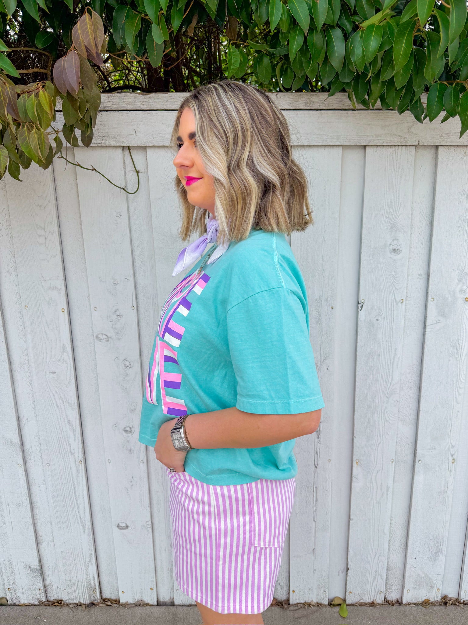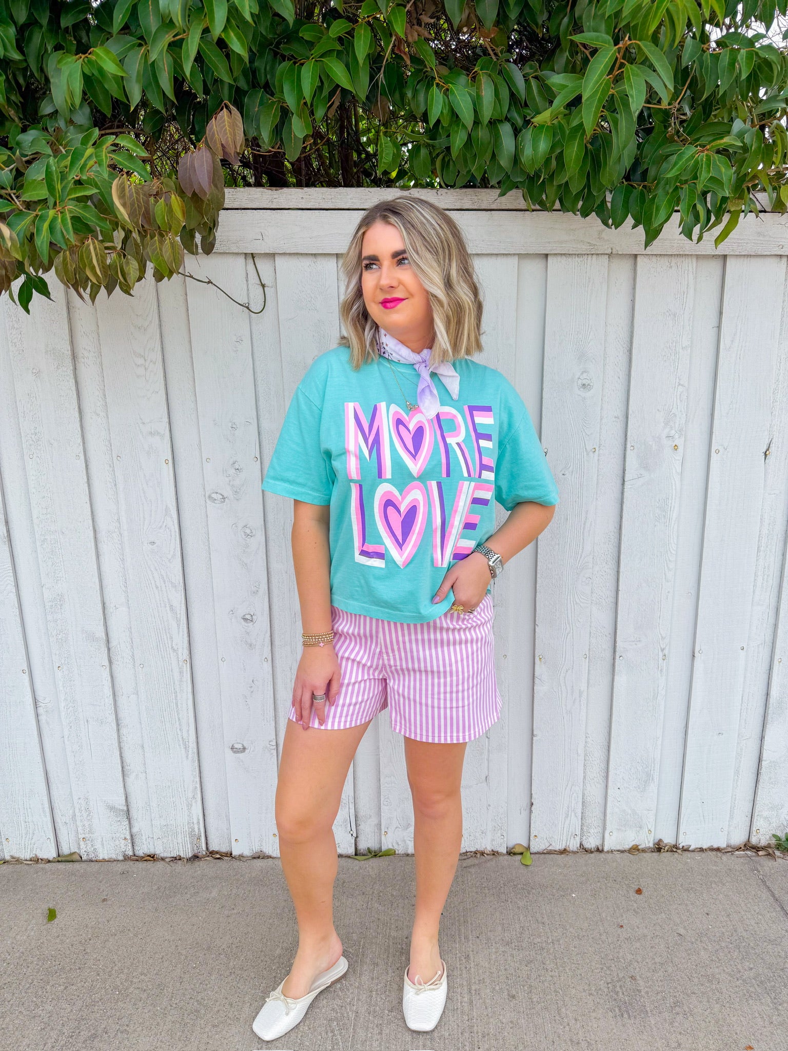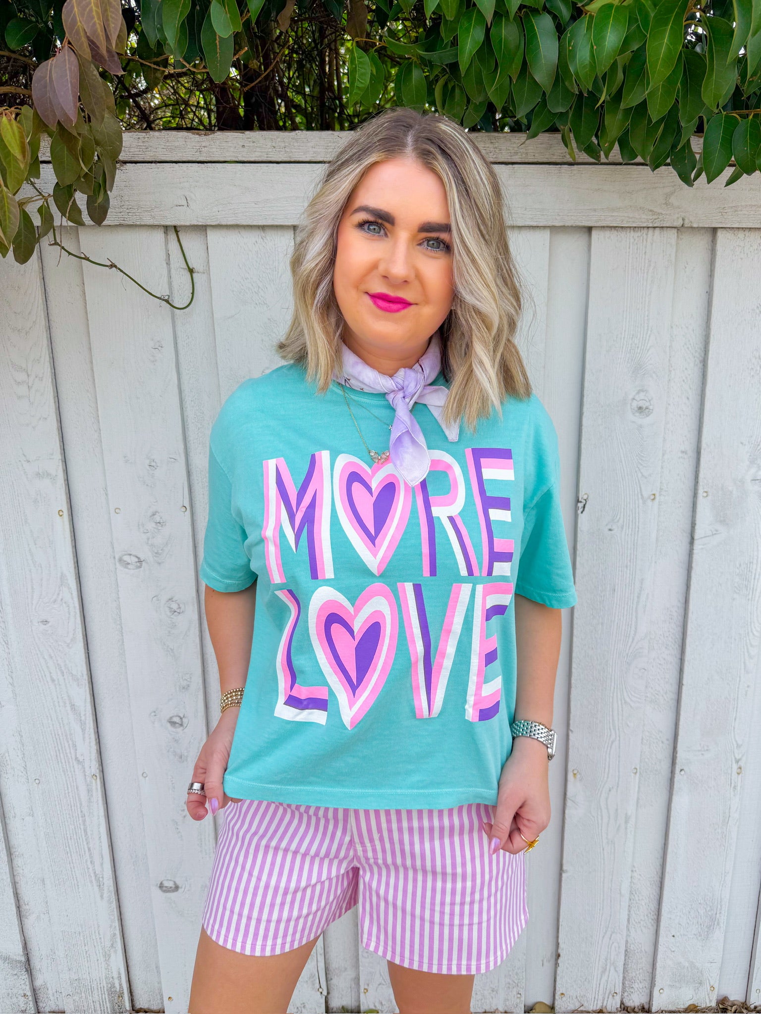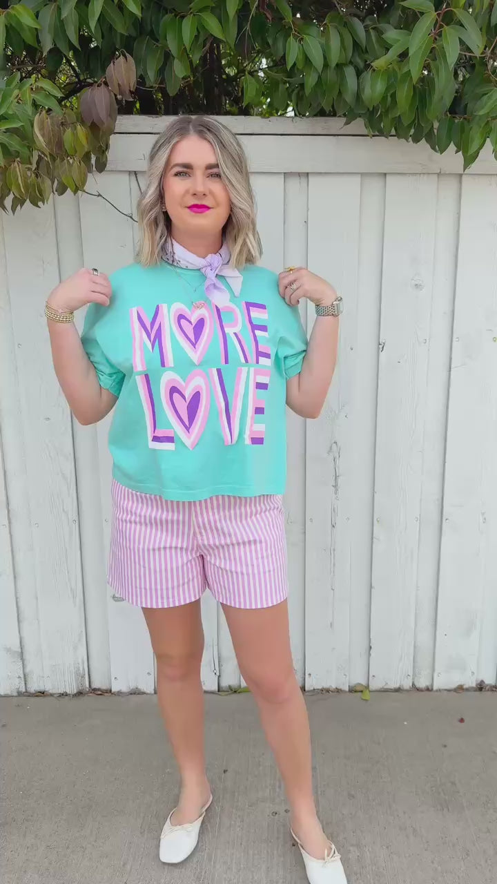 Spread the message in style with this cropped aqua tee featuring a bold abstract design. The "More Love" graphic pops in vibrant purple, pink, and white, making it the perfect statement piece for anyone who wears their heart on their sleeve—literally.