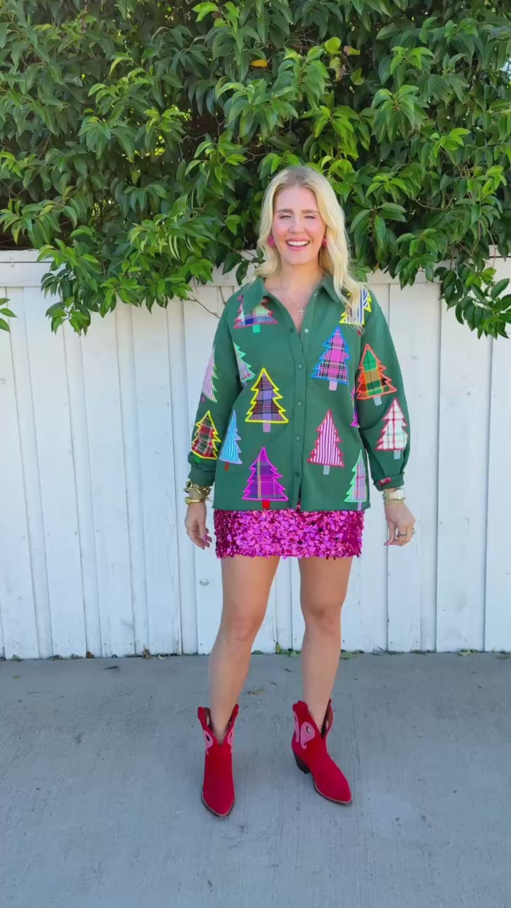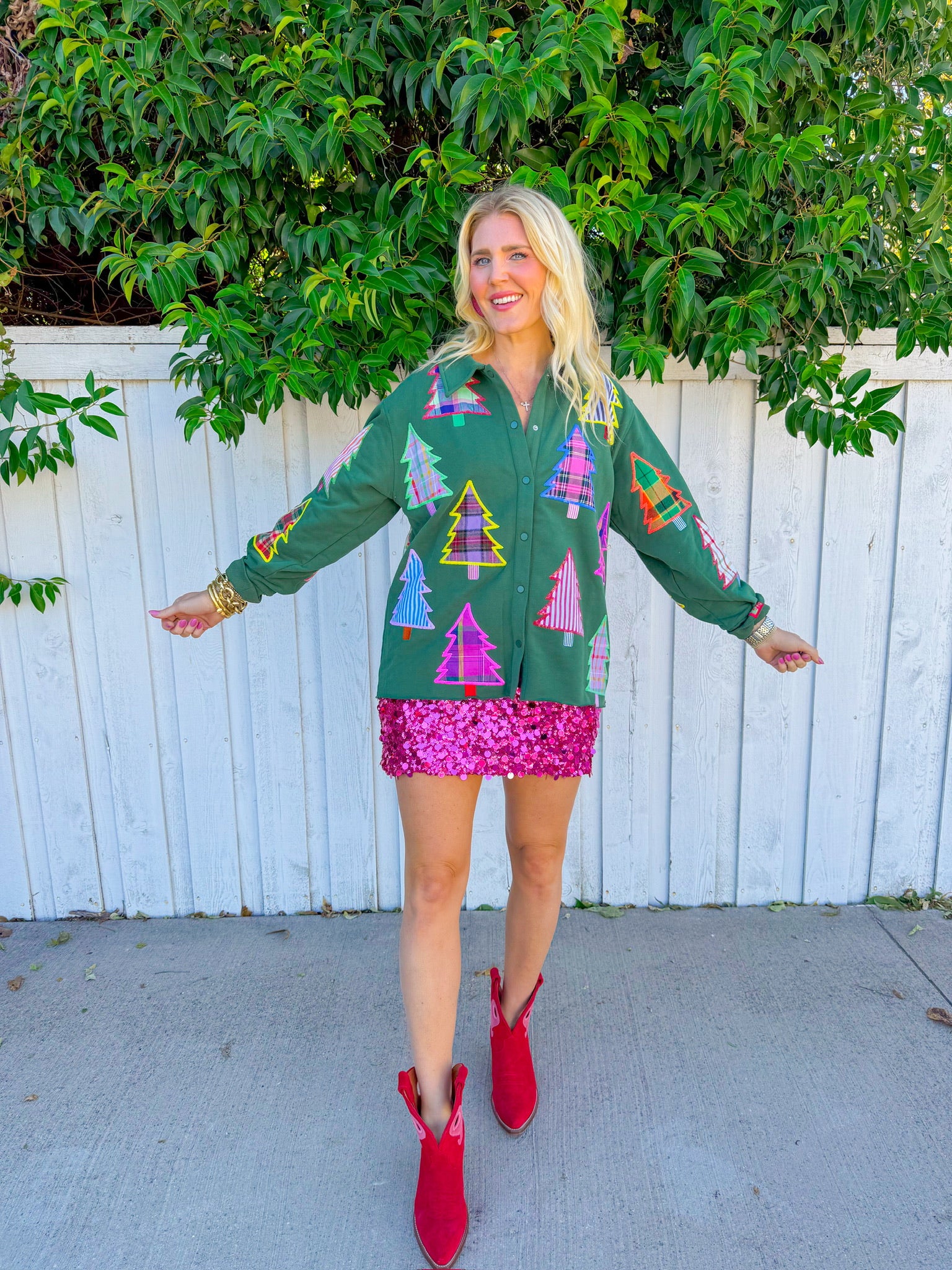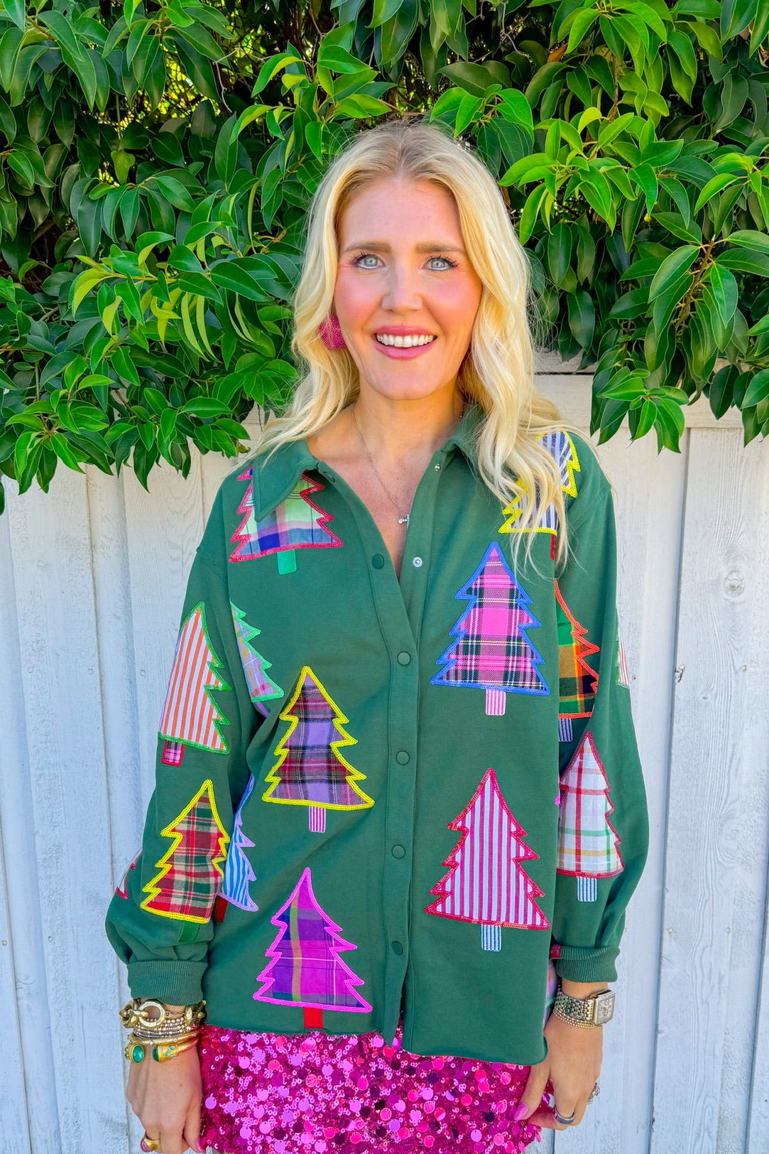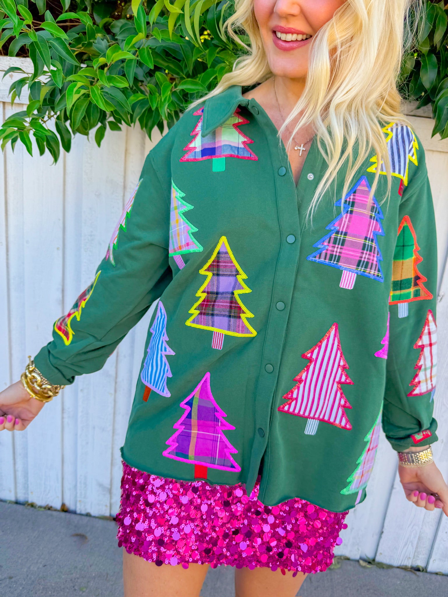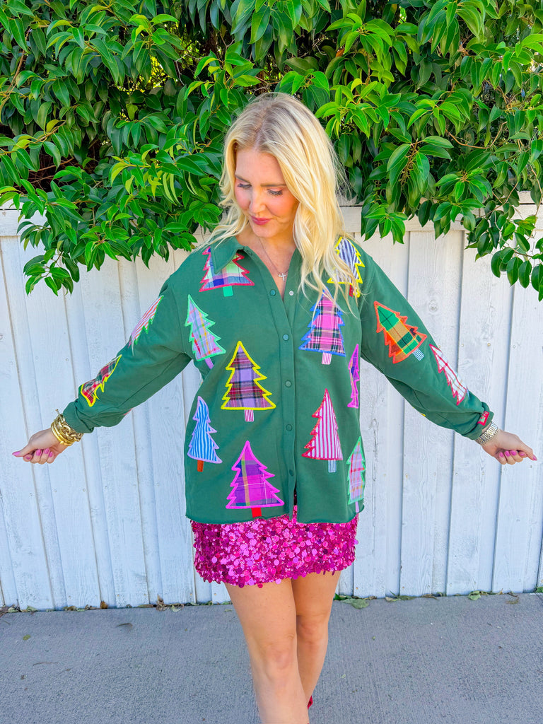 Deck the halls in festive style with this dark green button-up shacket featuring scattered Christmas trees in a cheerful multi-print design. Perfect for layering over your favorite holiday outfits, this playful piece combines cozy comfort with seasonal charm.