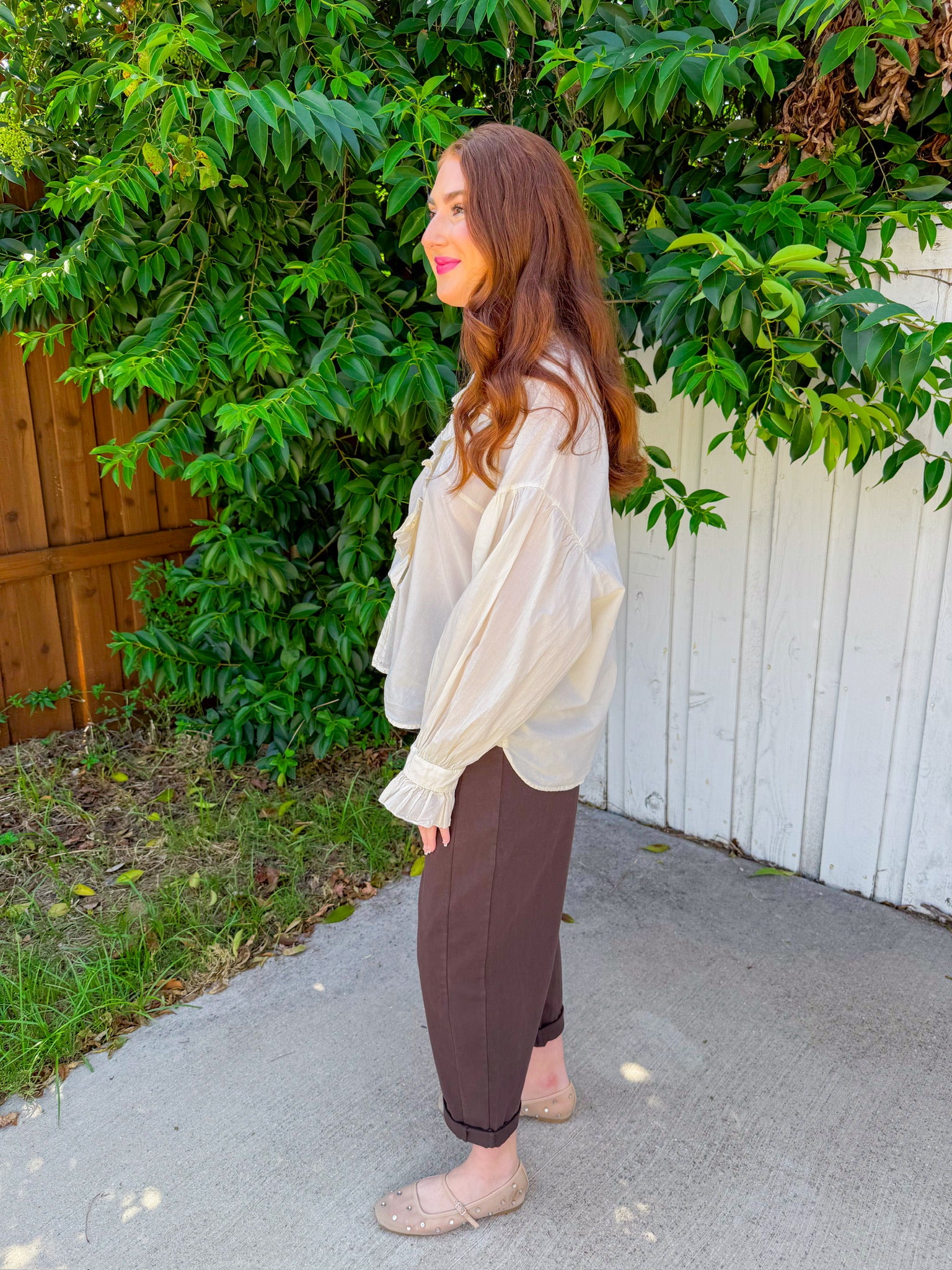 Cream ruffle blouse with a romantic neckline, soft crinkle texture, and tie-cuff sleeves—perfect for office days, fall dinners, and holiday photos. Tuck into dark denim with booties now, or layer under a tweed blazer with gold hoops.