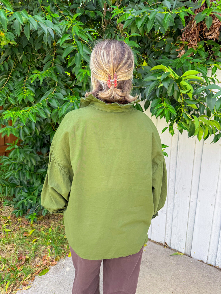 Olive ruffle blouse with a soft crinkle finish, fluttery neckline, and gathered cuffs—just-right for office days, winery weekends, and family photos