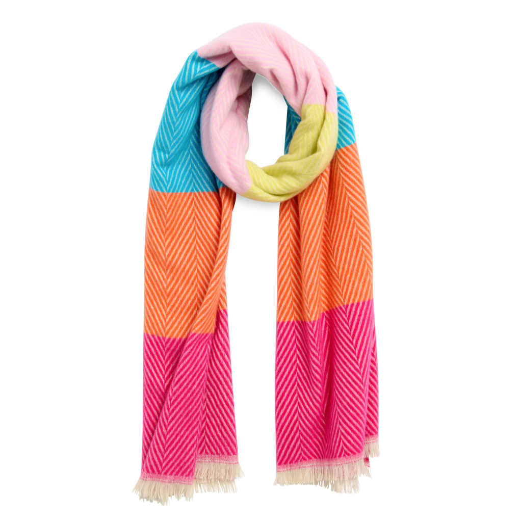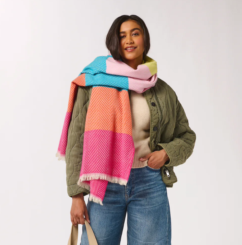 Add a bold pop of color to your cold-weather wardrobe with the Norah Scarf. Featuring wide color-blocked stripes in playful hues and a soft herringbone weave, this scarf is as eye-catching as it is cozy. Its oversized silhouette makes it perfect for bundling up, wrapping, or draping with flair. Finished with a delicate raw hem, it brings cheerful vibes to even the chilliest of days.