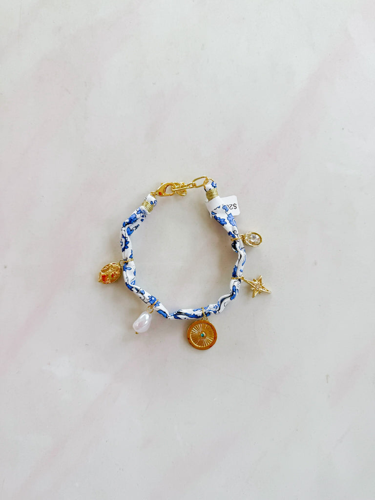 The North Star Bracelet – Cream/Blue features a dainty floral fabric band with gold charm accents, including a pearl, star, and medallion. With its whimsical mix of details, this bracelet is an easy way to add a charming, coastal-inspired touch to your everyday stack.