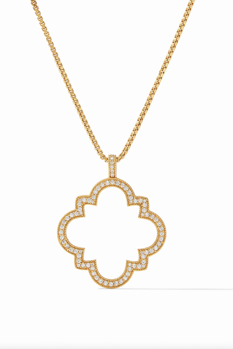 A pavé quatrefoil silhouette on a lengthy box chain makes this sparkling pendant the focal point of your look. Wear it long or doubled up.