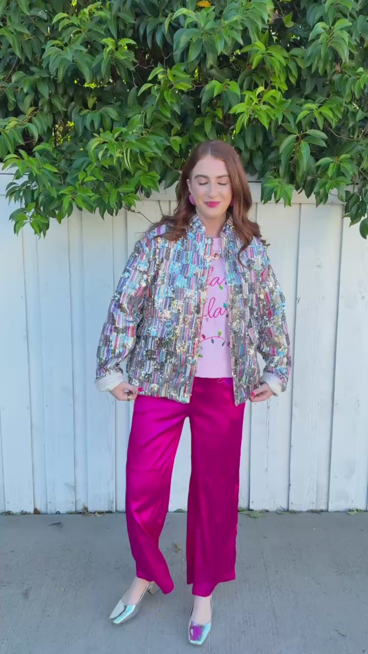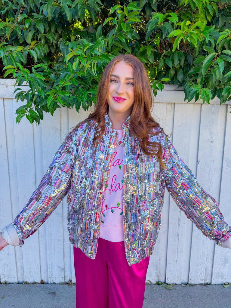 Shine like the star you are in this show-stopping silver sequin jacket! Featuring a dazzling silver exterior with a vibrant, colorful sequin underlay that peeks through for extra pizzazz, this jacket transforms any outfit into a statement look.
