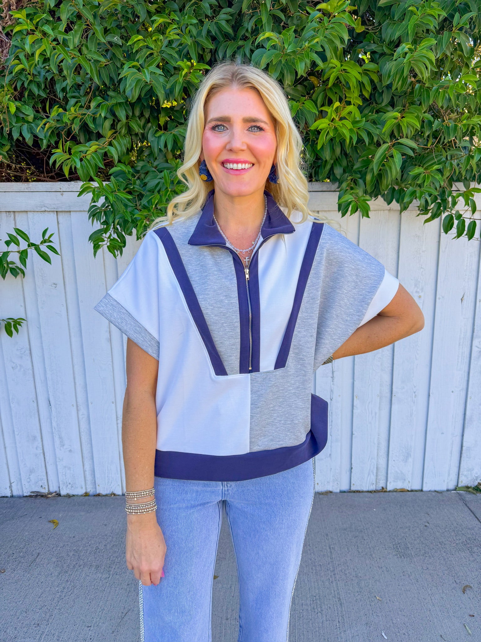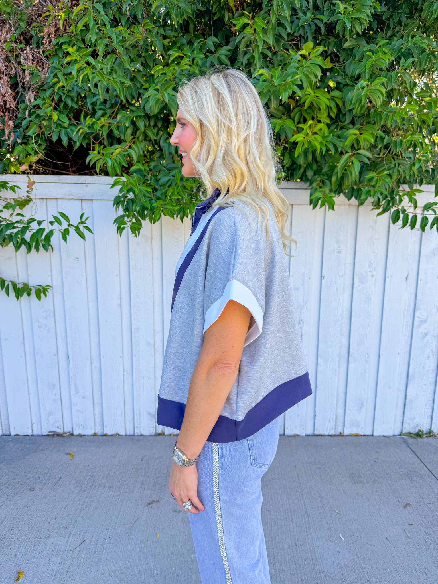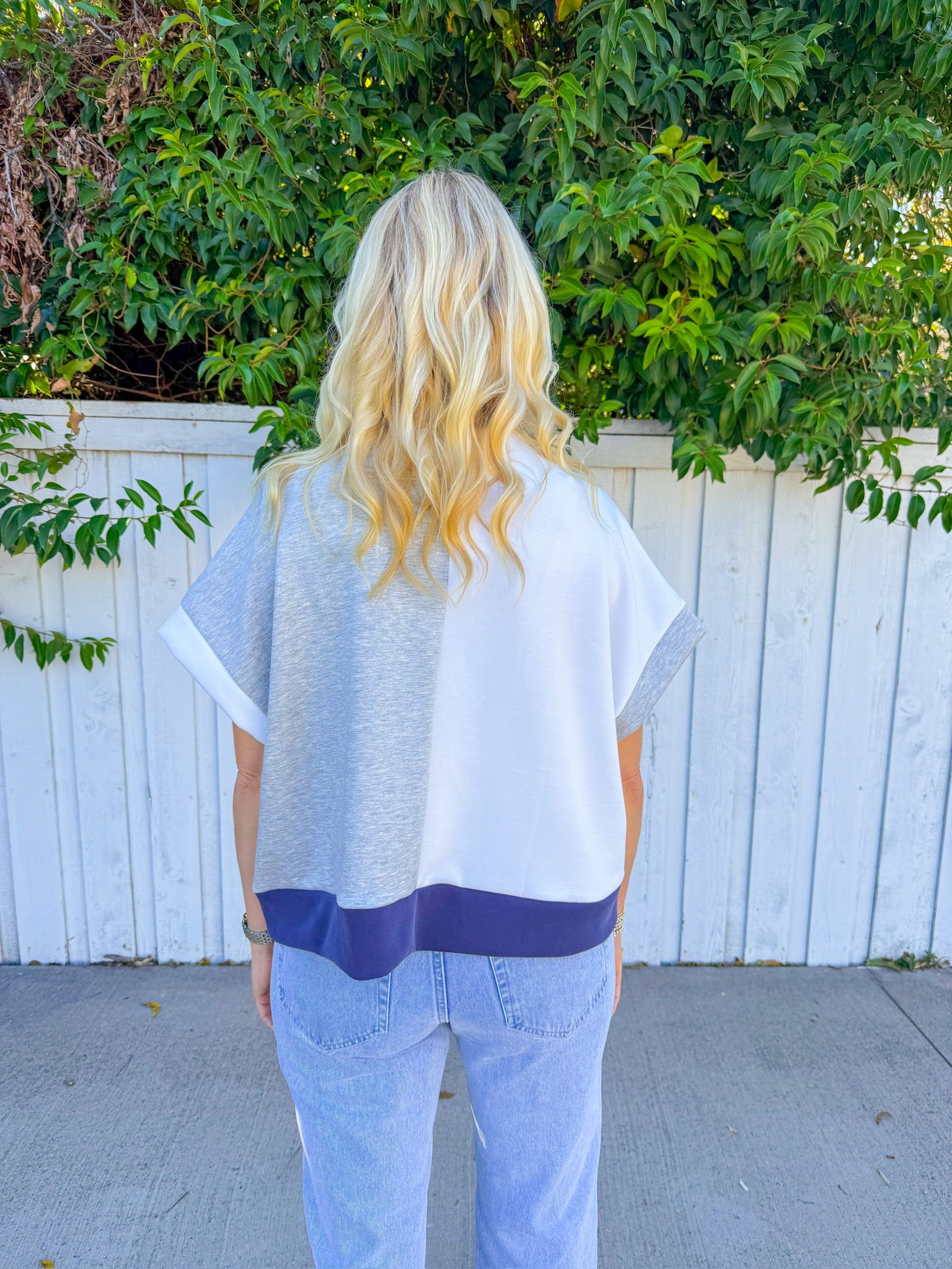 Effortless layering meets modern edge with this grey short-sleeve top. Crisp white colorblock panels split the design, while a dusty blue denim trim adds just the right amount of texture and contrast.