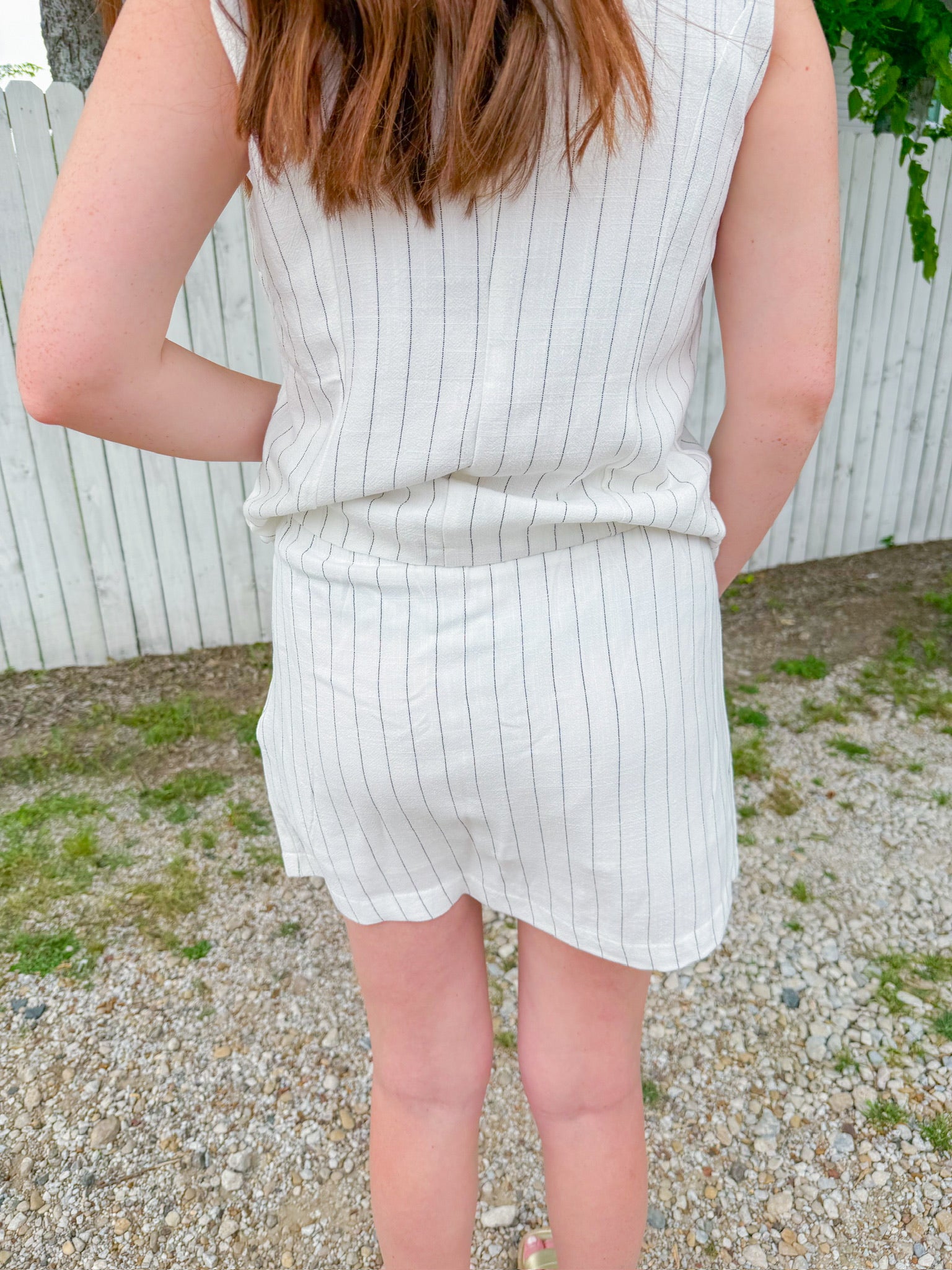 The Open Skies Skirt - White is your go-to for effortless summer styling, featuring crisp vertical stripes and a structured shape that still feels easy. This high-waisted mini is cute with the matching tie top for brunch or styled with a graphic tee and sneakers for a casual day around town.