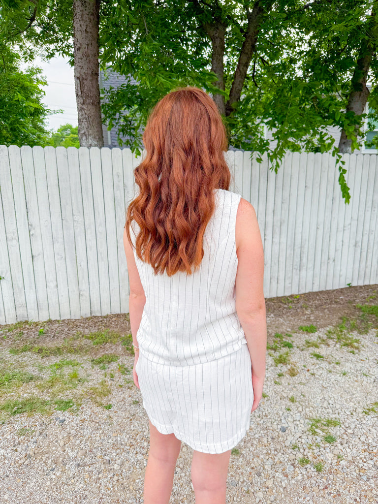 This is the Open Skies Top. Made from a lightweight linen-blend with delicate black pinstripes, this sleeveless top features three front ties that add a playful twist to a clean silhouette. Perfect for pairing with matching shorts for a beach picnic or denim cutoffs and gold jewelry for happy hour on a patio.