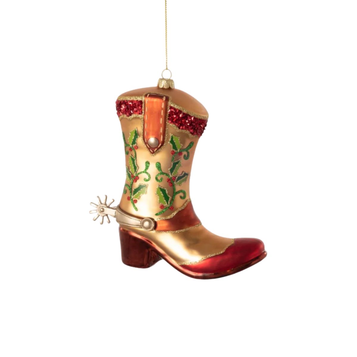 Saddle up your tree with this oversized western boot ornament! Crafted in crisp gold, this playful piece brings a touch of cowboy charm to your holiday décor.