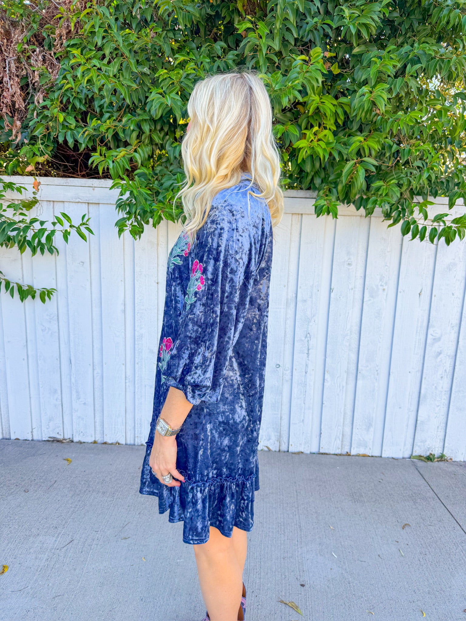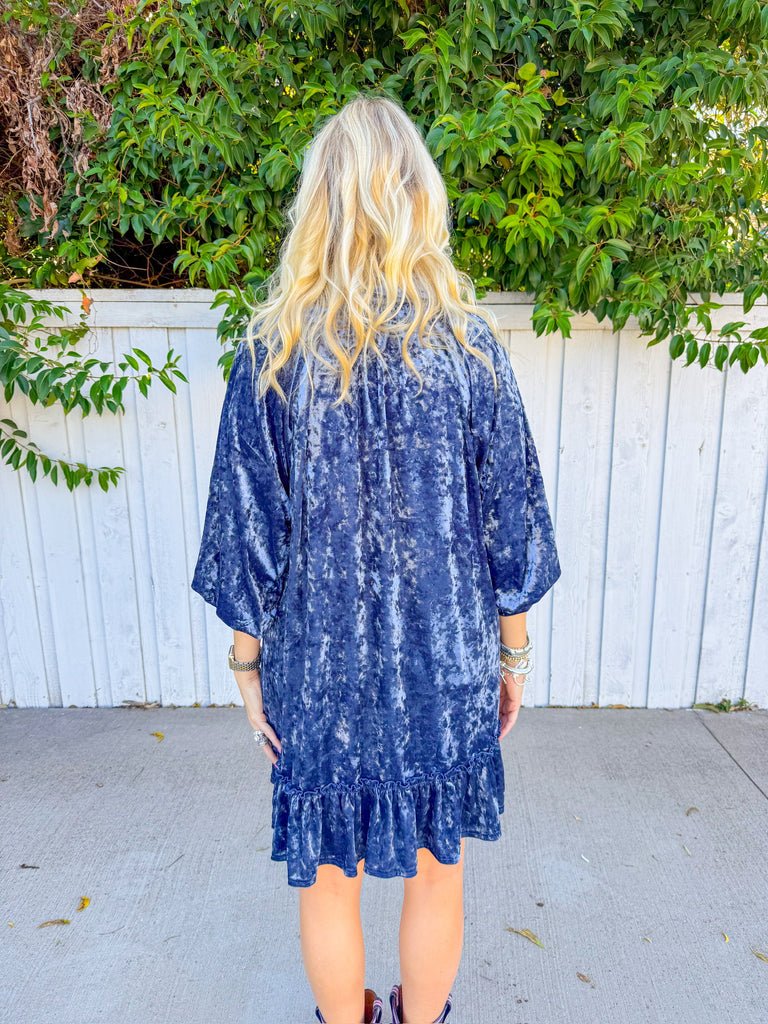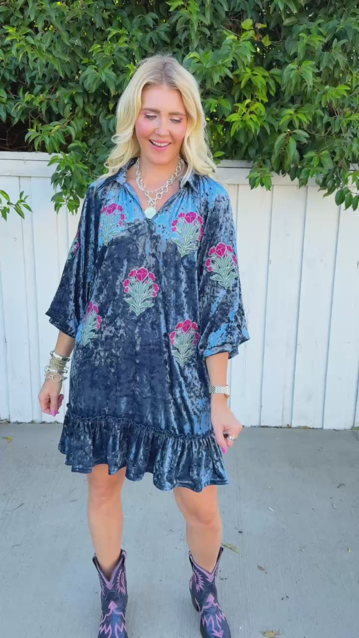 Twirl into the season in this charming crushed velvet mini dress, where soft denim blue meets whimsical florals. Delicate flower patches dance across the fabric, creating a garden-inspired look that's equal parts romantic and fun.
