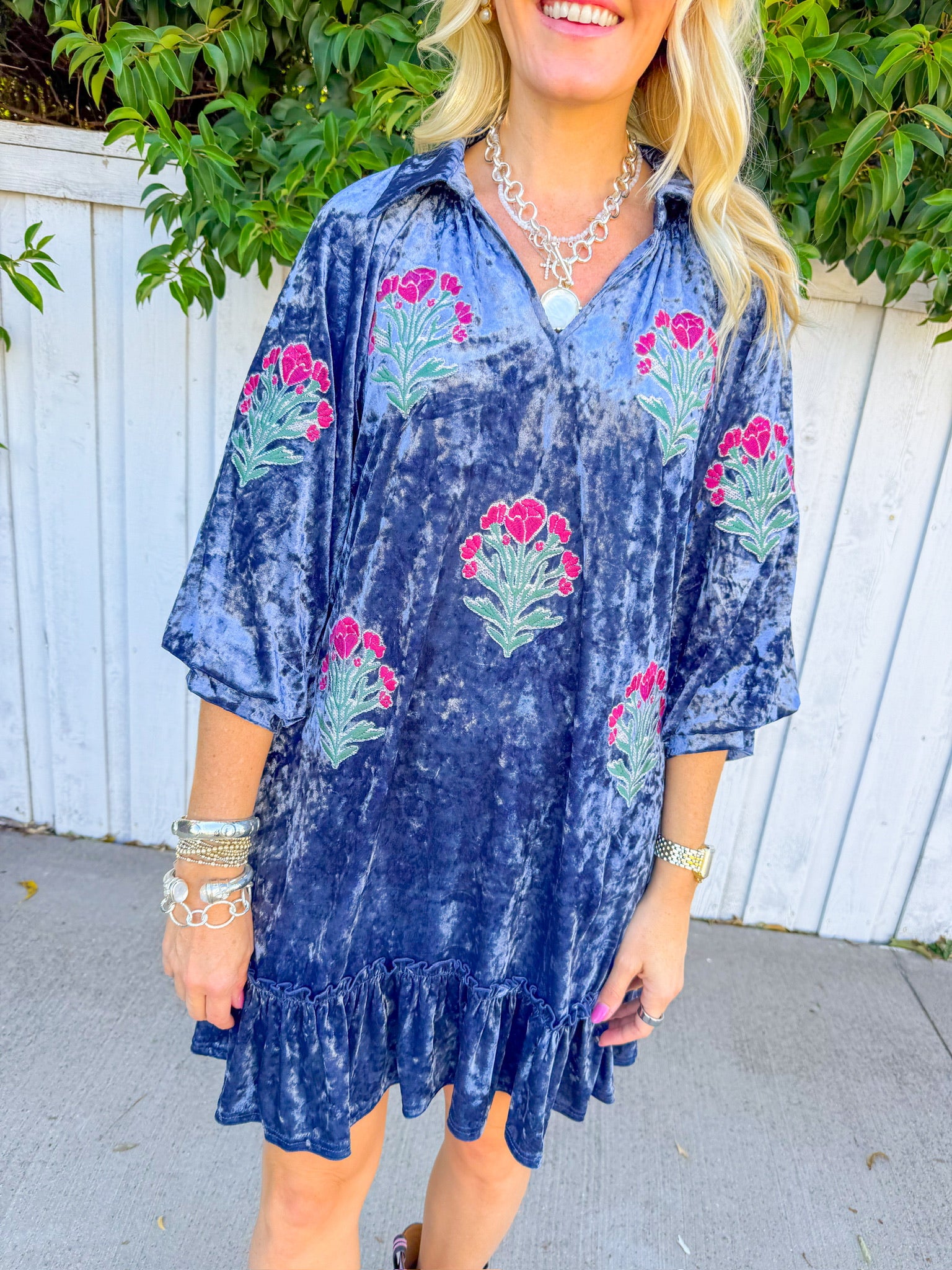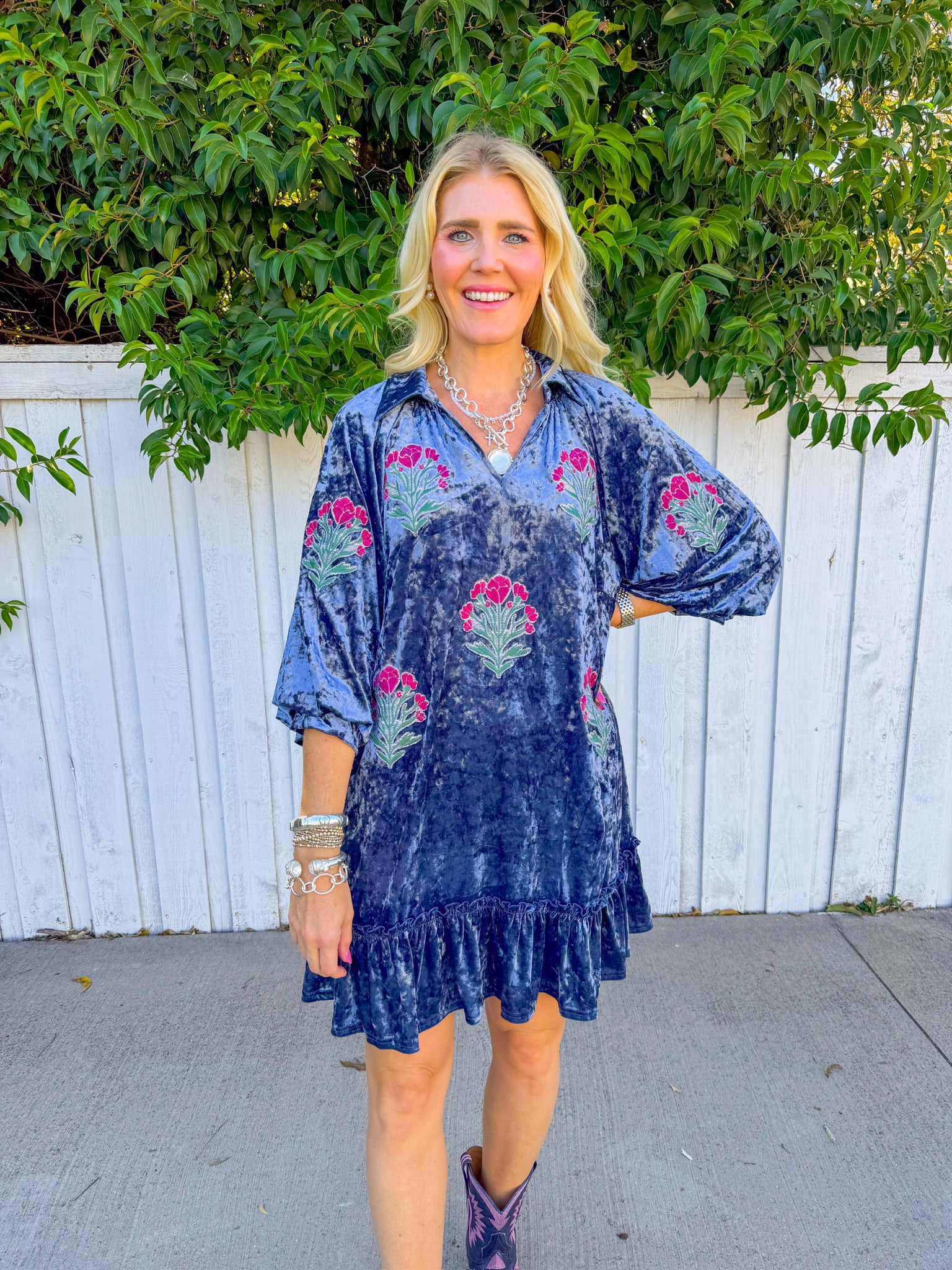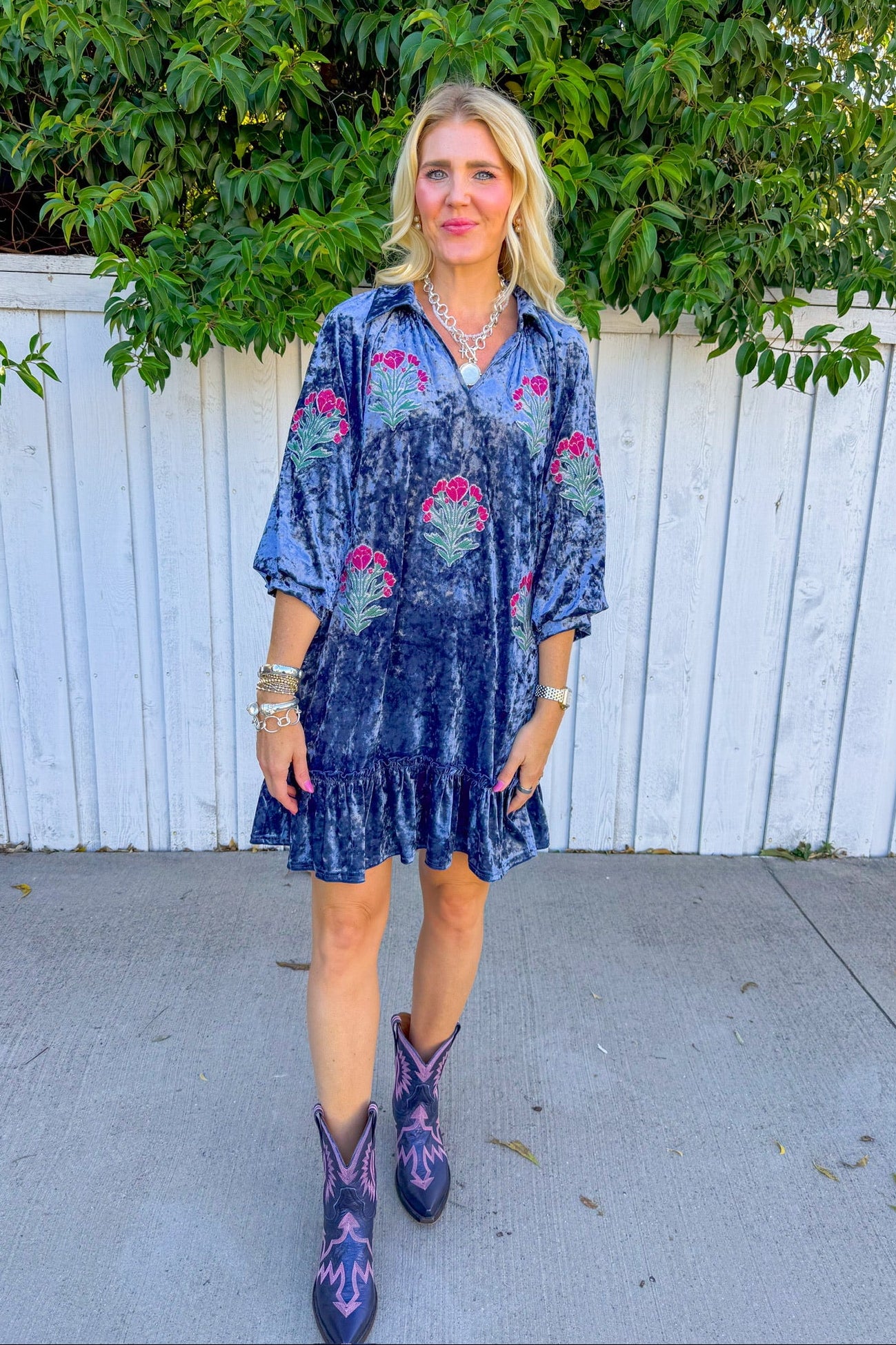 Twirl into the season in this charming crushed velvet mini dress, where soft denim blue meets whimsical florals. Delicate flower patches dance across the fabric, creating a garden-inspired look that's equal parts romantic and fun.