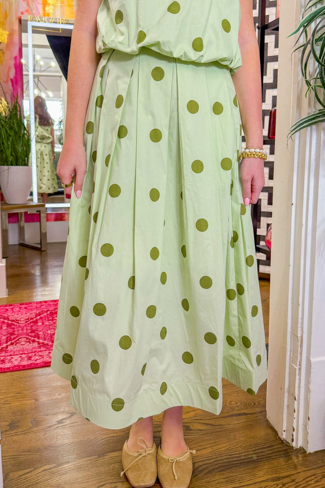 Chic and playful, this light green midi skirt is dotted with dark green polka dots for a fun, eye-catching pattern.
