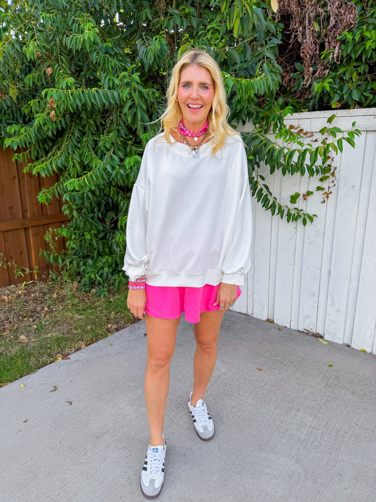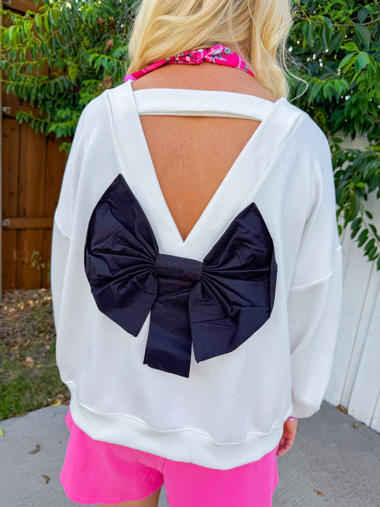 This ivory pullover brings a charming twist with a playful keyhole and bow detail on the back, adding a sweet surprise to your cozy look. Perfect for quiet moments or casual outings, it blends comfort with a little flirty flair.