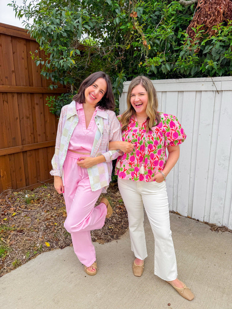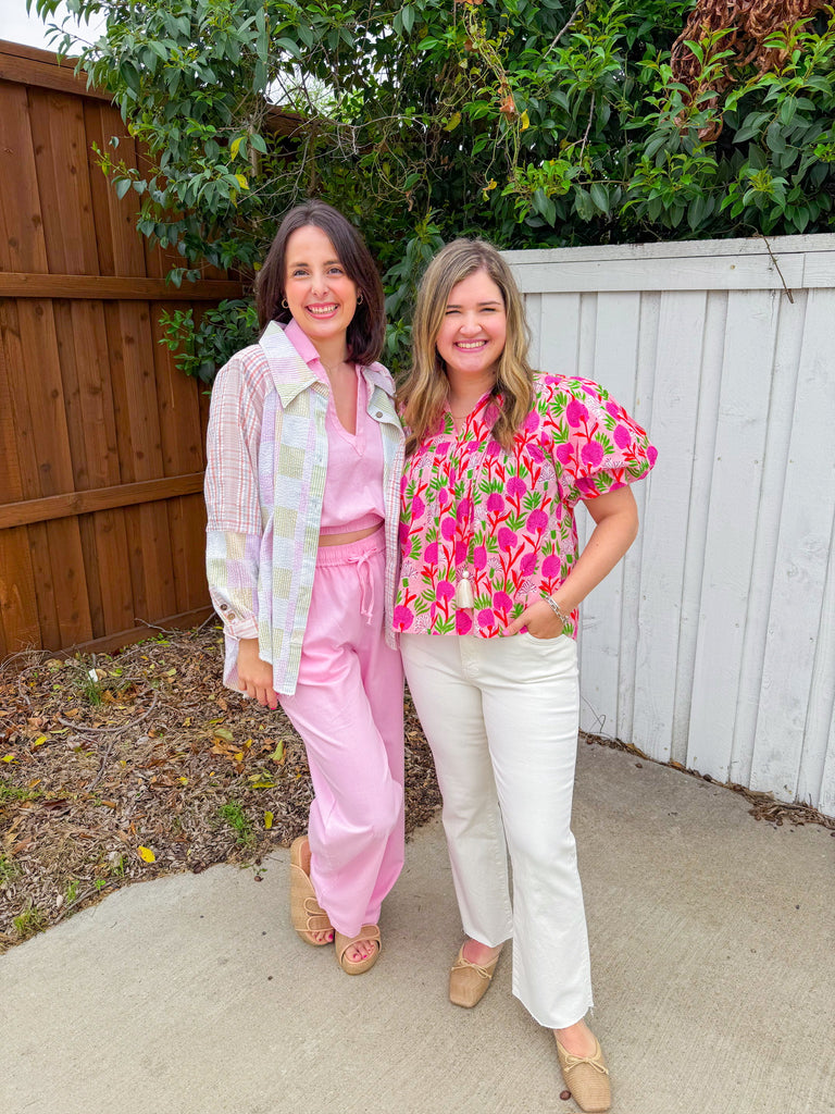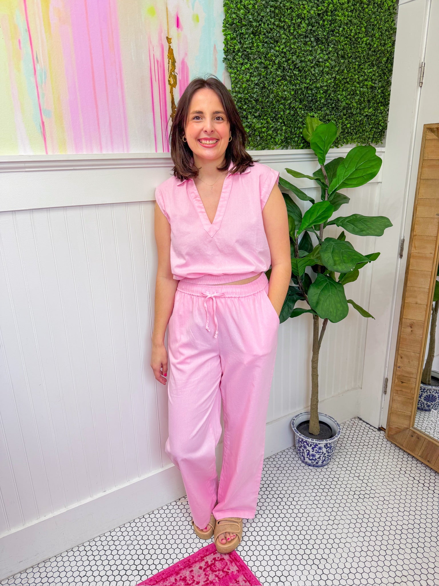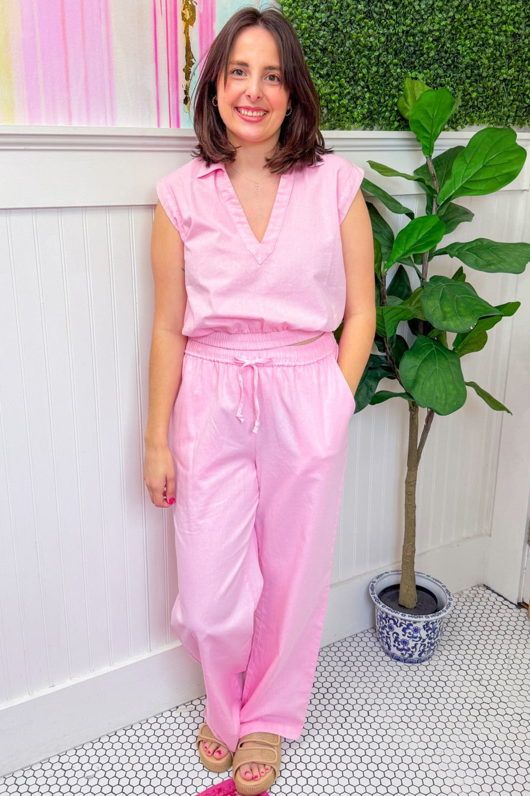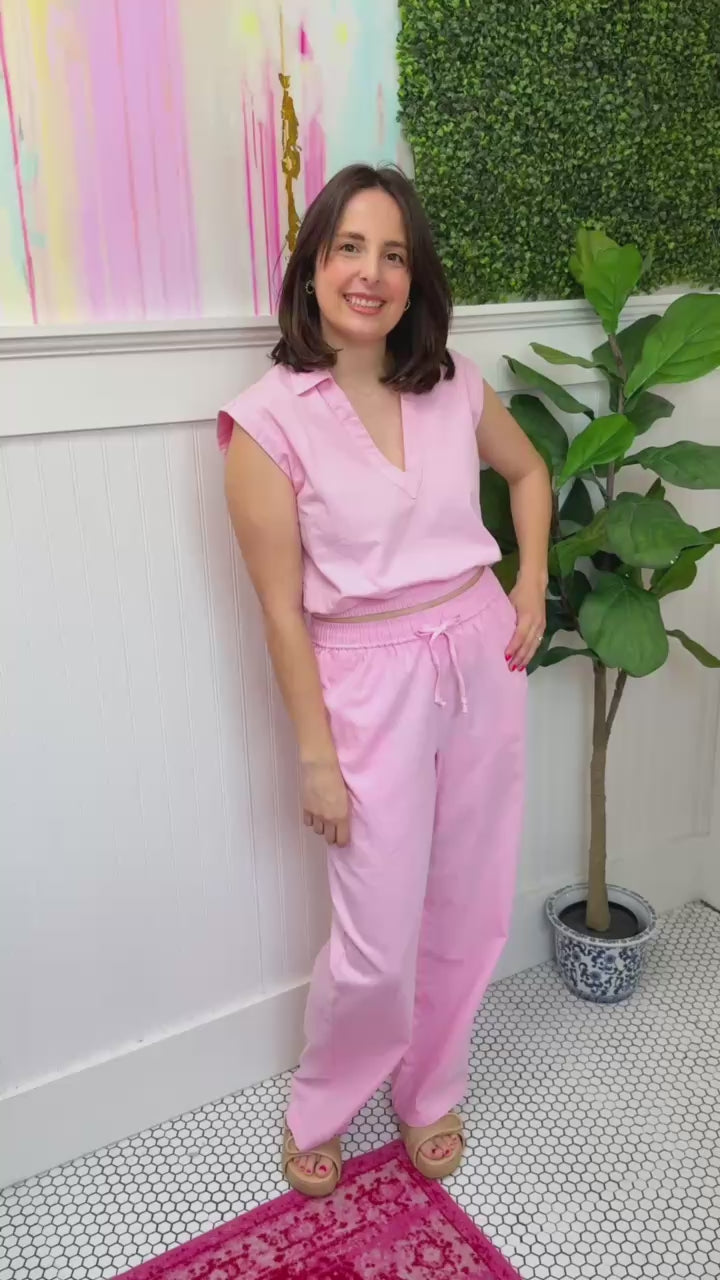 Rays of Sun Set—the outfit that feels like golden hour magic wrapped in fabric! This dreamy two-piece set features a light pink cap sleeve cropped top with a comfy, stretchy band at the bottom for the perfect fit. The matching high-waisted, wide-leg pants bring effortless movement, making every step feel like a slow-motion runway moment. Lightweight and breezy, this set was made for spring adventures