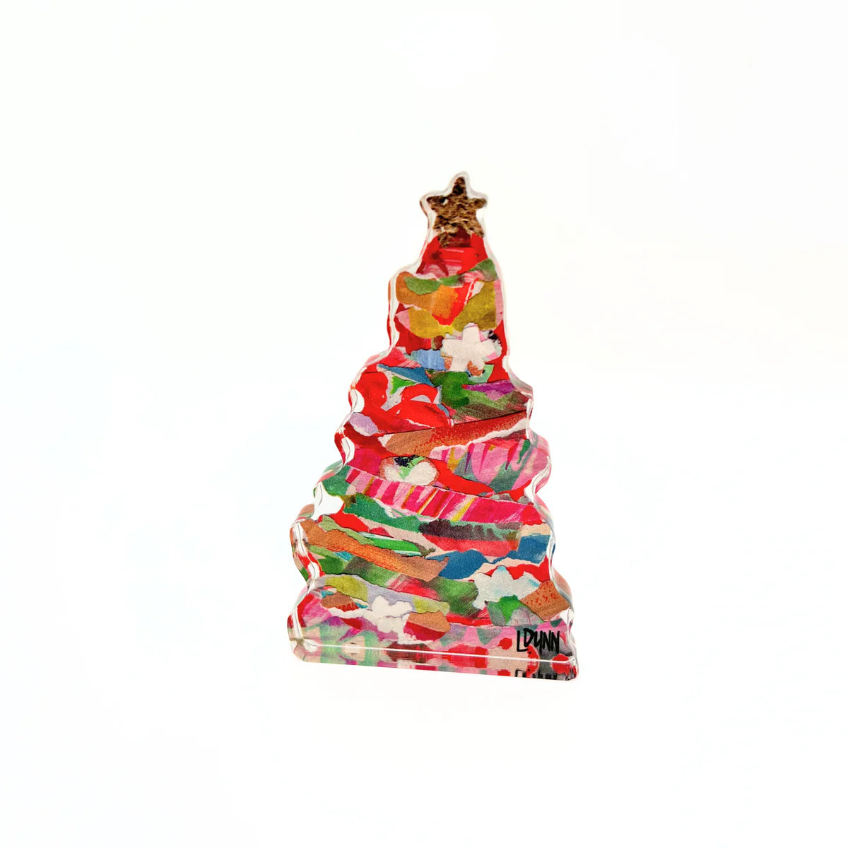 Our Christmas tree collection is growing! Our red adorned bitty tree is a merry addition to any Christmas decor and pairs well with our other bitty trees, the bright green adorned tree as well as the festive green bitty tree. This free standing acrylic tree features Lauren's collage work printed onto 1/2" thick acrylic.
