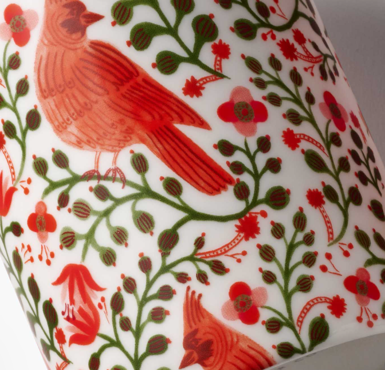 With elegant cardinal illustrations and a red handle and rim, this seasonal porcelain mug brings a bit of cheer to the morning routine.