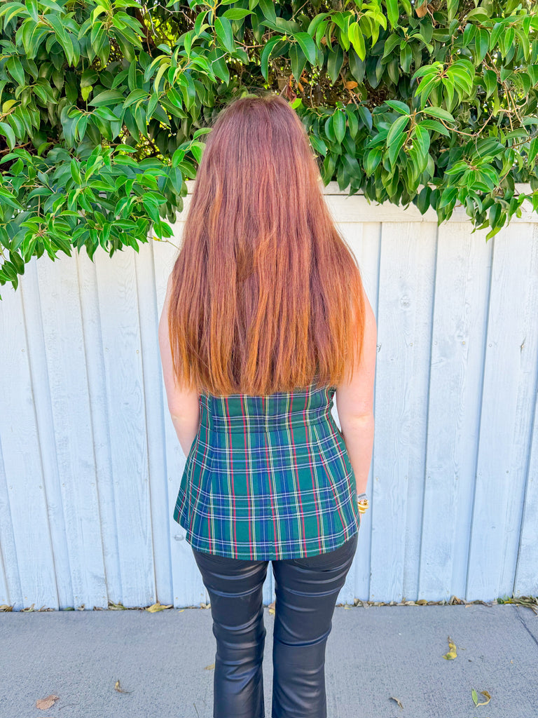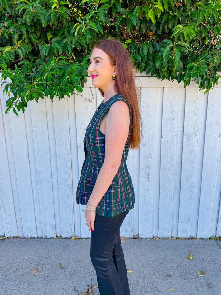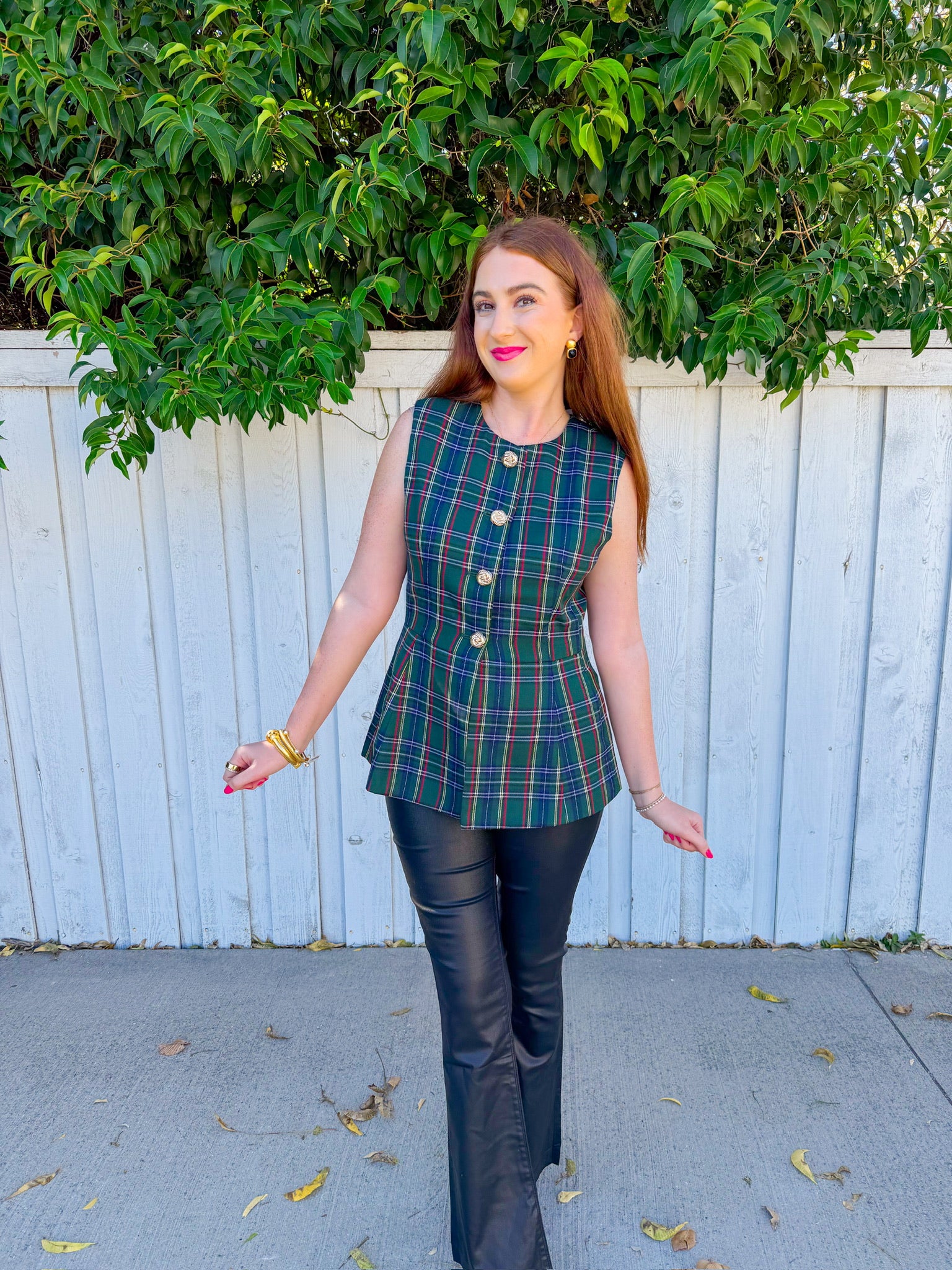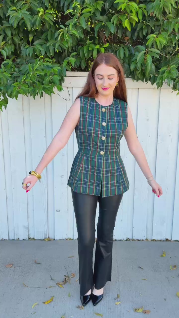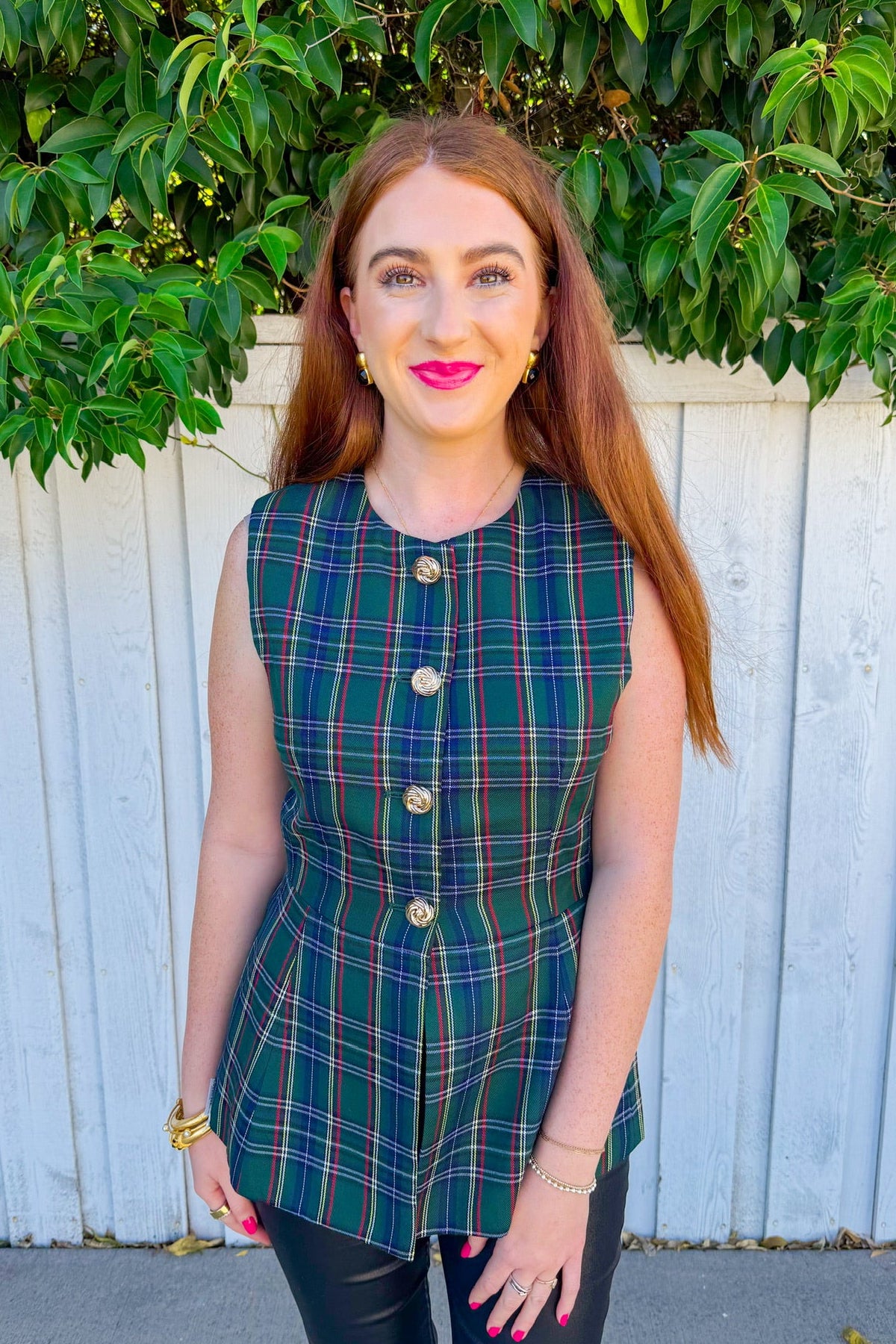 Throw on this green plaid sleeveless vest for instant preppy charm. The crisp button closure keeps things polished while the timeless plaid pattern works with everything in your closet—from casual tees to dressed-up skirts.