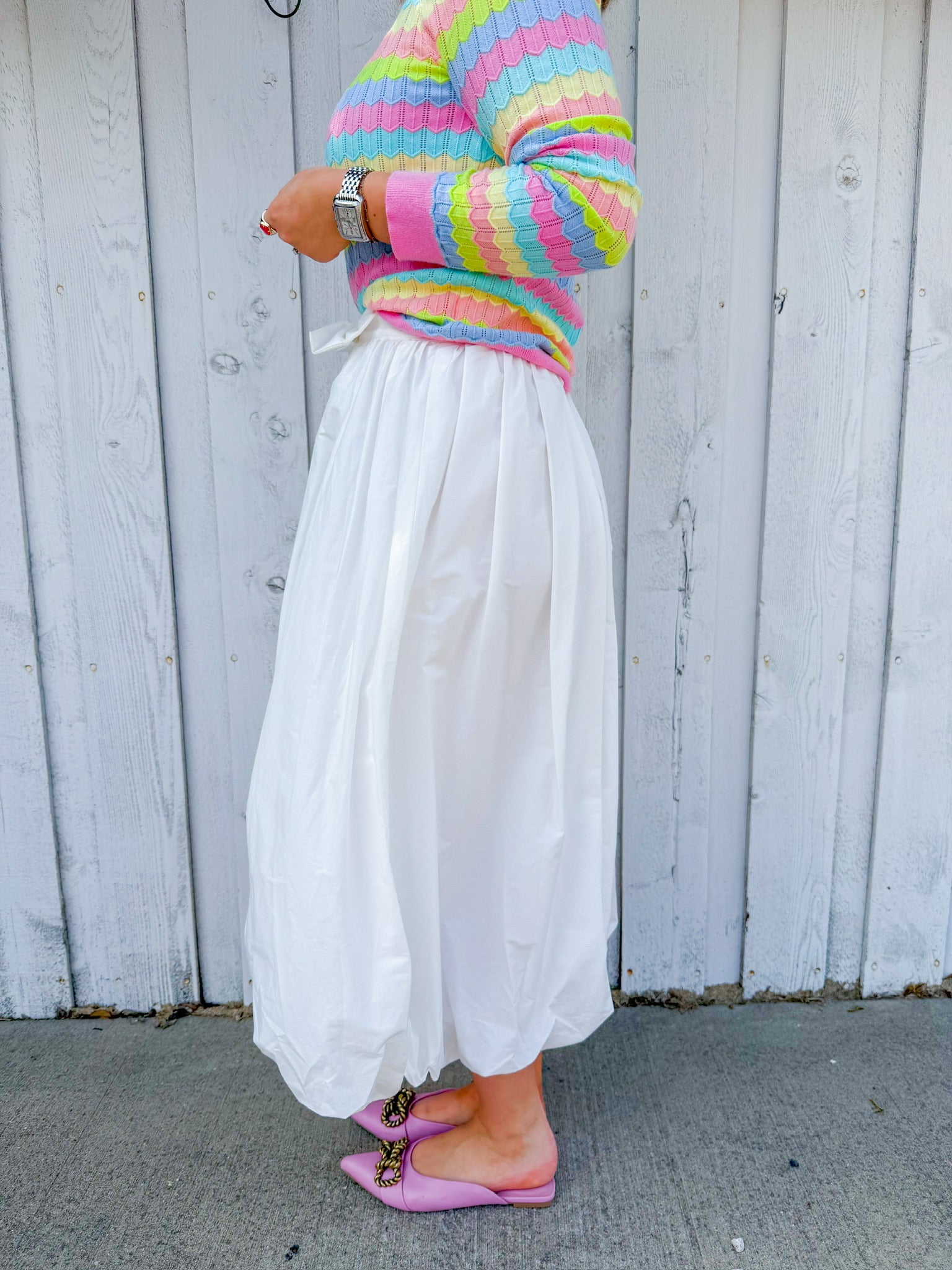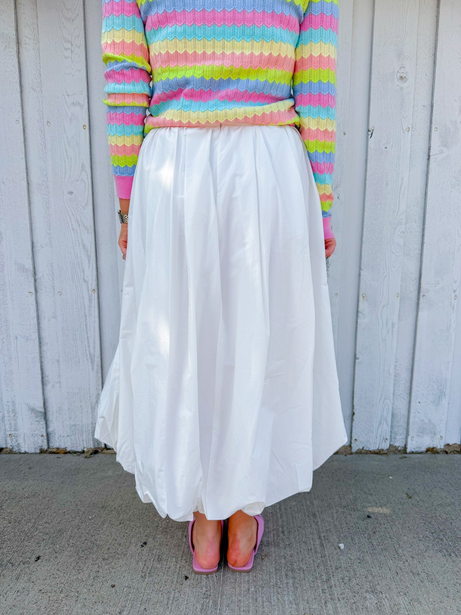 White bubble maxi skirt with a charming front bow detail. The voluminous silhouette creates movement and dimension, while the playful bow adds a touch of whimsy to your everyday look.