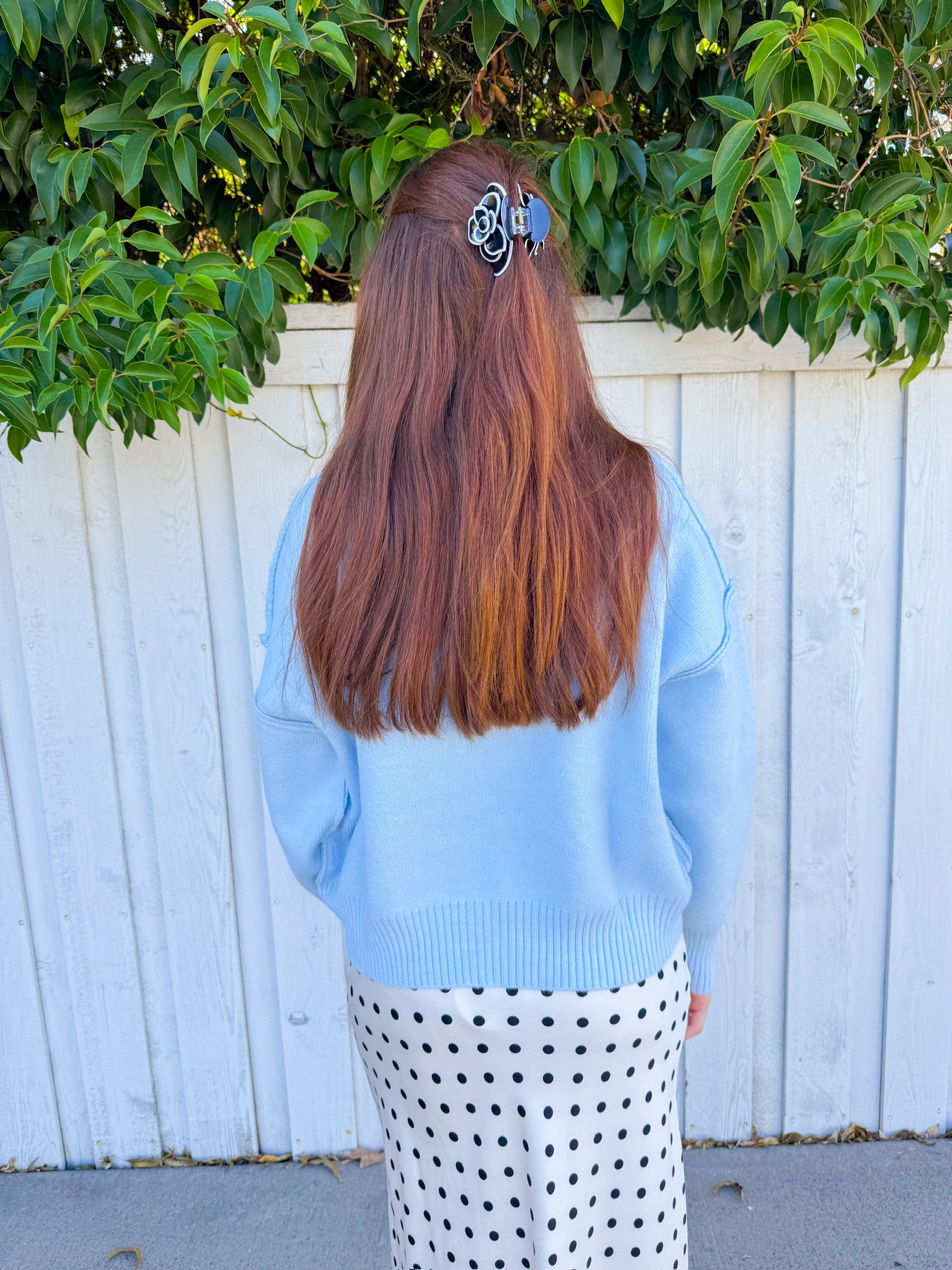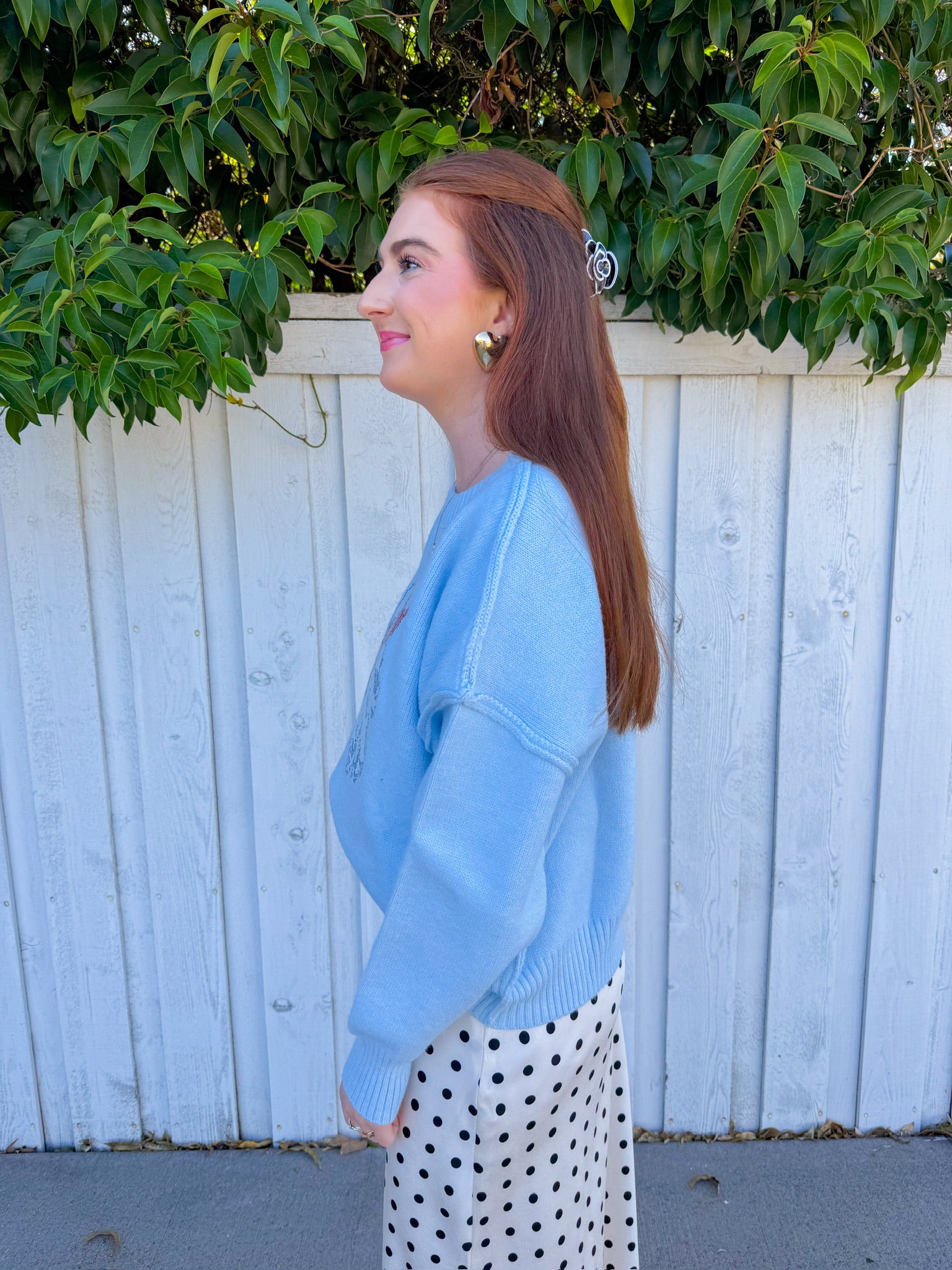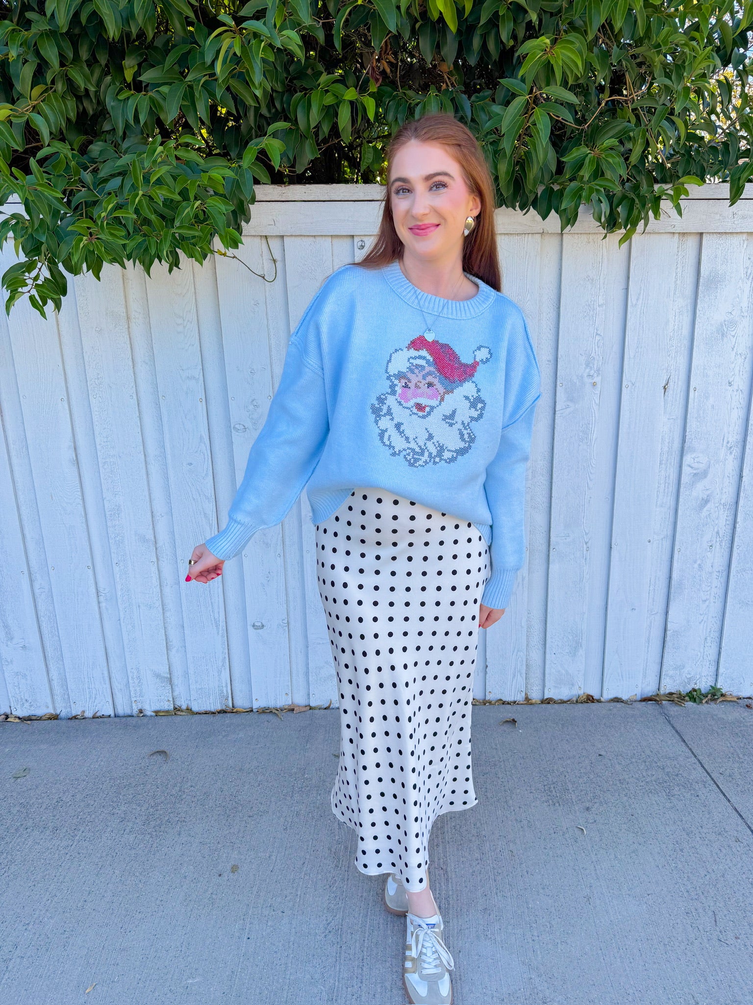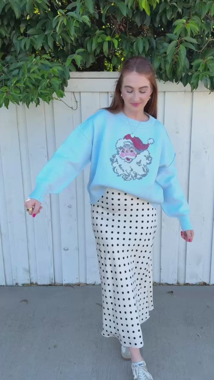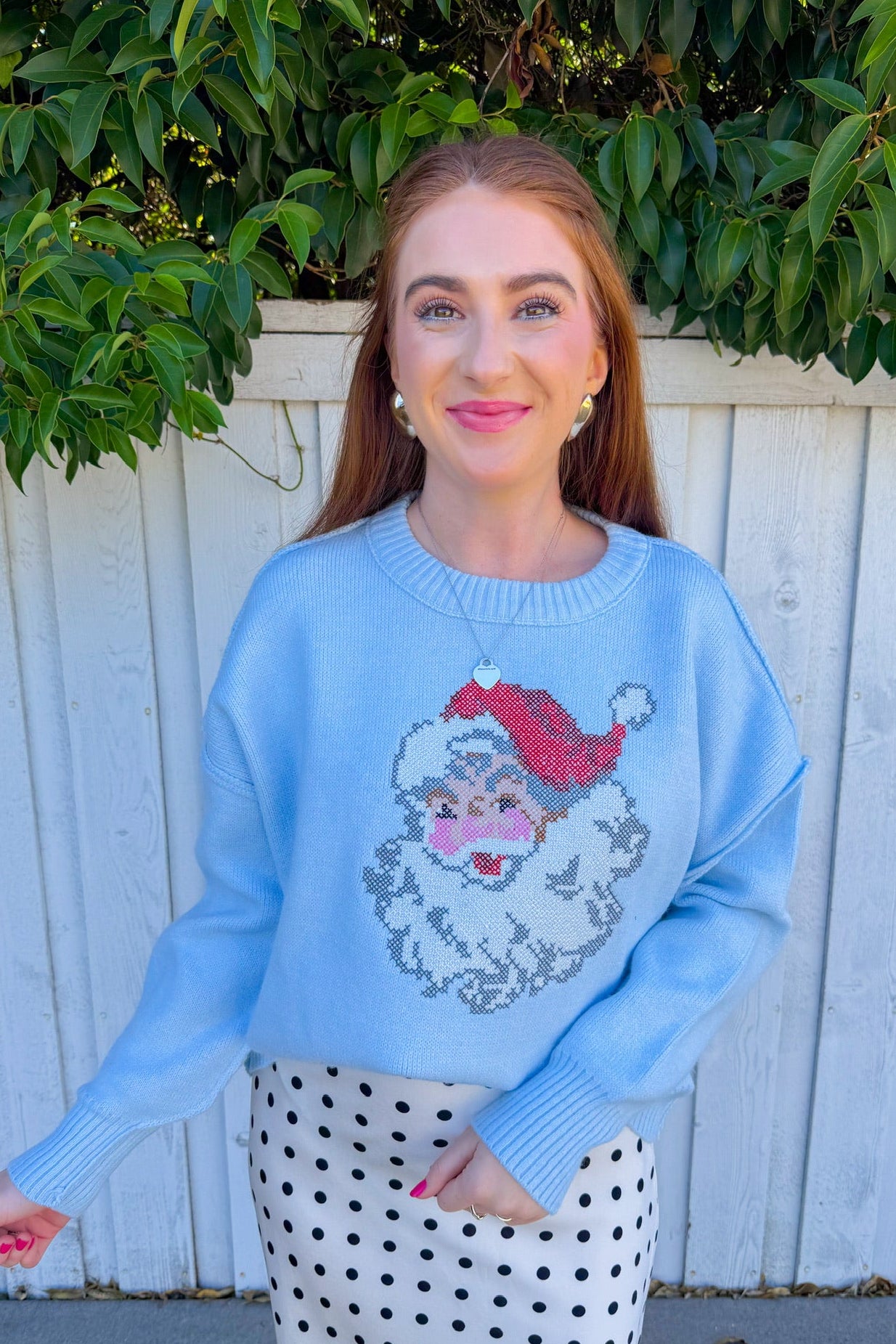 Get into the holiday spirit with this delightfully quirky light blue sweater, complete with a charming cross stitch Santa face emblazoned across the front.