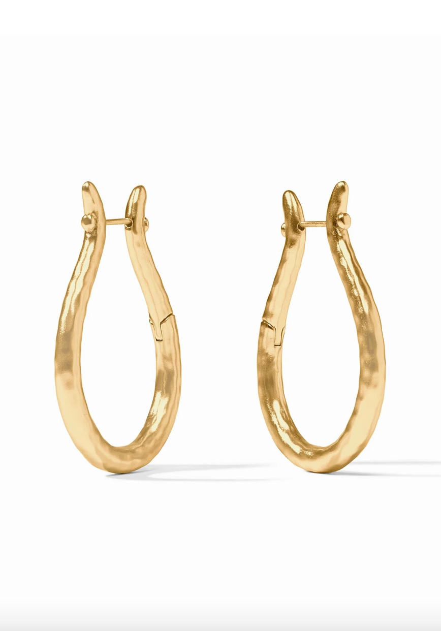 Brimming with timeless equestrian elegance, these lightly hammered golden hoops recall the form of vintage bridle rings.