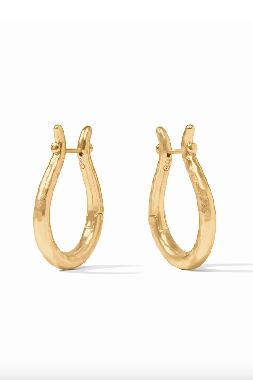 Brimming with timeless equestrian elegance, these lightly hammered golden hoops recall the form of vintage bridle rings.