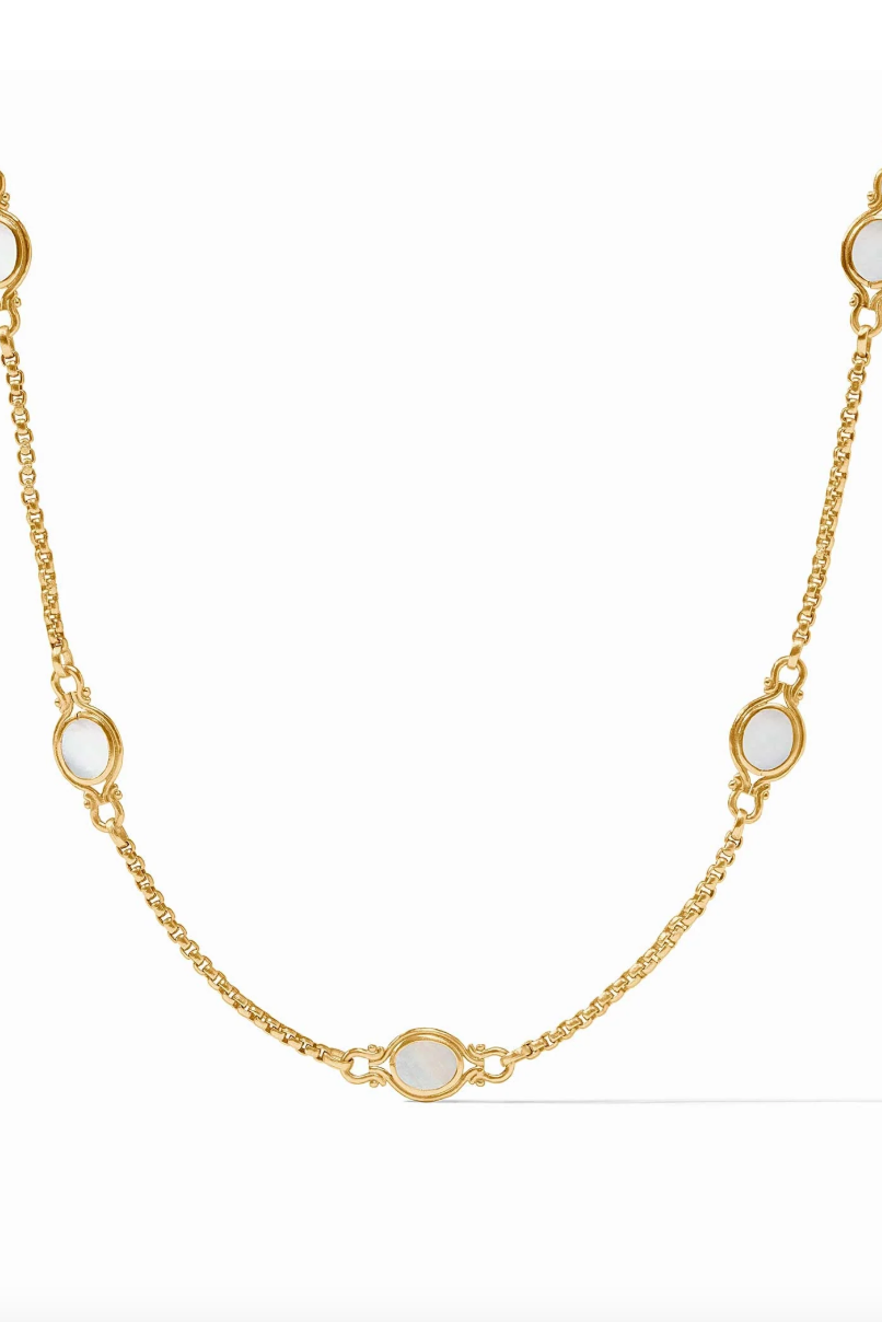 A necklace sparkling with equestrian spirit, featuring twelve glittering gemstones flanked by golden bridle links, each stationed along a delicate Venetian box chain that closes with a yoke-shaped toggle.