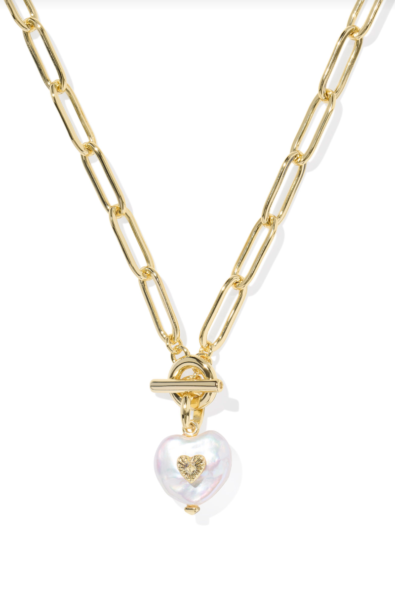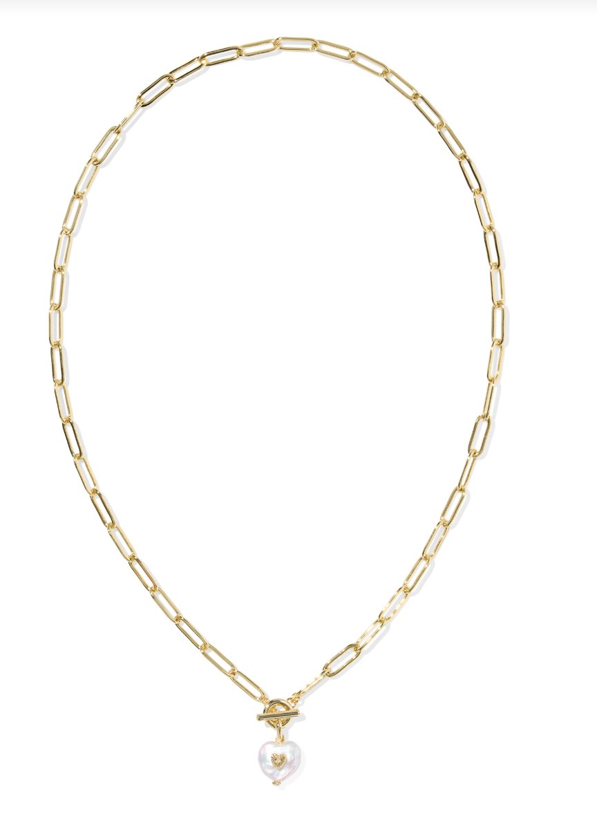 The Sasha Gold Heart Link and Chain Necklace gives pearls a major (and adorable) update. Featuring a heart-shaped freshwater cultured pearl with a metallic beauty mark on a toggle closure paperclip chain, this trend-forward necklace will become a unique and lovely piece for your collection.