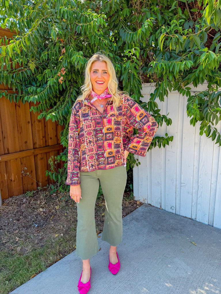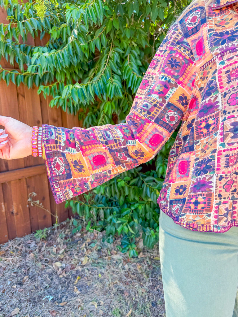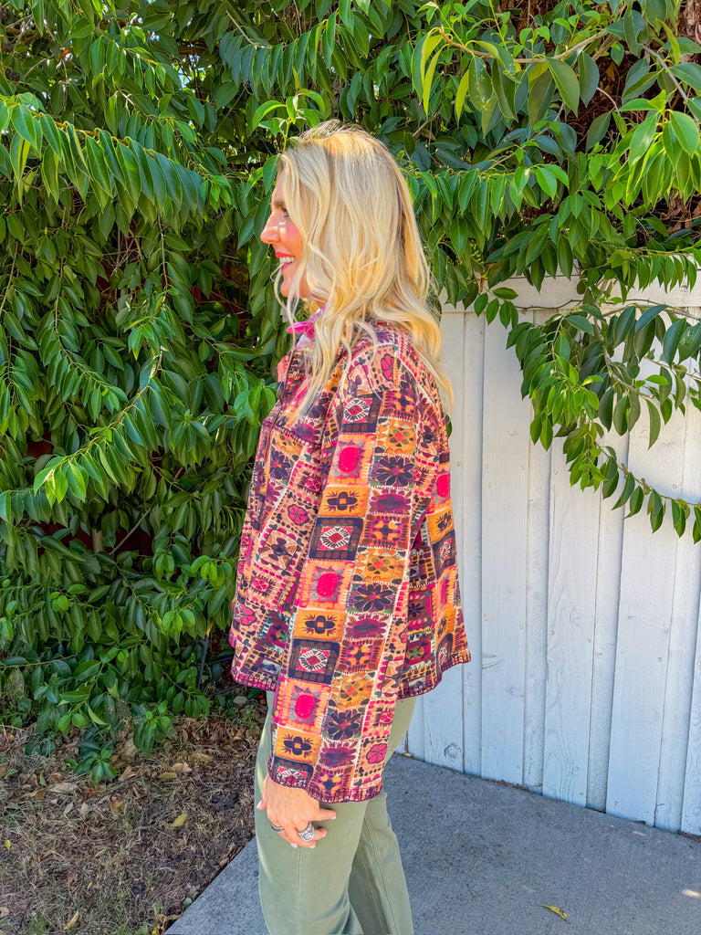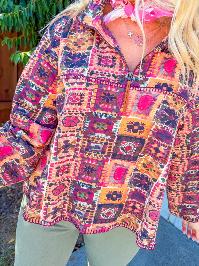 Bring vibrant energy to your wardrobe with the Seasons Change Pullover in Plum. Featuring a playful plum and orange patchwork-inspired print, this jacket stands out with its unique pattern that celebrates the spirit of change.