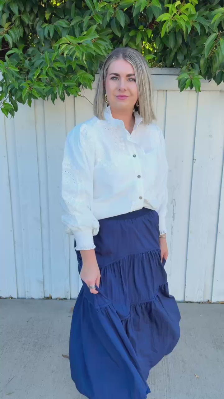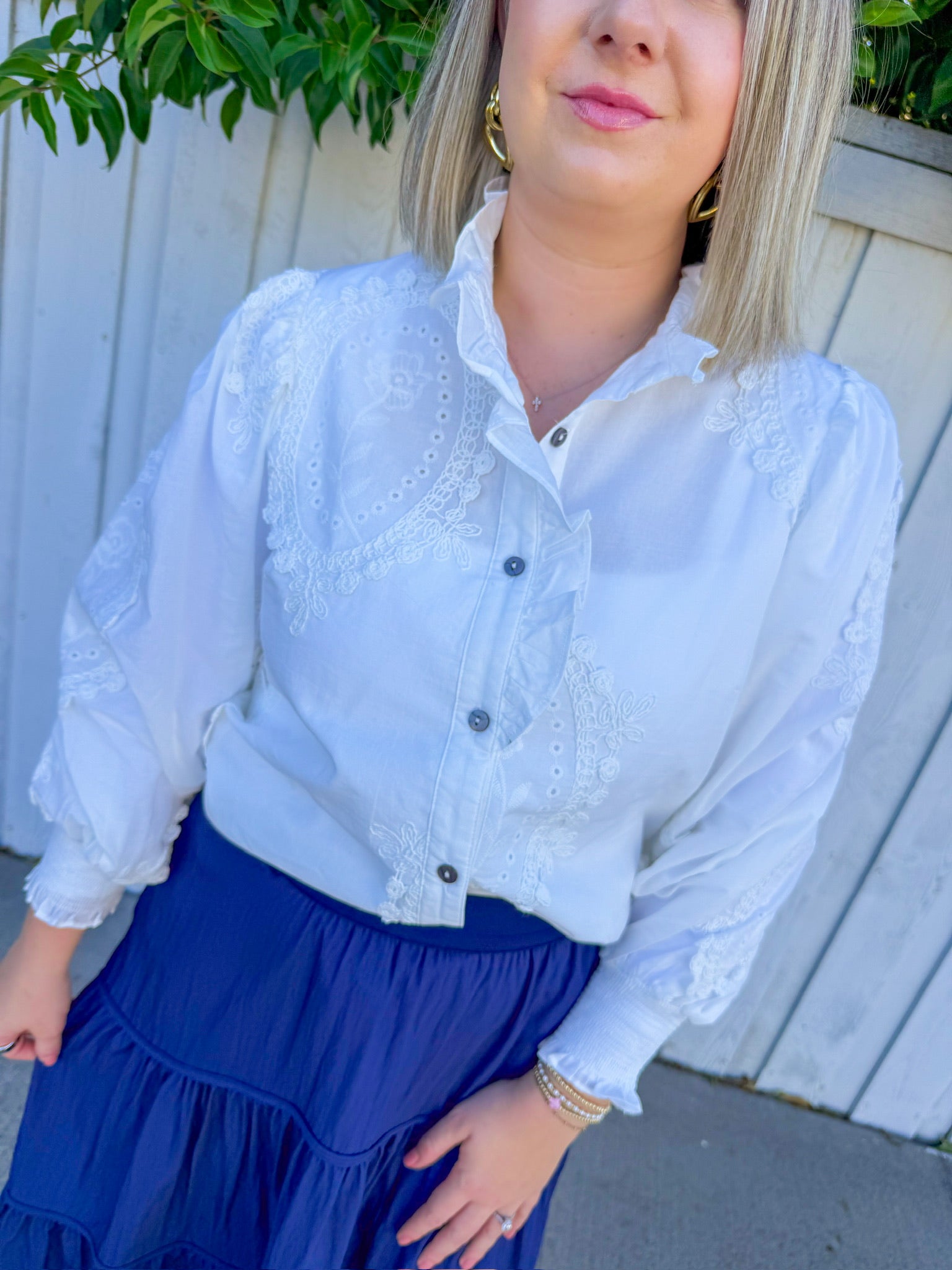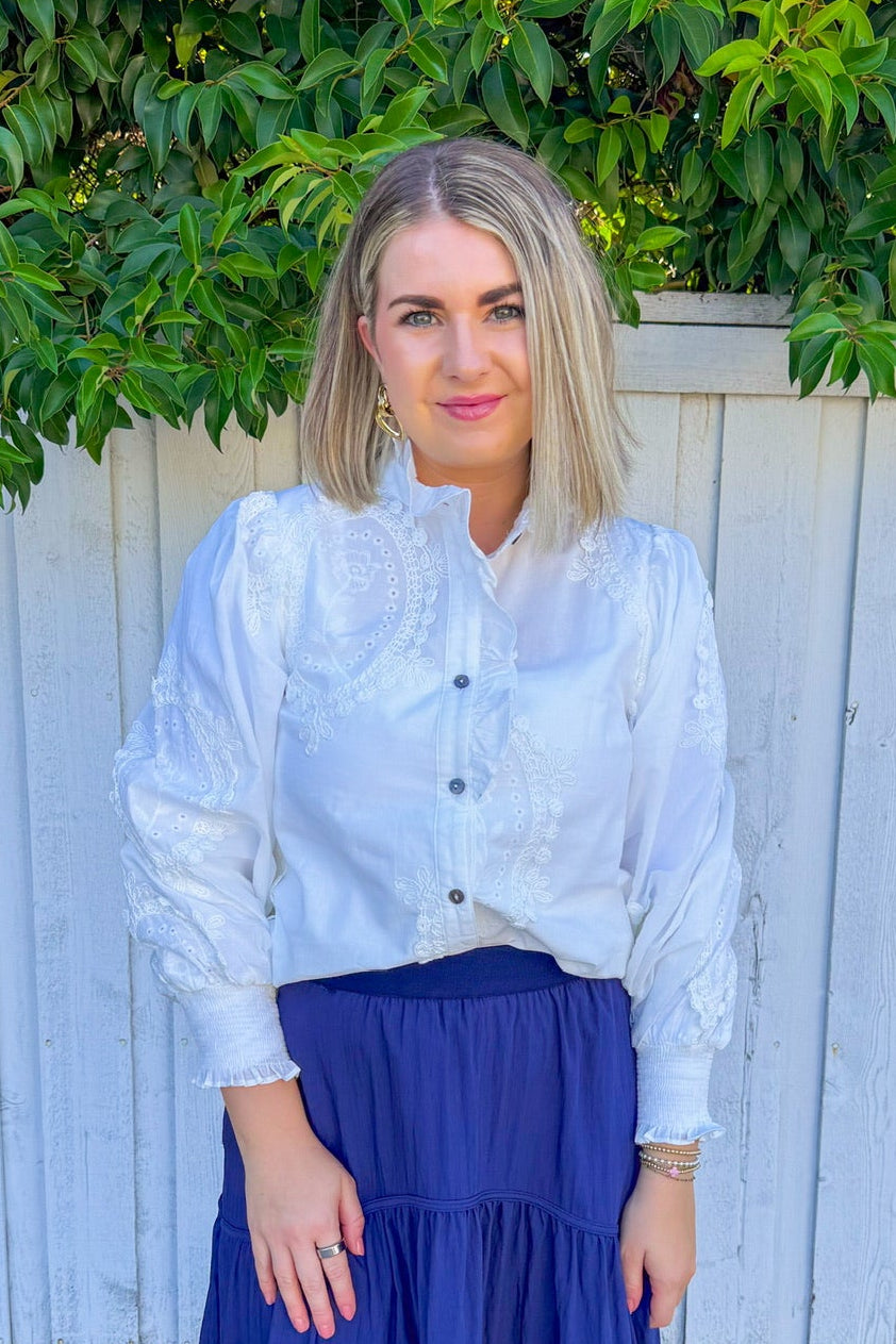 Effortlessly chic and undeniably flirty, this white blouse features delicate eyelet detailing and a front button closure that lets you control the vibe.