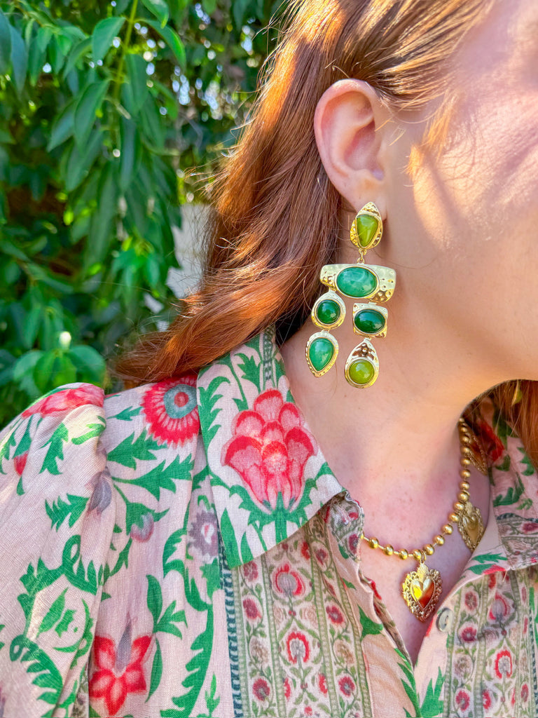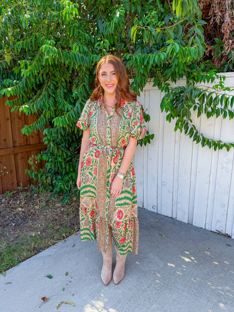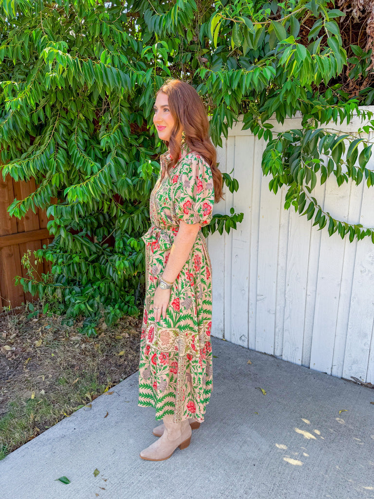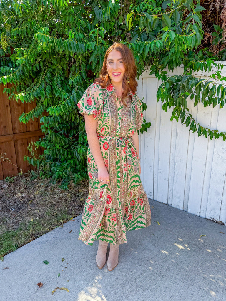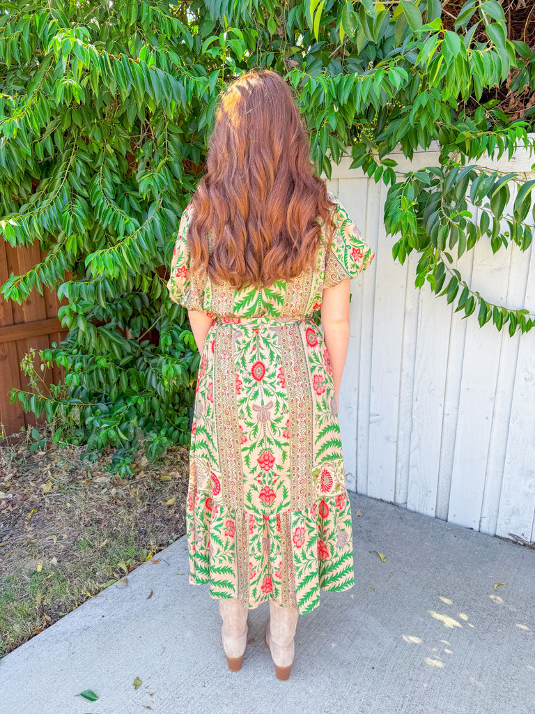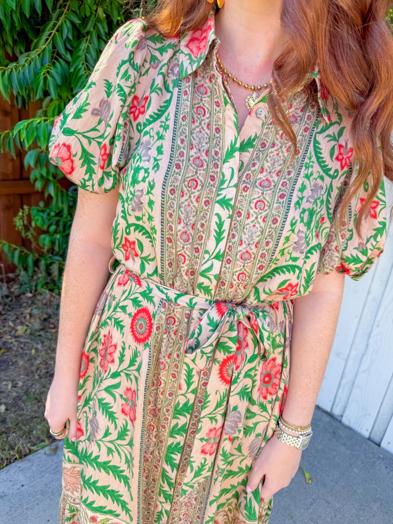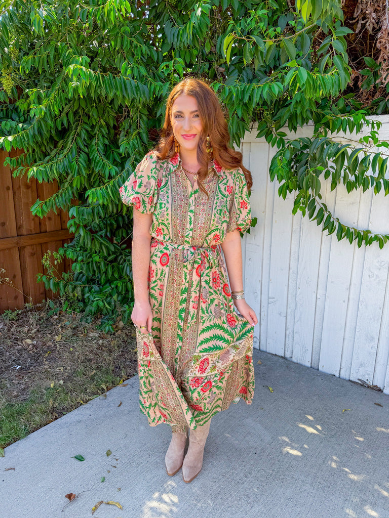 This Simone Maxi Dress in tan brings a playful splash of red and green patterns to brighten your wardrobe.