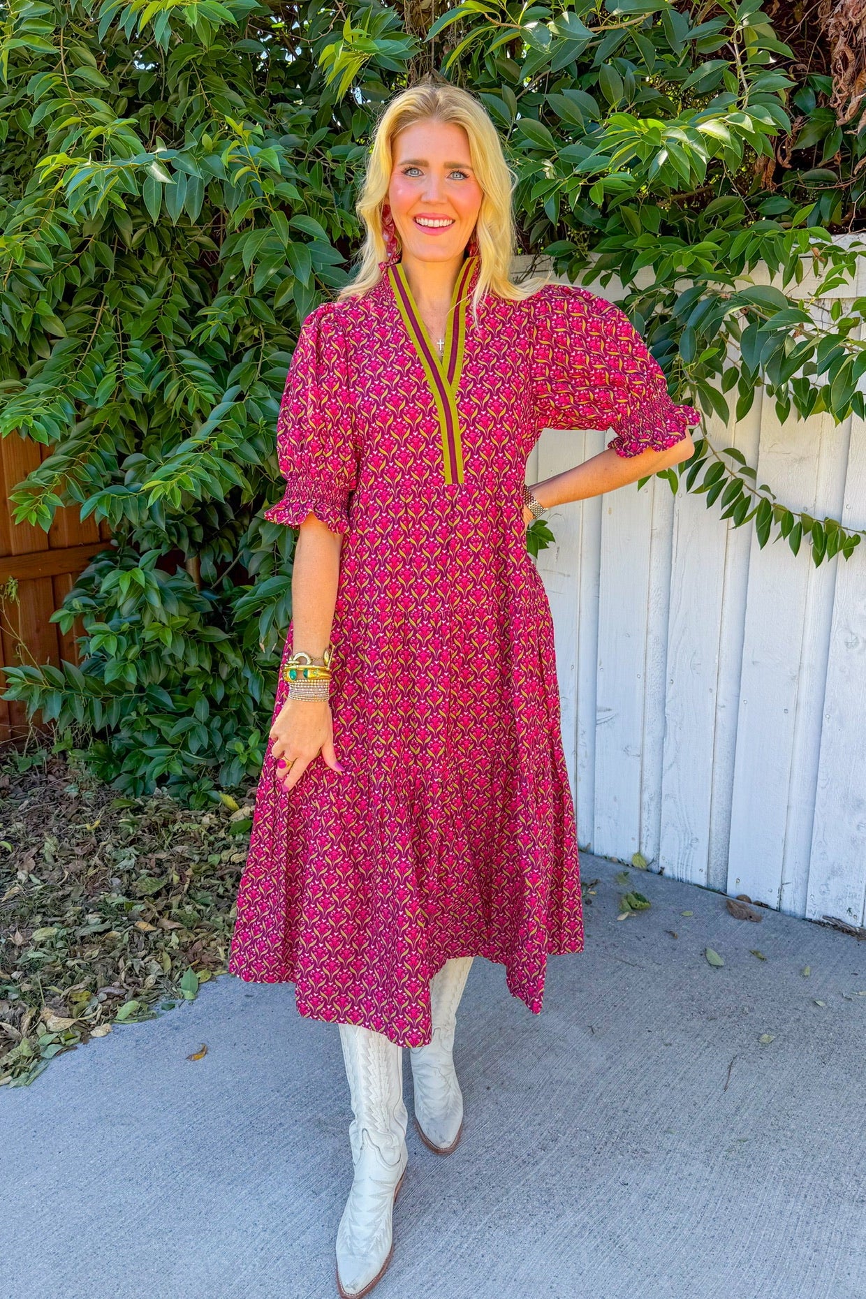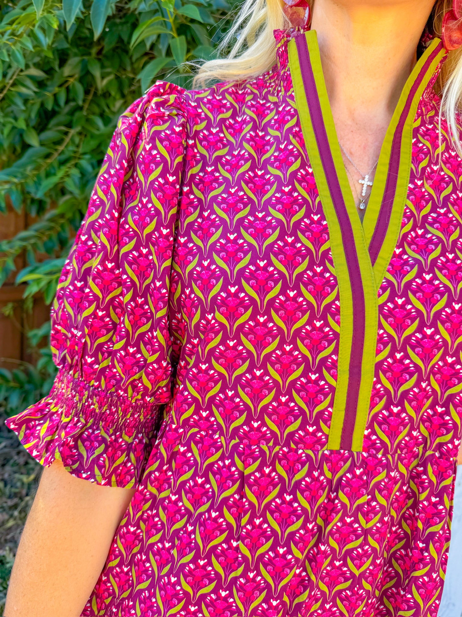 Make a statement in this eye-catching maxi dress featuring a rich wine base with vibrant green stripe trim.