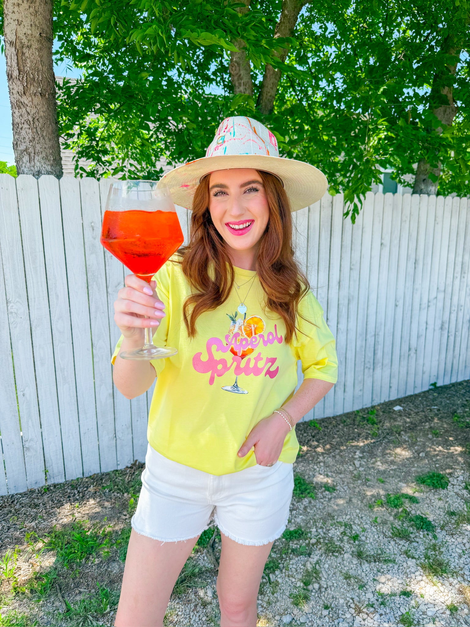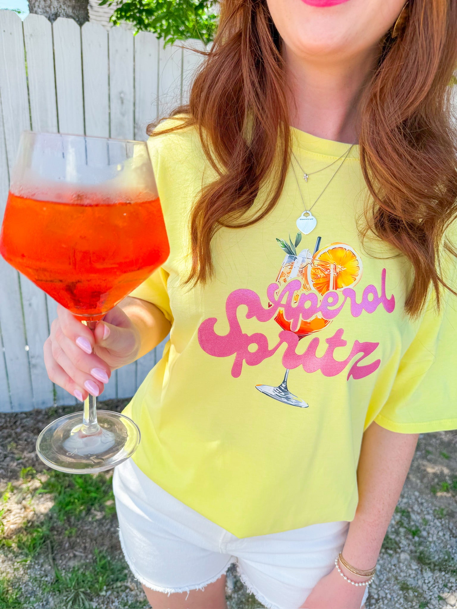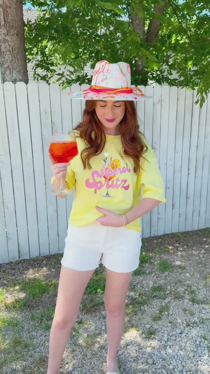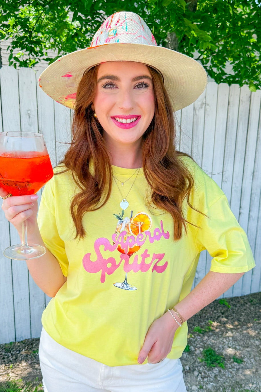 Cheers to sunny days in this buttery yellow Aperol Spritz tee, featuring a retro-inspired graphic that pairs perfectly with denim shorts or your favorite lounge set. It’s a whole vibe for brunch, beach days, or pretending you’re in Italy.