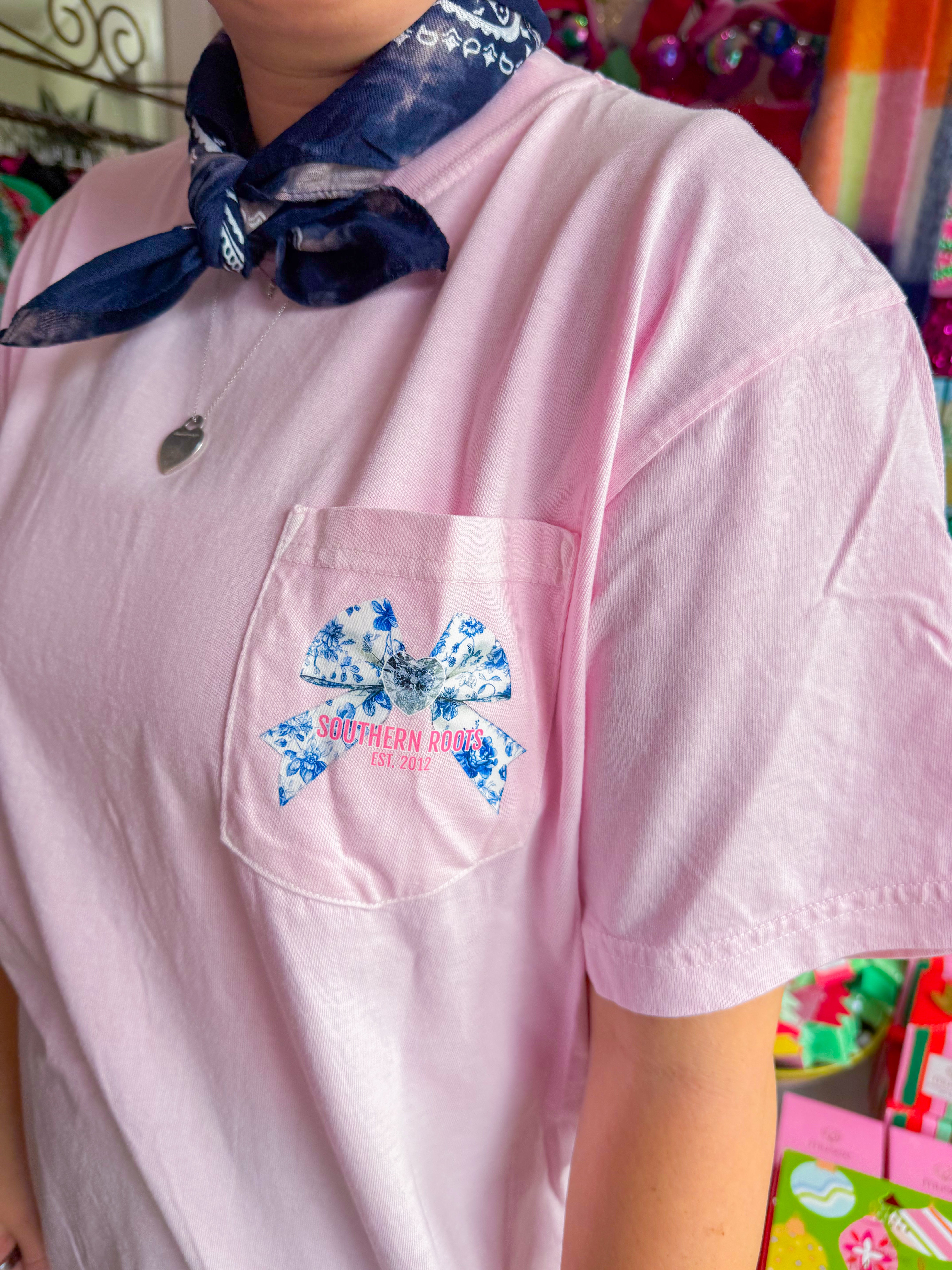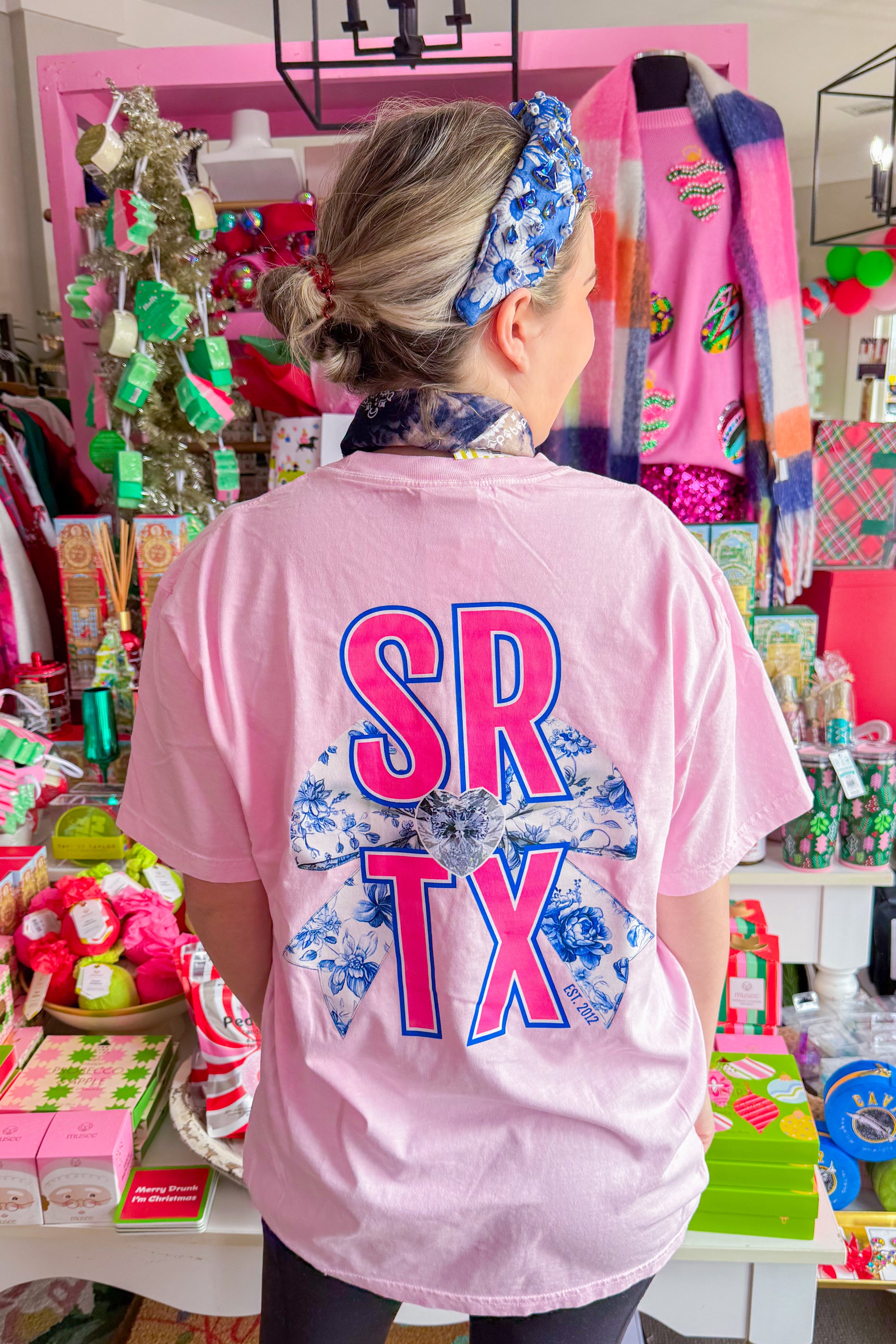Meet the SRTX Bow Tee—your new go-to for effortless Southern charm. This light pink essential features a bow detail, perfect for layering or wearing solo. Crafted for comfort and style, it's the kind of piece that works from coffee runs to weekend getaways. Exclusively yours, only at Southern Roots TX.